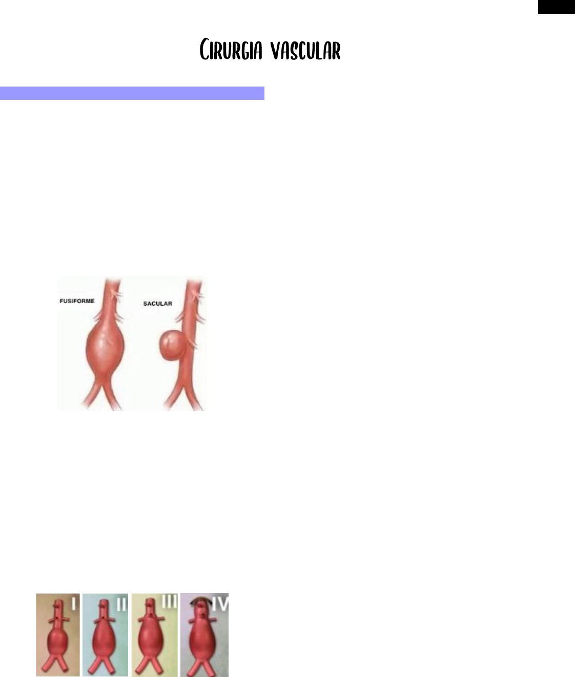 1 Louyse Jerônimo de Morais Aneurisma da aorta abdominal 1. Conceitos gerais • Aneurisma: dilatação > 50% do diâmetro normal do vaso. Se menor que isso, chamamos de ectasia. 2. Classificação 2.1 Anatomia • Fusiforme: é o tipo mais comum de todos. • Saculares: risco de ruptura é maior, porque a pressão dentro dele é maior. 2.2 Verdadeiro vs. pseudo • Verdadeiro: aneurisma que é composto por todas as camadas do vaso. • Pseudoaneurisma: hematoma pulsátil não contido por todas as camadas. 2.3. Etiologia No caso da aorta, o tipo é degenerativo, associado à aterosclerose. Leva-se em consideração a relação do aneurisma com a emergência das artérias renais. • Tipo I: infrarrenais; é o mais comum de todos e apresenta um segmento livre abaixo das artérias renais. Isso é importante, porque para colocar endoprótese, o ideal é haver um colo livre para que ela seja fixada. • Tipo II: justarrenais; imediatamente após a emergência das renais. Nessa situação, não há um “colo” livre. • Tipo III: pararrenais; englobam a emergência das renais. • Tipo IV: toracoabdominais; acima e abaixo da emergência das renais. 3. Fatores de risco • Tabagismo [8:1] • Sexo masculino • Idade avançada, raça branca, história familiar positiva • Hipercolesterolemia, HAS, DPOC O DM não é fator de risco para formação de aneurisma de aorta abdominal. 4. Fatores de proteção • DM, sexo feminino e negros 5. Clínica Geralmente, o paciente vai ser assintomático. O que pode acontecer, vez ou outra, em um exame de abdome de rotina de um paciente mais magro, é a palpação de uma massa pulsátil em linha média. Na maioria dos casos, vai ser um achado. Quando o paciente for sintomático, o que ele apresenta é uma dor abdominal vaga e inespecífica. 6. Diagnóstico • USG: avalia diâmetro transverso e longitudinal. Também usado para rastreio e seguimento. o O grande problema da USG é que ela não avalia a ruptura. • TC/angio-TC: exame mais específico, pois consegue delinear de maneira precisa o aneurisma de aorta abdominal, bem como o diâmetro do lúmen, a relação com vasos renais e ilíacos e a presença de trombos e calcificações. • Angio-RM: ausência de radiação e sem contraste iodado, porém não é tão disponível e não identifica calcificações. Por conta disso, não costuma ser feito na prática. • Arteriografia: muito invasivo; avalia a relação com outros vasos, mas não identifica trombos. Ainda é considerado o padrão-ouro [?]. 7. Seguimento USG • 2,6 a 2,9 cm: repete USG a cada 5 anos. • 3,0 a 3,4 cm: repete USG a cada 3 anos. • 3,5 e 4,4 cm: faz USG anual 2 Louyse Jerônimo de Morais • 4,4 e 5,4 cm: a cada 6 meses. O seguimento é feito para avaliar diâmetro e para ver se está tendo expansão, porque são fatores de risco relacionados à ruptura. Se o aneurisma tiver um diâmetro ≥ 5,5, deve- se parar o seguimento e fazer cirurgia eletiva no paciente, pois nesse caso o risco de ruptura é muito alto. 8. Tratamento clínico • Seguimento USG • Suspender o tabagismo: é considerada a medida mais importante do manejo clínico. • Controle de HAS e da dislipidemia: não se relacionam diretamente com o aneurisma, mas faz o controle para reduzir o risco cardiovascular do paciente, pois isso não diminui a taxa de expansão do aneurisma. 9. Indicações de cirurgia eletiva • Diâmetro maior ou igual a 5,5 cm • Crescimento > 0,5 cm em 6 meses ou > 1 cm em 1 ano. • Sintomático • Complicações: infecção, embolização periférica. • Formação sacular Pode fazer reparo aberto para o paciente, sendo que as complicações que podem acontecer são IAM e IRA. No entanto, o que vem ganhando mais espaço é o reparo endovascular. Sempre que possível, escolhe esse, especialmente em pacientes com muitas comorbidades e risco cirúrgico aumentado, porque o dano cirúrgico é bem menor. Além disso, é necessário que haja uma anatomia favorável [tipo I]. Existem vantagens no pós-operatório imediato, pois o risco de morbimortalidade é muito menor. Quando se pensa em resultados em médio e longo prazo, eles são semelhantes. Então, pode fazer qualquer método, mas no caso da cirurgia aberta, o paciente tem que aguentar. Complicações de reparo endovascular • Sítio de punção: sangramento, hematoma, pseudoaneurisma. • Endoleak: principal causa de falha de um reparo endovascular. Leak, no inglês, significa vazamento. Então, endoleak é o vazamento quando se utiliza a prótese. • Tipo I: falha na vedação proximal [IA] ou distal [IB]. Quando você acopla a endoprótese, tem que fixar embaixo e em cima, se tiver falha de vedação, ocorre vazamento. Esse tipo de endoleak exige tratamento imediato. • Tipo II: é o tipo mais comum e ocorre quando há enchimento retrógrado dos vasos [lombares ou artéria mesentérica inferior]. Chegando na aorta, temos, por exemplo, vasos lombares e artéria mesentérica inferior. Se não tiver muito cuidado, você pode ter enchimento retrógrado. Na cirurgia aberta, faz a ligadura desses vasos, por isso é complicação do tratamento endovascular. Deve tratar se houver dilatação, faz uma embolização. • Tipo III: falha de um componente ou na vedação entre eles. Faz tratamento imediato. • Tipo IV: vazamento pelos poros da prótese. É autolimitado e geralmente se revolve após o fim da anticoagulação. • Tipo V: dilatação na ausência de vazamento visível. Autolimitado e se resolve após o fim da anticoagulação. Tipo I e III, tipo II se tiver dilatação. Tipo IV e V não trata. Ruptura de aneurisma da aorta abdominal 1. Fatores de risco • Tabagismo • Sexo feminino • Diâmetro inicial, crescimento rápido • HAS, transplante renal ou cardíaco, VEF1 reduzido • Aneurisma sacular 2. Clínica • Se conseguir tamponar, o paciente não vai a óbito. • Tríade: massa pulsátil, dor abdominal e hipotensão. Está presente em apenas ⅓ dos casos. 3.