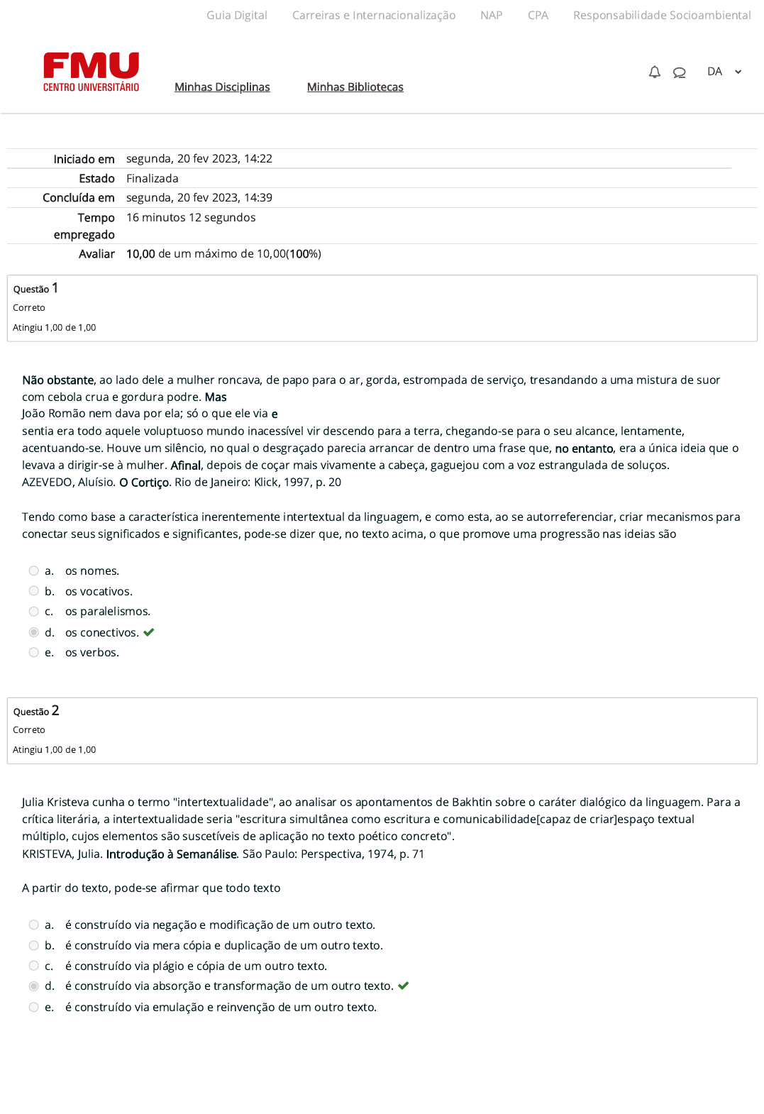 20/02/2023 14:39 Atividade 2 (A2): Revisão da tentativa https://ambienteacademico.com.br/mod/quiz/review.php?attempt=1768344&cmid=771442 1/5 Iniciado em segunda, 20 fev 2023, 14:22 Estado Finalizada Concluída em segunda, 20 fev 2023, 14:39 Tempo empregado 16 minutos 12 segundos Avaliar 10,00 de um máximo de 10,00(100%) Questão 1 Correto Atingiu 1,00 de 1,00 Questão 2 Correto Atingiu 1,00 de 1,00 Não obstante, ao lado dele a mulher roncava, de papo para o ar, gorda, estrompada de serviço, tresandando a uma mistura de suor com cebola crua e gordura podre. Mas João Romão nem dava por ela; só o que ele via e sentia era todo aquele voluptuoso mundo inacessível vir descendo para a terra, chegando-se para o seu alcance, lentamente, acentuando-se. Houve um silêncio, no qual o desgraçado parecia arrancar de dentro uma frase que, no entanto, era a única ideia que o levava a dirigir-se à mulher. A�nal, depois de coçar mais vivamente a cabeça, gaguejou com a voz estrangulada de soluços. AZEVEDO, Aluísio. O Cortiço. Rio de Janeiro: Klick, 1997, p. 20 Tendo como base a característica inerentemente intertextual da linguagem, e como esta, ao se autorreferenciar, criar mecanismos para conectar seus signi�cados e signi�cantes, pode-se dizer que, no texto acima, o que promove uma progressão nas ideias são a. os nomes. b. os vocativos. c. os paralelismos. d. os conectivos. e. os verbos. Julia Kristeva cunha o termo "intertextualidade", ao analisar os apontamentos de Bakhtin sobre o caráter dialógico da linguagem. Para a crítica literária, a intertextualidade seria "escritura simultânea como escritura e comunicabilidade[capaz de criar]espaço textual múltiplo, cujos elementos são suscetíveis de aplicação no texto poético concreto". KRISTEVA, Julia. Introdução à Semanálise. São Paulo: Perspectiva, 1974, p. 71 A partir do texto, pode-se a�rmar que todo texto a. é construído via negação e modi�cação de um outro texto. b. é construído via mera cópia e duplicação de um outro texto. c. é construído via plágio e cópia de um outro texto. d. é construído via absorção e transformação de um outro texto. e. é construído via emulação e reinvenção de um outro texto. Guia Digital Carreiras e Internacionalização NAP CPA Responsabilidade Socioambiental Minhas Disciplinas Minhas Bibliotecas DA https://codely-fmu-content.s3.amazonaws.com/Moodle/GuiaDigital/Guia+digital/index.html https://informa.fmu.br/carreiras/ https://codely-fmu-content.s3.amazonaws.com/Moodle/NAP/inicial/nap/fmu/index.html https://codely-fmu-content.s3.amazonaws.com/Moodle/CPA/landing_CPA/index.html https://portal.fmu.br/sustentabilidade https://ambienteacademico.com.br/ https://ambienteacademico.com.br/ https://ambienteacademico.com.br/course/view.php?id=236 20/02/2023 14:39 Atividade 2 (A2): Revisão da tentativa https://ambienteacademico.com.br/mod/quiz/review.php?attempt=1768344&cmid=771442 2/5 Questão 3 Correto Atingiu 1,00 de 1,00 Questão 4 Correto Atingiu 1,00 de 1,00 O termo intertextualidade foi tão utilizado, definido, carregado de sentidos diferentes que se tornou uma noção ambígua do discurso literário; com frequência, atualmente, dá-se preferência a esses termos metafóricos, que assinalam de uma maneira menos técnica a presença de um texto em outro texto: tessitura, biblioteca, entrelaçamento, incorporação ou simplesmente diálogo. Ele apresenta, no entanto, a vantagem, graças à sua aparente neutralidade, de poder agrupar várias manifestações dos textos literários, de seu entrecruzamento, de sua dependência recíproca. A literatura se escreve certamente numa relação com o mundo, mas também apresenta-se numa relação consigo mesma, com sua história, a história de suas produções, a longa caminhada de suas origens. SAMOYAULT, Tiphaine. Intertextualidade. São Paulo: Hucitec, 2008, p. 9. A Intertextualidade estabelece essa relação entre textos, no qual um texto faz referência à outra, de maneira implícita ou explícita. Como base nisso, é possível dizer que o processo de intertextualidade a. conecta textos e enunciados, resgatando relações semântico-simbólicas. b. interliga enunciados e contextos, traçando conexões simbólicas. c. associa textos entre si, conectando-os por um mesmo campo semântico. d. possibilita melhor compreensão de outros textos a luz de interpretações anteriores. e. resgata signi�cados e/ou signi�cantes, associando novos sentidos à elementos anteriores. . O lobo e o leão Um Lobo, que acabara de roubar uma ovelha, depois de re�etir por um instante, chegou à conclusão que o melhor seria levá-la para longe do curral, para que en�m fosse capaz de servir-se daquela merecida refeição, sem o indesejado risco de ser interrompido por alguém. No entanto, contrariando a sua vontade, seus planos bruscamente mudaram de rumo, quando, no caminho, ele cruzou com um poderoso Leão, que sem muita conversa, de um só bote, lhe tomou a ovelha. O Lobo, contrariado, mas sempre mantendo uma distância segura do seu oponente, disse em tom injuriado, com uma certa dose de ironia: "Você não tem o direito de tomar para si aquilo que por direito me pertence!" O Leão, sentindo-se um tanto ultrajado pela audácia do seu concorrente, olhou em volta, mas como o Lobo estava longe demais e não valia a pena o inconveniente de persegui-lo apenas para lhe dar uma merecida lição, disse com desprezo: "Como pertence a você? Você por acaso a comprou ou, por acaso, terá o pastor lhe dado como presente? Por favor, me diga, como você a conseguiu?" ESOPO. Fábulas completas. São Paulo: Moderna, 1997, p. 122 O texto acima é uma das famosas fábulas de Esopo. A fábula é uma narrativa fantástica na qual animais falam e contam uma narrativa em prol de um valor moral. Ao ler essa fábula sobre o viés da produção de enunciados signi�cativos, pode-se dizer que o diálogo entre o leão e o lobo a. coloca em xeque as rel