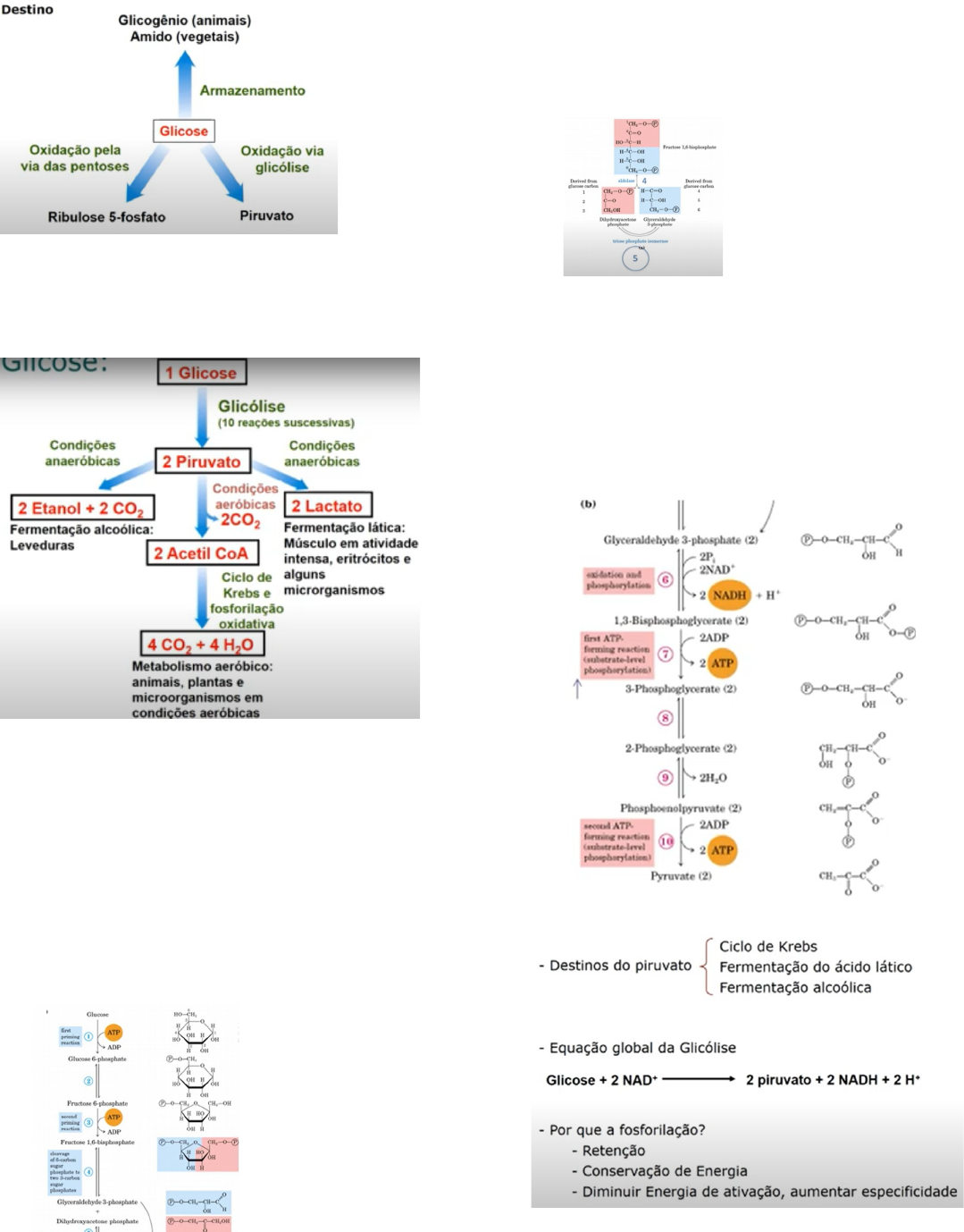 GLICÓLISE METABOLISMO DA GLICOSE · Formada por 10 reações sucessivas e o produto final é o piruvato,o qual, pode ser convertido de acordo com as condições aeróbicas ou anaeróbicas · Glicólise também chamada de via glicolitica pode ser dividida em 2 fases, a preparatória e o pagamento.´ FASE DE PREPARAÇÃO · Gasta energia para realizar essas reações, usa ATP.Ocorre a fosforilação da glicose, por meio de 5 reações. · Da reação 4 para a 5 ocorre a formação de 2 produtos, porém apenas o gliceroldeído 3-fosfato permanece na via glicolitica.Assim,o outro produto,o dihidroxicetona fosfato também é convertido em gliceroldeído 3-fosfato. FASE DE PAGAMENTO · Repor energia perdida na fase de preparação. Forma NADH e ATP (fontes de energia). Ocorre, por meio de 5 reações.Como no final houve a formação de 2 dihidroxicetona ocorre tudo 2 vezes. · A glicose 6-fosfato retém mais energia,conserva mais energia e diminui a energia de ativação. Lembrete:quinase-remete a fosforilação 1 REAÇÃO 2 REAÇÃO · A enzima responsável pelo processo, fosfoglicose isomerase, realiza a isomerização da glicose, convertendo em frutose. Aldeído(glicose) convertido em cetona(frutose). 3 REAÇÃO · Reação irreversível 4 REAÇÃO · A enzima, aldolase,cliva a reação carbono-carbono. · Tinha 1 molécula com 6 carbonos e agora irá ter 2 moléculas com 3 carbonos, dihidroxicetona fosfato e gliceroldeído 3-fosfato. 5 REAÇÃO · A última reação de preparação · Apenas o gliceroldeído 3-fosfato permanece na via glicolitica.Assim, o outro produto,o dihidroxicetona fosfato também é convertido em gliceroldeído 3-fosfato a partir da enzima triose fosfato isomerase,realiza a isomerização. Importante:as 5 reações vistas até então forma de preparação, gastam energia,e gera um delta G negativo. Da 5 até a 10 por ser fase de pagamento, o delta G será positivo,começa a obter energia. 6 REAÇÃO Lembrete: desidrogenase remete a oxidação. · 2 fosfatos ligado aos carbonos do produto final,no 1 e no 3,ou seja 2 carbonos fosforilados. 7 REAÇÃO · Ocorre a primeira formação de ATP · Há 2 carbonos fosforilados,dos 3 existentes.Os fosforilados irão doar grupamento fosfato para o ADP que ao receber o 3 fosfato torna-se ATP. Quinase=transferindo grupo fosfato 8 REAÇÃO · Fosfoglicerato mutase, troca o fosfato de lugar 9 REAÇÃO · Enolase realiza a desitradatação,retira agua da molécula. 10 REAÇÃO. Transformação do produto final,o piruvato. O fosfofenol piruvato possui fofasto na estrutura e tem grande potencial de doa-lo para o ADP que é transformado em ATP. Além disso também ocorre a formação do piruvato,é irreversível(há 3 reações irreversíveis das 10) TABELA SALDO ATP · 2 primeiras-fase de preparação-gasto de energia,a reação 1 e a 3 reação. · 2 ultimas-fase de pagamento-gera energia,a reação 7 e 10. Lembrete:pq vezes 2? Rever 5 reação, começa multiplicar tudo por 2, forma 2 gliceroldeído 3-fosfato. Regulação da glicose Alvos: ATP e intermediários com destinos biossintéticos Escala menor:interação com outras vias - consumo de ATP, - reoxidação do NADH, - regulação alostérica (hexoquinase, fosfofrutoquinase, piruvato quinase) Escala maior: glucagon, insulina, epinefrina e regulação gênica das enzimas Via glicolítica-fase de preparação · Pontos de regulação:1 e 3 reação,as quais,são irreversíveis. Via glicolítica-fase de pagamento · Pontos de regulação:a 10 reação, a irreversível. Conclusão:3 pontos de regulação, sendo que 3 das 4 reações irreversíveis. A 1,3 e 10. · Outros carboidratos podem entrar na via glicólica por meio de vias afluentes.Como demostrado,a frutose e a galactose,por exemplo. · A glicose será fosforilada a glicose 6-fofastoisso participa da via glicolitica. · A lactose é formado pela glicose e galactose, dissacarídeo entra na via por meio de uma via afluente, como demonstrado na imagem.Assim,ela pode entrar na via com a finalidade de gerar energia · Sacarose(frutose+glicose) pode entrar na via glicolitica também. Como já visto anteriores, a hexoquinase também é capaz de fosforilar a frutose que gerará a glicose 6-fofasto.Também há outra via pela enzima frutoquinase. DESTINOS DO PIRUVATO · Em aerobiose: - oxidação em Acetil-CoA - Ciclo do Ácido Cítrico: CO2 e H2O - Reoxidação do NADH (respiração) · Em anaerobiose (hipóxia): - Outras vias de regeneração do NAD+ - Fermentação lática - Fermentação alcoólica · Fermentação: - Utilização de ATP - não consome O2 ou muda concentração de NAD+ FERMENTAÇÃO LÁTICA -Conversão piruvato em lactato(redução) - Redução do piruvato - Tecidos e alguns tipos celulares - Elimina variação líquida em NAD+ ou NADH(ocorre a oxidação) -Realiza a manutenção do NAD+,utilizado como coenzima na via glicolitica. O que ocorre? · 2NAD+,utilizado como coenzima,é reduzido em 2NADH · Em momentos de anaerobiose,não há oxigênio para realizar a fosforilação oxidadativa,assim,a restauração do NAD+ ocorre a partir da redução do piruvato em lactato, utilizando o NADH formando o NAD+,mantendo a via ativa. · - Reciclagem do lactato FERMENTAÇÃO ALCOÓLICA · Fazemos apenas a lática no nosso corpo.Essa é feita por leveduras,porém também com o objetivo de restaurar o NAD+ para que ele seja utilizado na glicólise. A reação: - Piruvato descarboxilase: reação irreversível - Álcool desidrogenase: redução Conclusão: Em ambientes aeróbicos,há o processo de respiração celular-Glicolise,Cliclo de Krebs e Fosforilação Oxidativa Em ambientes anaeróbios glicolise,fermentação,a qual auxilia na manutenção da glicose. 5