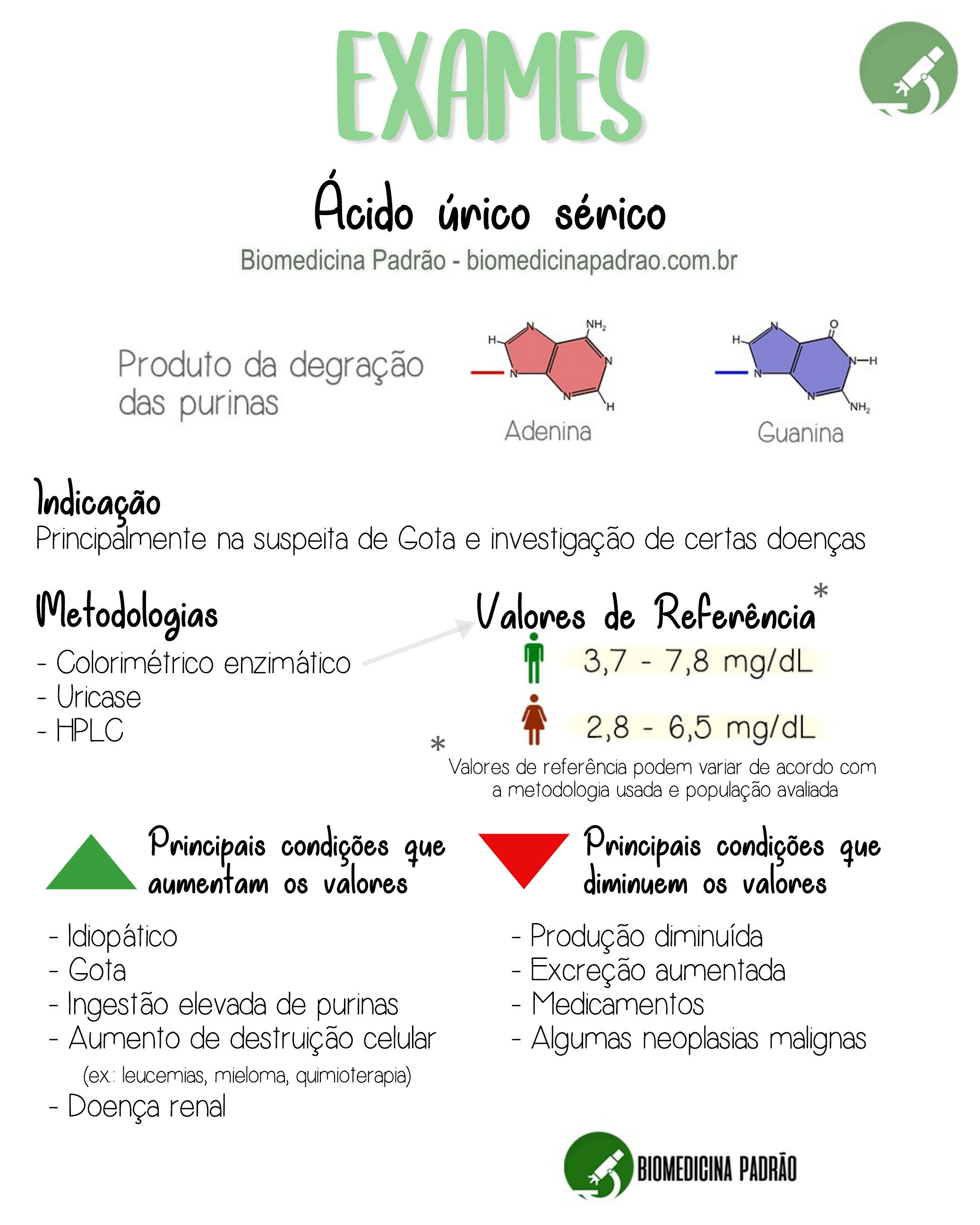 Biomedicina Padrão - biomedicinapadrao.com.br exames Ácido úrico sérico Principalmente na suspeita de Gota e investigação de certas doenças - Idiopático - Gota - Ingestão elevada de purinas - Aumento de destruição celular (ex.: leucemias, mieloma, quimioterapia) - Doença renal - Colorimétrico enzimático - Uricase - HPLC - Produção diminuída - Excreção aumentada - Medicamentos - Algumas neoplasias malignas Valores de referência podem variar de acordo com a metodologia usada e população avaliada Principais condições que aumentam os valores Principais condições que diminuem os valores * * Indicação Metodologias Valores de Referência