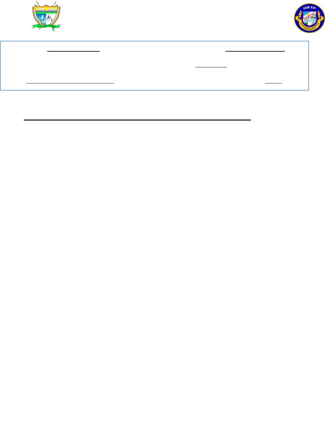 GOVERNO DO ESTADO RORAIMA “Amazônia, Patrimônio dos Brasileiros.” COLÉGIO ESTADUAL MILITARIZADO CÍCERO VIEIRA NETO CEM XVI CADERNO DE PROVA AVALIAÇÃO BIMESTRAL - LÍNGUA PORTUGUESA (50 PONTOS) 01. Fale sobre o Quinhentismo: __________________________________________________________ __________________________________________________________ __________________________________________________________ _________________________________________________________ . 02. Escreva 3 palavras com cada radical: bon---------pat----------------- __________________________________________________________ _________________________________________________________ 03. O que é adjetivo Ɂ __________________________________________________________ __________________________________________________________ __________________________________________________________ _________________________________________________________ 04. Escreva 5 substantivos próprios e 5 substantivos comuns Ɂ _______________________________________________________ __________________________________________________________ __________________________________________________________ __________________________________________________________ 05. Quais os artigos da língua portuguesa Ɂ _______________________________________________________ _______________________________________________________ 06. Qual a primeira literatura produzida no Brasil Ɂ __________________________________________________________ ________________________________________________________ 07. Complete as frases com os adjetivos: João é____________________________________ Professor (a): Ana Rosa Cabral Componente Curricular; Língua Portuguesa Aluno:______________________________________ Período: 11/2022. Etapa: 1º Ano EJA do Ensino Médio Turma: 01 Turno: Vespertino_ Ano Letivo 2022. Os alunos são______________________________________ As crianças são__________________________________________ . 08. O que foi o arcadismo Ɂ __________________________________________________________ __________________________________________________________ __________________________________________________________ _________________________________________________________ 09. Escreva os principais pronomes: ________________________________________________________ __________________________________________________________ __________________________________________________________ __________________________________________________________ 10. Escreva 5 interjeições: ________________________________________________________ __________________________________________________________ __________________________________________________________ __________________________________________________________