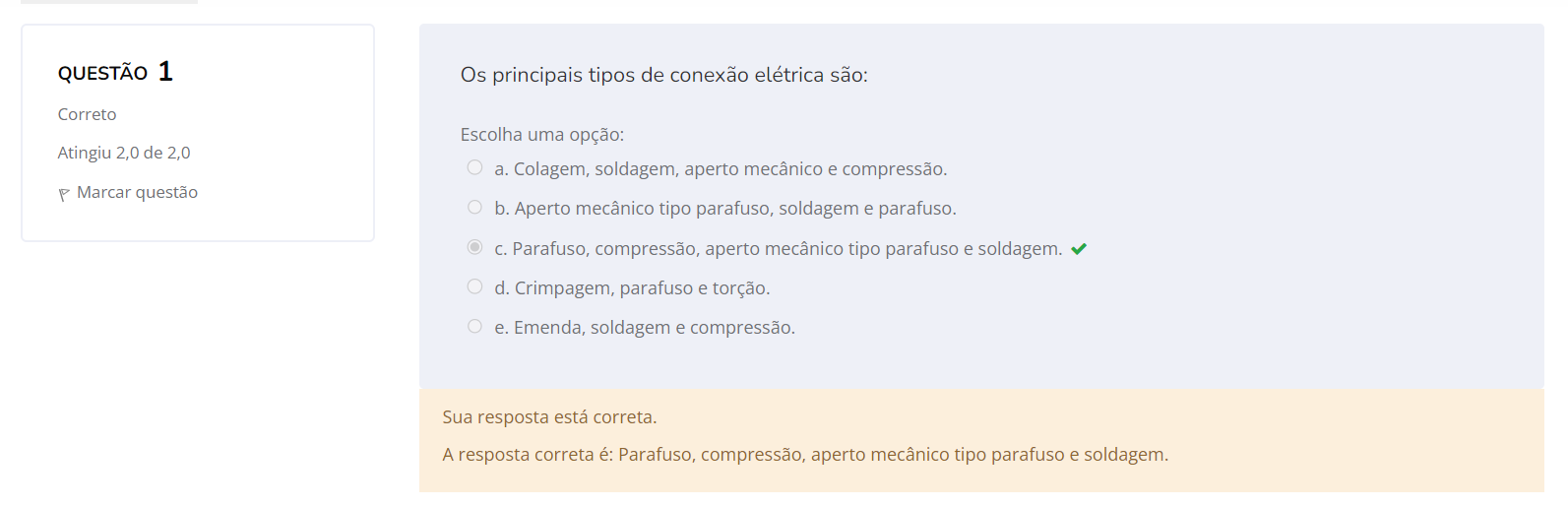 Os principais tipos de conexão elétrica são: Escolha uma opção: a. Colagem, soldagem, aperto mecânico e compressão. b. Aperto mecânico tipo parafuso, soldagem e parafuso. c. Parafuso, compressão, aperto mecânico tipo parafuso e soldagem. d. Crimpagem, parafuso e torção. e. Emenda, soldagem e compressão.