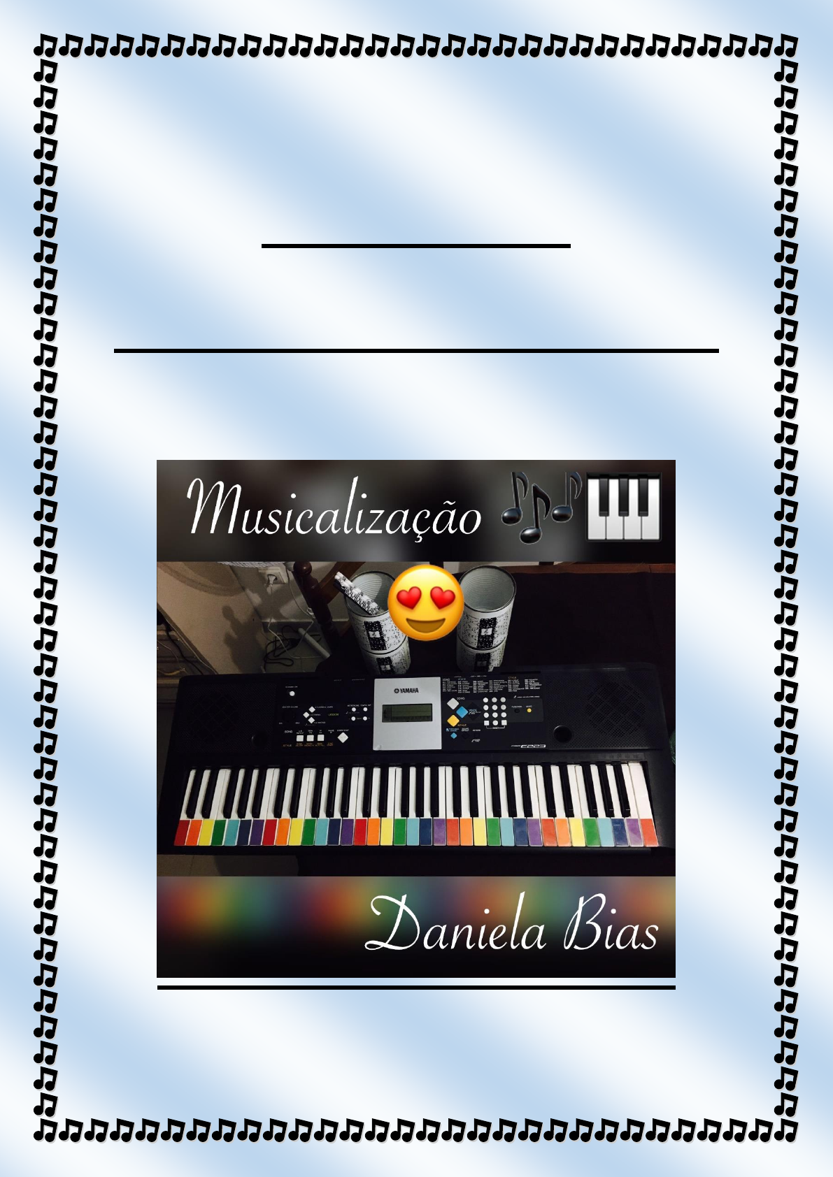 1 Método de Musicalização Infantil (A partir de 03 anos) 2 Musicalização Infantil e Juvenil Esse material foi desenvolvido para ajudar na introdução à Musicalização Infantil a partir de 3 anos, sem fins lucrativos e não pode ser comercializado. “... Por isso te louvarei entre as nações, ó Senhor; cantarei louvores ao teu nome...” II Samuel 22:50 By Daniela Bias 3 PREFÁCIO O desenvolvimento de uma aula de musicalização infantil para crianças a partir de 3 anos tem o objetivo de estimular o exercício sensível e cognitivo, dando brechas para a criatividade. As aulas devem levar em consideração a aplicação de atividades práticas, lúdicas e divertidas que envolva um grupo de crianças com o canto, o movimento corporal, improvisação, brincadeiras e a própria execução musical, as composições que respeitem o desenvolvimento tanto físico quanto mental da criança. Os exercícios praticados podem ser acompanhados de objetos interativos como instrumentos, brinquedos pedagógicos musicais, dado 4 com as cores, bolas, tecidos de texturas diferentes, dentre outros. Mais do que reservar um tempo para a prática dessas atividades indica-se também que seja separado um período para relaxamento e socialização entre as crianças. Os materiais aqui apresentados são para orientação sobre Musicalização Infantil a partir de 3 anos, sem fins lucrativos e não deve ser comercializado. Toda honra e glória ao nosso Deus que é o único digno de todo louvor. “... E saiu uma voz do trono, que dizia: Louvai o nosso Deus, vós, todos os seus servos, e vós que o temeis, assim pequenos como grandes...” Apocalipse 19:05 ´by Daniela Bias 5 SUMÁRIO Introdução Relaxamento Socialização Atividades pedagógicas Musicais  Dado com cores  Tapete pedagógico Musical  Brincadeiras Musicais  Confecção de instrumentos com materiais recicláveis Explorar a ludicidade Explorar a psicomotricidade Explorar a concentração e organização Introduzir instrumentos Objetivos claros e práticos Vamos começar nossa aventura? By Daniela Bias 6 Vamos conhecer as figuras musicais? SEMIBREVE – 4 TEMPOS Completar a pauta com as figuras de semibreve: 7 MÍNIMA – 2 TEMPOS 8 SEMÍNIMA – 1 TEMPO 9 COLCHEIA- ½ TEMPO 10 Vamos conhecer as semicolcheias? VALE ¼ DE TEMPO 11 Vamos colorir as semicolcheias !!! Cada 4 semicolcheias usar uma cor, vamos lá? 12 Descobrimos as figuras, agora vamos conhecer as Pausas? SEMIBREVE MÍNIMA SEMÍNIMA COLCHEIA SEMICOLCHEIA Vamos fazer as pausas? SEMIBREVE 13 Vamos fazer as pausas das Mínimas? 14 Agora chegou a hora de conhecermos a Pausa da Semínima 15 Vamos desenhar as pausas das colcheias? 16 Vamos desenhar a pausa da Semicolcheia? 17 As figuras tem nomes, vamos descobrir? 18 DÓ RÉ MI FÁ SOL LÁ SI DÓ DÓ SI SI LÁ LÁ SOL SOL FÁ FÁ MI MI RÉ RÉ DÓ Escala Ascendente Escala descendente DÓ Desenhe e pinte como o exemplo acima: 19 Desenhe e pinte como exemplo acima: 20 Notas da Linha MI SOL SI RÉ FÁ Notas do Espaço FÁ LÁ DÓ MI By Daniela Bias 21 22 By Daniela Bias 23 Você sabe que nota é essa? Encontre as notas da linha Desenhe as notas que você encontrou e pinte 24 Agora chegou a hora de encontrarmos as notas do espaço, bora lá? Desenhe as notas que você encontrou e pinte 25 Já conhecemos as figuras e pausas, vamos ligar entre si? 26 Para que as notas tenham nome precisamos das Claves, vamos colorir? 27 Vamos desenhar a Clave de Sol 28 Vamos desenhar a clave de fá? 29 Vamos desenhar a fermata !!! 30 Barra de compasso simples, que tal encontrar, desenhar e pintar? 31 Vamos encontrar as barras duplas, desenhe: 32 Barra de retorno, chamado “Ritornelo” Vamos desenhar? 33 Quando quero repetir o mesmo trecho, não preciso copiar duas vezes e sim usar “casas”: 34 SINAIS DE ALTERAÇÃO Desenhe os acidentes nos espaços SUSTENIDO BEMOL BEQUADRO DOBRADO BEMOL DOBRADO SUSTENIDO 35 Vamos conhecer as Fórmulas de Compasso Simples 36 COMPASSO COMPOSTO 2 37 Desenhe as fórmulas em cada pentagrama: 38 Desenhe as fórmulas em cada pentagrama: 39 Colocar nome nas notas e colorir: By Daniela Bias 40 41 CRUZADINHA MUSICAL Vamos colocar os nomes dos instrumentos? 42 Vamos ajudar a encontrar a nota MI 43 Vamos ligar as notas da linha? Colorir SI RÉ FÁ SOL MI 44 Vamos ligar as notas do espaço? DÓ FÁ MI LÁ 45 Qual delas é a nota LÁ? Circule e pinte 46 Matemática Musical Vamos somar os valores das notas? Colorir: 47 Pinte os quadrados correspondente ao valor: 1 2 3 4 1 2 3 4 1 2 3 4 1 2 3 4 48 Vamos praticar as ligaduras LIGADURA DE VALOR Uma linha curva que liga duas notas da mesma altura, une o valor do 1º ao do 2º Copie como exemplo acima: 49 LIGADURA DE PORTAMENTO Uma linha colocada em notas de alturas diferentes, notas ligadas não deve haver interrupção Copie como exemplo acima: 50 LIGADURA DE FRASE Linha curva em um conjuntos de notas, ligadas entre si sem haver interrupção Copie como exemplo acima: 51 Agora já conhecemos um pouquinho de notas musicais, vamos dar nome as notas da Clave de Sol? Colorir: 52 Agora já conhecemos um pouquinho de notas musicais, vamos dar nome as notas da Clave de Fá? Colorir: 53MINHA PRIMEIRA MÚSICA DESCOBRINDO AS SEMIBREVES – 4 TEMPOS 54 DESCOBRINDO AS MÍNIMAS 55 Misturando semibreve e mínima 56 Desafio das mínimas 57 Tudo junto e misturado 58 BRINCANDO COM AS SEMÍNIMAS 59 HINO 441 EU SOU UM CORDEIRINHO (DÓ MAIOR) 60 CONSIDERAÇÕES FINAIS Agradecemos a Deus pela oportunidade de poder servi-lo nessa parte gloriosa que é a Música, contribuindo pela prosperidade da sua obra. Amando a Deus sobre todas as coisas e ao nosso próximo como a nós mesmo. DEUS SEJA LOUVADO!!! Amém By Daniela Bias