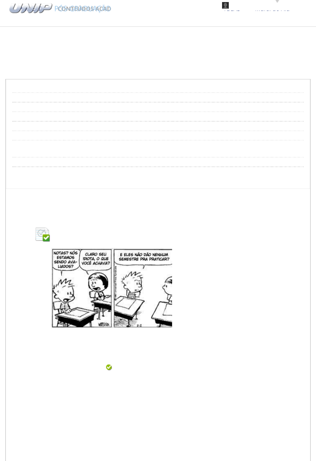 22/02/2023, 21:25 Revisar envio do teste: Questionário Unidade III – ... https://ava.ead.unip.br/webapps/assessment/review/review.jsp?attempt_id=_90381867_1&course_id=_57078_1&content_id=_855079_1&return… 1/11 Revisar envio do teste: Questionário Unidade III Planejamento e Avaliação no Ensino Superior: Um Olhar Sobre o Planejar e Avaliar 13999-40-ED11389_10_02- 202331 Unidade III Usuário Wiliane Marcos de Carvalho Curso Planejamento e Avaliação no Ensino Superior: Um Olhar Sobre o Planejar e Avaliar Teste Questionário Unidade III Iniciado 22/02/23 21:22 Enviado 22/02/23 21:25 Status Completada Resultado da tentativa 0,75 em 0,75 pontos Tempo decorrido 3 minutos Resultados exibidos Todas as respostas, Respostas enviadas, Respostas corretas, Comentários, Perguntas respondidas incorretamente Pergunta 1 Resposta Selecionada: e. Respostas: a. b. c. Os testes padronizados que compõem os sistemas de avaliação são uma forma de avaliação normativa. Veja a tirinha: Disponível em: <https://proafr.�les.wordpress.com/2013/05/b1a2b-calvinescolaparte2.jpg?w=300&h=196>. Acesso em: 20 nov. 2018. Neste sentido, é correto a�rmar que esse tipo de avaliação normativa serve para: Engessar o processo, pois não leva em conta as subjetividades dos alunos. Orientar técnico-metodologicamente, vinculando-se com as teorias da aprendizagem. Constituir objetivos e métodos a favor da avaliação formativa. Ser a única base para a escola/universidade conhecer-se e melhorar suas ações. PÓS EAD COMUNIDADES BIBLIOTECAS Mural do AlunoCONTEÚDOS ACADÊMICOS 0,075 em 0,075 pontos Wiliane Carvalho 3 https://ava.ead.unip.br/webapps/blackboard/execute/courseMain?course_id=_57078_1 https://ava.ead.unip.br/webapps/blackboard/content/listContent.jsp?course_id=_57078_1&content_id=_855067_1&mode=reset https://ava.ead.unip.br/webapps/portal/execute/tabs/tabAction?tab_tab_group_id=_66_1 https://ava.ead.unip.br/webapps/portal/execute/tabs/tabAction?tab_tab_group_id=_69_1 https://ava.ead.unip.br/webapps/portal/execute/tabs/tabAction?tab_tab_group_id=_67_1 https://ava.ead.unip.br/webapps/portal/execute/tabs/tabAction?tab_tab_group_id=_68_1 https://ava.ead.unip.br/webapps/portal/execute/tabs/tabAction?tab_tab_group_id=_70_1 https://ava.ead.unip.br/webapps/login/?action=logout 22/02/2023, 21:25 Revisar envio do teste: Questionário Unidade III – ... https://ava.ead.unip.br/webapps/assessment/review/review.jsp?attempt_id=_90381867_1&course_id=_57078_1&content_id=_855079_1&return… 2/11 d. e. Comentário da resposta: Funcionar como uma avaliação formativa, partindo de metas que devem ser alcançadas. Engessar o processo, pois não leva em conta as subjetividades dos alunos. avaliar, nesse sentido, visa somar notas para classi�car os alunos, simplesmente. Unidade 3: Avaliação no ensino superior, pp. 61 FADESP. Prova. Concurso para Pedagogo. [s.l.], 2018. Pergunta 2 Resposta Selecionada: a. Respostas: a. b. c. d. As práticas de avaliação na Educação Básica revelam concepções diversas sobre a aprendizagem e o desenvolvimento dos alunos. Quando se sustenta na re�exão sobre os sujeitos avaliados e as ações dos avaliadores, a avaliação transforma-se em estratégia pedagógica fundamental, uma vez que possibilita comparar avanços, analisar competências e di�culdades e, como consequência, orientar o planejamento de intervenções que impulsionem o desenvolvimento e a aprendizagem dos alunos. De acordo com essas ideias, qual deve ser a função da avaliação da aprendizagem nas instituições de Educação Básica? Permitir uma prática investigativa que envolva o conhecimento sobre os sujeitos avaliados e revele o comprometimento dos educadores com conquistas e avanços desses sujeitos. Permitir uma prática investigativa que envolva o conhecimento sobre os sujeitos avaliados e revele o comprometimento dos educadores com conquistas e avanços desses sujeitos. Favorecer a utilização de instrumentos de avaliação variados como principal estratégia dos professores para medir a aprendizagem dos alunos. Pressupor uma ação comparativa dos desempenhos dos alunos em relação ao que se espera que todos alcancem. Constituir-se como prática que, na dinâmica das instituições escolares, tem a função de quanti�car o nível de conhecimento adquirido pelos alunos. 0,075 em 0,075 pontos 22/02/2023, 21:25 Revisar envio do teste: Questionário Unidade III – ... https://ava.ead.unip.br/webapps/assessment/review/review.jsp?attempt_id=_90381867_1&course_id=_57078_1&content_id=_855079_1&return… 3/11 e. Comentário da resposta: Desempenhar o papel de prática educativa coletiva, com base em métodos de veri�cação da aprendizagem dos alunos. a ideia é re�etir sobre práticas avaliativas críticas da aprendizagem, porém condutoras de um processo de ensino-aprendizagem de conhecimentos que, simultaneamente, considerem o sujeito que aprende e se volte, da mesma forma, ao compromisso dos professores com as conquistas e com os avanços que os alunos devem manifestar neste processo. A função da avaliação é, dentre outras, ser uma prática avaliativa transformadora de alunos e professores. Unidade 3: Avaliação no ensino superior, p. 57-59 INEP. Prova de Pedagogia do ENADE. [s.l.], 2014. Disponível em: <https://www.aprovaconcursos.com.br/questoes-de- concurso/questoes/disciplina/Pedagogia+%2528ENADE%2529/pagina/4/qu antidade-por-pagina/15>. Acesso em 25 fev. 2019. Pergunta 3 Resposta Selecionada: a. Respostas: a. b. Veja a tirinha que mostra o aluno expondo seu conhecimento e a professora, em seguida, o colocando de castigo, já que ele não respondeu “adequadamente”, de acordo com o que a escola esperava: Disponível em: <http://diariodonordeste.verdesmares.com.br/polopoly_fs/1.1437604!/image/image.gif>. Acesso em: 20 nov. 2018. A mediação entre professores, conteúdos e alunos é uma condição para que a avaliação formativa aconteça. Nessa concepção, a avaliação possui 