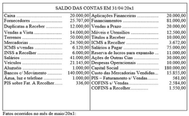 A empresa KLX Ltda apresentou nos meses de abril e maio a seguinte movimentação: 04/05. Compra de mercadorias a prazo de CP Ltda., conforme nota fiscal nº 12.345. no valor de $ 3.000,00. 05/05. Venda de mercadorias a vista conforme nota fiscal nº 2.345, no valor de $ 10.000,00. CMV = $ 5.000,00. 05/05. Depósito no Banco da Praça S.A. no valor de $ 10.000,00. 06/05. Compra de móveis e utensílios da firma ABC Ltda., conforme nota fiscal nº 23.678, no valor de $ 2.000,00. Pagamento com cheque nº 2.301 do Banco da Praça S.A. 10/05. Recebimento de uma duplicata no valor de $ 800,00. 25/05. Pagamento de despesas de telefone do mês com cheque nº 2.303 do Banco da Praça S. A. $ 180,90. 27/05. Pagamento de despesas de água do mês com cheque nº 2.304 do Banco da Praça S. A., $ 155,10. 28/05. Pagamento de despesas com energia elétrica no mês conforme cheque nº 2.305 do Banco da Praça S. A., no valor de $ 207,00. 30/05. Pagamento de despesas com combustíveis referente ao mês de maio, ao Posto Bela Vista Ltda., conforme nota fiscal nº 21.034, no valor de $ 350,00, com cheque nº 2.308 do Banco da Praça S.A. 30/05. Pagamento de despesas de conservação e reparação do pátio da firma, conforme nota fiscal nº 4.506 da firma Limpatudo Ltda., no valor de $ 2.000,00, com cheque nº 2.309 do Banco da Praça S.A. a) organizar o balancete do mês 04/20x1; b) efetuar a contabilização do mês 05/20x1; (lançamentos e razonetes) c) organizar um novo balancete de verificação em 31/05/20x1(seis colunas); CONTAS PATRIMONIAIS D C Caixa 20.000,00 Banco c/ movimento 140.000,00 Duplicatas a receber 12.000,00 Aplicações Financeiras 20.000,00 Mercadorias 24.500,00 Títulos a Receber 10.000,00 Ações de outras CIA 30.000,00 Terrenos 50.000,00 Móveis e utensílios 12.500,00 Veículos 21.145,00 Fornecedores 25.707,00 ICMS a Recolher 3.672,00 COFINS a Recolher 1.550,00 Salários a pagar 75.000,00 INSS a recolher 6.000,00 PIS sob Fat. A Recolher 336,00 Financiamentos 81.000,00 Capital Social 180.000,00 CONTAS DE RESULTADO Despesas Operacionais 10.000,00 Água, luz e telefone 1.000,00 Aluguéis 1.000,00 ICMS s/ vendas 6.120,00 COFINS s/ vendas 2.584,00 PIS – Fat. s/ vendas 561,00 Salários 41.000,00 Custo da mercadoria vendida 15.855,00 Venda à vista 14.000,00 Venda a prazo 20.000,00 Reserva lucro expansão 11.000,00 TOTAL GERAL 418.265,00 418.265,00 Balancete de Verificação CONTAS SALDO 01/04/20X1 a 30/04/20x1 Empresa KLX Ltda 30/04/20x1 LANÇAMENTO DATA Nº Conta HISTÓRICO / CONTAS DÉBITO CRÉDITO 001 04/05/20x1 Caixa 3.000,00R$ Duplicatas a pagar 3.000,00R$ Compra de mercadorias a prazo de CP Ltda., conforme nota fiscal nº 12.345 002 05/05/20x1 Caixa 10.000,00R$ Mercadorias 10.000,00R$ Vendas de Mercadorias 5.000,00R$ Custo das Mercadorias Vendidas 5.000,00R$ Venda de mercadorias a vista conforme nota fiscal nº 2.345 003 05/10/20x1 Bancos c/ Movimento 10.000,00R$ Caixa 10.000,00R$ Depósito no Banco da Praça S.A. no valor de $ 10.000,00 004 06/05/20x1 Móveis e Utensílios 2.000,00R$ Bancos c/ Movimento 2.000,00R$ Compra de móveis e utensílios da firma ABC Ltda., conforme nota fiscal nº 23.678, no valor de $ 2.000,00. Pagamento com cheque nº 2.301 do Banco da Praça S.A. 005 10/05/20x1 Caixa 800,00R$ Duplicatas a Receber 800,00R$ Recebimento de uma duplicata no valor de $ 800,00 006 25/05/20x1 Bancos c/ Movimento 180,90R$ Água, Luz e Telefone 180,90R$ Pagamento de despesas de telefone do mês com cheque nº 2.303 do Banco da Praça S. A. $ 180,90 007 27/05/20x1 Bancos c/ Movimento 155,10R$ Água, Luz e Telefone 155,10R$ Pagamento de despesas de água do mês com cheque nº 2.304 do Banco da Praça S. A., $ 155,10 008 28/05/20x1 Bancos c/ Movimento 207,00R$ Água, Luz e Telefone 207,00R$ Pagamento de despesas com energia elétrica no mês conforme cheque nº 2.305 do Banco da Praça S. A., no valor de $ 207,00 LIVRO DIÁRIO 01/05/20X1 a 31/05/20X1 Empresa KLX Ltda LANÇAMENTO DATA Nº Conta HISTÓRICO / CONTAS DÉBITO CRÉDITO LIVRO DIÁRIO 01/05/20X1 a 31/05/20X1 Empresa KLX Ltda 009 30/05/20x1 Bancos c/ Movimento 350,00R$ Despesas Operacionais 350,00R$ Pagamento de despesas com combustíveis referente ao mês de maio, ao Posto Bela Vista Ltda., conforme nota fiscal nº 21.034, no valor de $ 350,00, com cheque nº 2.308 do Banco da Praça S.A. 010 30/05/20x1 Bancos c/ Movimento 2.000,00R$ Despesas Operacionais 2.000,00R$ Pagamento de despesas de conservação e reparação do pátio da firma, conforme nota fiscal nº 4.506 da firma Limpatudo Ltda., no valor de $ 2.000,00, com cheque nº 2.309 do Banco da Praça S.A Conta: Caixa DATA HISTÓRICO DÉBITO CRÉDITO SALDOS 30/04/20x1 Saldo Anterior 20.000,00R$ 20.000,00R$ D 04/05/20x1 Compra de mercadorias a prazo de CP Ltda., conforme nota fiscal nº 12.345 3.000,00R$ 23.000,00R$ D 05/05/20x1 Venda de mercadorias a vista conforme nota fiscal nº 2.345 10.000,00R$ 33.000,00R$ D 05/05/20x1 Depósito no Banco da Praça S.A. no valor de $ 10.000,00 10.000,00R$ 23.000,00R$ D 10/05/20x1 Recebimento de uma duplicata no valor de $ 800,00 800,00R$ 23.800,00R$ D 31/05/20x1 Saldo Atual 23.800,00R$ D Conta: Bancos c/ Movimento DATA HISTÓRICO DÉBITO CRÉDITO SALDOS 30/04/20x1 Saldo Anterior 140.000,00R$ 140.000,00R$ D 05/05/20x1 Depósito no Banco da Praça S.A. no valor de $ 10.000,00 10.000,00R$ 150.000,00R$ D 06/05/20x1 Compra de móveis e utensílios da firma ABC Ltda., conforme nota fiscal nº 23.678, no valor de $ 2.000,00. Pagamento com cheque nº 2.301 do Banco da Praça S.A. 2.000,00R$ 148.000,00R$ D 25/05/20x1 Pagamento de despesas de telefone do mês com cheque nº 2.303 do Banco da Praça S.A. $ 180,90 180,90R$ 147.819,10R$ D 27/05/20x1 Pagamento de despesas de água do mês com cheque nº 2.304 do Banco da Praça S.A., $ 155,10 155,10R$ 139.844,90R$ D 28/05/20x1 Pagamento de despesas com energia elétrica no mês conforme cheque nº 2.305 do Banco da Praça S. A., no valor de $ 207,00 207,00R$ 149.793,00R$ D 30/05/20x1 Pagam