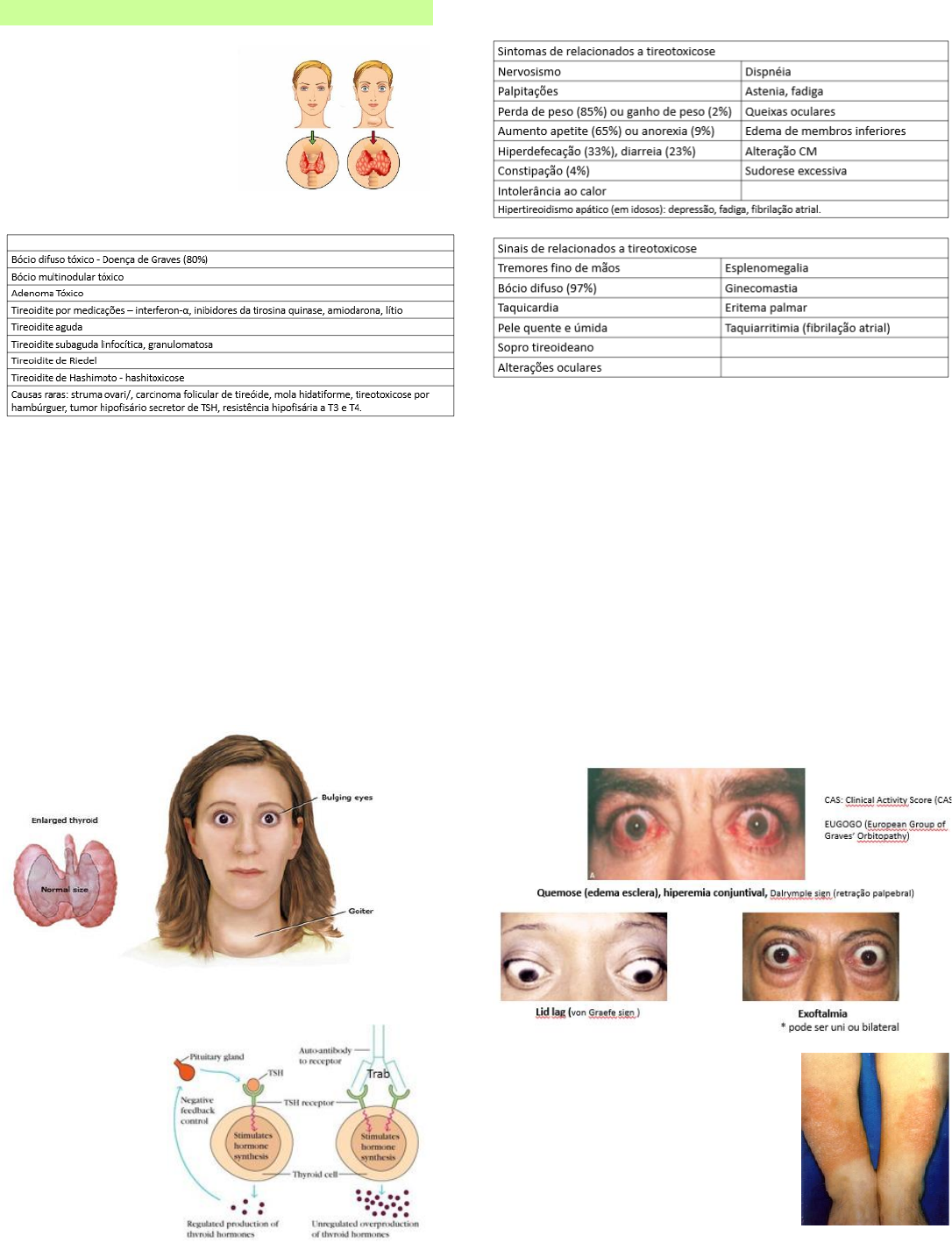 @bene.med DOENÇA DE GRAVES Tireotoxicose é uma síndrome clinica que resulta da exposição dos tecidos a altos níveis de hormônios tireoidianos circulantes. A principal etiologia é o hipertireoidismo. → Tireoidite pós-parto é uma tireoidite linfocítica relacionado ao anti-TPO. Indolor, autolimitado, pode só acompanhar. → Período em lactação não pode fazer cintilografia. → Nódulos hipercaptantes (quentes) não faz PAAF. EPIDEMIOLOGIA: mais frequente nas mulheres, 30-50 anos de idade. Tabagismo é fator precipitante e complicador. FISIOPATOLOGIA: relacionado com suscetibilidade genética e fatores ambientais. Autoanticorpo contra receptor de TSH estimulante (TRAB) presente em 90-100% dos casos. Se liga na tireoide, causando bócio difuso, estimulando mesmo na ausência de TSH. MANIFESTAÇÕES: Doença ocular da tireoide presente em 50% dos casos, incide mais em > 40-50 anos de idade. É autolimitada, de 1-3 anos e recorre em 10%. → TRAB se liga nos fibroblastos orbitários, ocasionando aumento da espessura dos musculo periorbitários e deposição de glicosaminoglicanos. → Tabagismo é fator de piora. → Dor retrocular, dor a movimentação, sinais de inflamação, sinal de lidlag, exoftalmia. 3 ou + sinais/sintomas mostra doença ocular em atividade. → Ver intensidade. Dermatopatia (mixedema pré- tibial): 5-10% dos casos, ocorre por deposito de glicosaminoglicanos localizados na região pré-tibial. Relacionado com oftalmia e titulo elevados de TRAB. EXAMES LABORATORIAIS: é comum leucopenia, hipercalciuria e hipercalcemia ocasionais (aumento da reabsorção óssea), elevação de @bene.med transaminases e hiperbilirrubinemia (nos mais graves). Redução do colesterol total e LDL-c. DIAGNÓSTICO: → TSH, T4 livre, pedir T3 total. → Presença de bócio difuso toxico, oftalmopatia ou dermopatia confirma o quadro como doença de graves. Pede TRAB confirma também. → Geralmente T3T/T4T é 20:1. Pode ocorrer hipertireoidismo somente às custas de aumento de T3T. TRATAMENTO DA DOENÇA OCULAR É o próprio tratamento do hipertireoidismo, deixando o paciente em eutireoidismo. → Leve: colírios, dormir com ajuda do fechamento do olho. Podem se beneficiar de suplementação de selênio por 6 semanas (evita progressão). Usa em geral 100microgramas 2x ao dia por 6 meses. Avalia em 3 meses se melhorou, mantem ou retira. → Moderado-severo: glicocorticoide (metilpredsolona) semanal IV por 12 semanas. Encaminha pro oftalmologista. TRATAMENTO DA DOENÇA DE GRAVES Depende do paciente. → Drogas anti-tireoidianas (DAT): 1ª escolha é o metimazol (MMZ), mantendo a menor dose recomendada. PTU 50-150mg 3x ao dia (crises tireotóxicas). Bloqueia também a conversa de T4 em T3, é mais rápida e age em mais situações. Pode ser pra sempre. Efeitos adversos incluem prurido, rash, hepatotoxicidade. Antes de começar o tto pede hemograma (leucopenia) e transaminases. Repete dose em 2-4 semanas e avaliar T3/T4 pra ver o eutireoismo, vai reduzindo até conseguir tirar. → Radioiodoterapia: existe chance de piorar ou induzir oftalmopatia, não usa pra pcte com doença ocular moderada-grave. Contraindicada em gestante, lactente. Faz dano celular por emissão de radiação beta com dose fixa ou calculada. Objetivo é atingir hipotireoidismo → Tireoidectomia total: o preparo exige eutireoidismo, usa DAT por 1-3 meses. Quando urgente, faz preparo de 5-10 dias antes da cirúrgica.