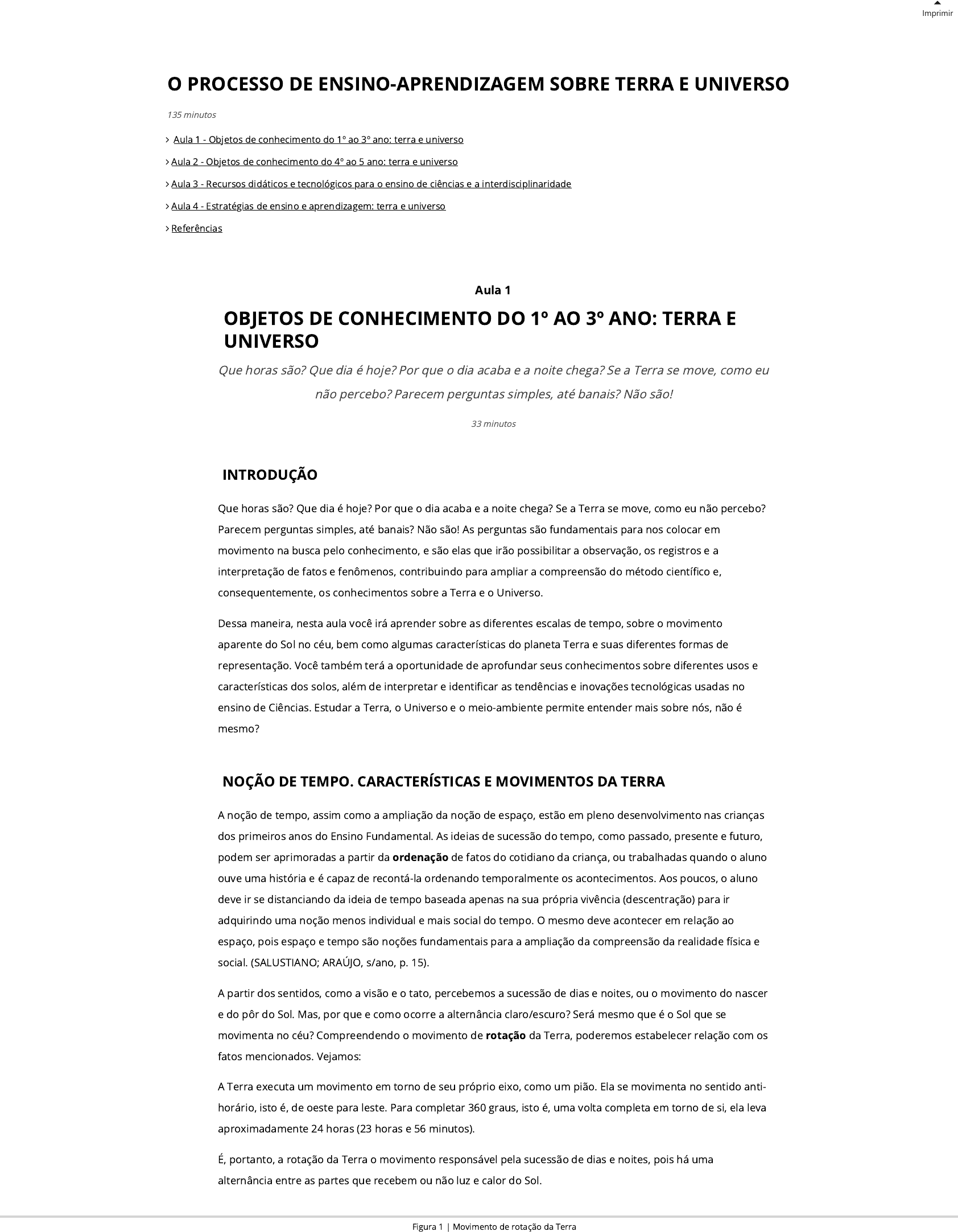 29/01/2023 09:06 wlldd_231_u4_ens_apr_cie_nat https://www.colaboraread.com.br/integracaoAlgetec/index?usuarioEmail=cfagundes07%40gmail.com&usuarioNome=CRISTIANE+FAGUNDES+DE+BRITO&disciplinaDescricao=ENSINO+E+APRENDIZAGEM+DA… 1/16 Imprimir INTRODUÇÃO Que horas são? Que dia é hoje? Por que o dia acaba e a noite chega? Se a Terra se move, como eu não percebo? Parecem perguntas simples, até banais? Não são! As perguntas são fundamentais para nos colocar em movimento na busca pelo conhecimento, e são elas que irão possibilitar a observação, os registros e a interpretação de fatos e fenômenos, contribuindo para ampliar a compreensão do método cientí�co e, consequentemente, os conhecimentos sobre a Terra e o Universo. Dessa maneira, nesta aula você irá aprender sobre as diferentes escalas de tempo, sobre o movimento aparente do Sol no céu, bem como algumas características do planeta Terra e suas diferentes formas de representação. Você também terá a oportunidade de aprofundar seus conhecimentos sobre diferentes usos e características dos solos, além de interpretar e identi�car as tendências e inovações tecnológicas usadas no ensino de Ciências. Estudar a Terra, o Universo e o meio-ambiente permite entender mais sobre nós, não é mesmo? NOÇÃO DE TEMPO. CARACTERÍSTICAS E MOVIMENTOS DA TERRA A noção de tempo, assim como a ampliação da noção de espaço, estão em pleno desenvolvimento nas crianças dos primeiros anos do Ensino Fundamental. As ideias de sucessão do tempo, como passado, presente e futuro, podem ser aprimoradas a partir da ordenação de fatos do cotidiano da criança, ou trabalhadas quando o aluno ouve uma história e é capaz de recontá-la ordenando temporalmente os acontecimentos. Aos poucos, o aluno deve ir se distanciando da ideia de tempo baseada apenas na sua própria vivência (descentração) para ir adquirindo uma noção menos individual e mais social do tempo. O mesmo deve acontecer em relação ao espaço, pois espaço e tempo são noções fundamentais para a ampliação da compreensão da realidade física e social. (SALUSTIANO; ARAÚJO, s/ano, p. 15). A partir dos sentidos, como a visão e o tato, percebemos a sucessão de dias e noites, ou o movimento do nascer e do pôr do Sol. Mas, por que e como ocorre a alternância claro/escuro? Será mesmo que é o Sol que se movimenta no céu? Compreendendo o movimento de rotação da Terra, poderemos estabelecer relação com os fatos mencionados. Vejamos: A Terra executa um movimento em torno de seu próprio eixo, como um pião. Ela se movimenta no sentido anti- horário, isto é, de oeste para leste. Para completar 360 graus, isto é, uma volta completa em torno de si, ela leva aproximadamente 24 horas (23 horas e 56 minutos). É, portanto, a rotação da Terra o movimento responsável pela sucessão de dias e noites, pois há uma alternância entre as partes que recebem ou não luz e calor do Sol. Figura 1 | Movimento de rotação da Terra Aula 1 OBJETOS DE CONHECIMENTO DO 1º AO 3º ANO: TERRA E UNIVERSO Que horas são? Que dia é hoje? Por que o dia acaba e a noite chega? Se a Terra se move, como eu não percebo? Parecem perguntas simples, até banais? Não são! 33 minutos O PROCESSO DE ENSINO-APRENDIZAGEM SOBRE TERRA E UNIVERSO Aula 1 - Objetos de conhecimento do 1º ao 3º ano: terra e universo Aula 2 - Objetos de conhecimento do 4º ao 5 ano: terra e universo Aula 3 - Recursos didáticos e tecnológicos para o ensino de ciências e a interdisciplinaridade Aula 4 - Estratégias de ensino e aprendizagem: terra e universo Referências 135 minutos 29/01/2023 09:06 wlldd_231_u4_ens_apr_cie_nat https://www.colaboraread.com.br/integracaoAlgetec/index?usuarioEmail=cfagundes07%40gmail.com&usuarioNome=CRISTIANE+FAGUNDES+DE+BRITO&disciplinaDescricao=ENSINO+E+APRENDIZAGEM+DA… 2/16 Fonte: Wikimedia. A rotação da Terra também é responsável pelo movimento aparente do Sol. Dizemos aparente, pois, na realidade, a Terra, ao girar em torno de si, faz com que vejamos no céu o movimento do Sol, que nasce no leste e se põe no oeste. E quanto ao formato da Terra? Embora alguns ainda a�rmem que ela é plana, o grego Eratóstenes, que viveu entre 276 a.C. e 195 a.C., já havia descoberto que seu formato era de uma esfera, tendo inclusive calculado com bastante precisão a medida de sua circunferência. E como ele fez isso? Observou a sombra de duas colunas, uma colocada em Siena e outra em Alexandria, as duas no Egito, e notou que em Siena a coluna não projetava nenhuma sombra, já em Alexandria, produzia uma pequena mancha no chão A que conclusão ele chegou? Se o planeta fosse plano, as sombras seriam iguais; como ele é esférico, produz sombras diferentes. Este é um interessante experimento que pode ser feito com os alunos, o que você acha? (Revista Galileu, 2017). Atualmente, possuímos inúmeras fotogra�as aéreas e imagens de satélites de nosso ‘planeta azul’, o que tem permitido conhecê-lo e mapeá-lo com mais facilidade e precisão. Por exemplo, sabe-se atualmente que a Terra não possui a forma de uma esfera perfeita, mas sim de um geoide, pois ela é ligeiramente achatada nos polos, sendo a região da Linha do Equador mais larga. E, desde o surgimento da Terra, há 4,5 bilhões de anos, quando os minerais que compõem o Planeta foram se resfriando e se tornando sólidos, dando origem às primeiras rochas, deu-se início o processo de formação dos solos (pedogênese), a partir da ação de agentes naturais na decomposição e transporte das chamadas rochas matrizes. DIMENSÕES DO TEMPO, TEORIAS SOBRE O SISTEMA SOLAR E FORMAÇÃO DOS SOLOS Há também que se observar uma outra importante dimensão do tempo, qual seja, a duração, que pode ser medida e representada, em minutos, horas, dias, semanas, meses ou anos. Pode-se partir da realidade imediata da criança, nos primeiros anos de escolarização, para ir avançando para observações da sucessão e da