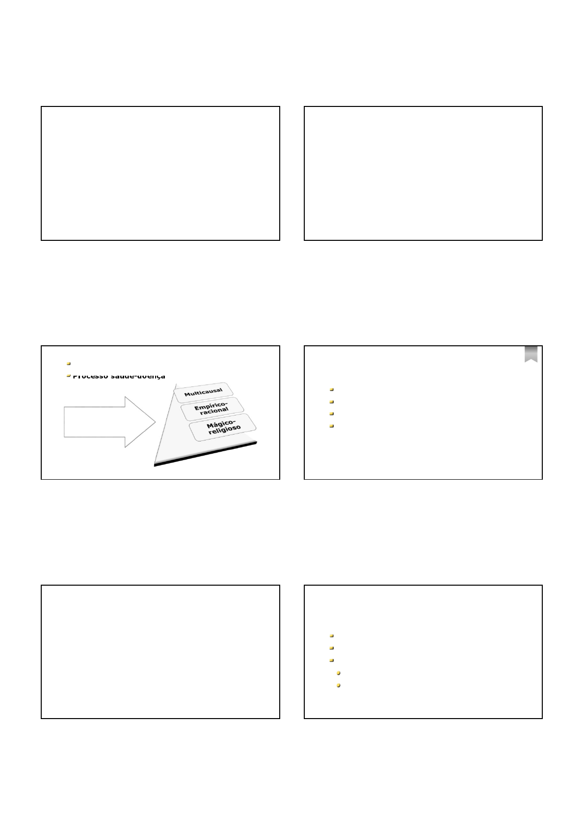 1 Profª Ivana Maria Saes Busato Epidemiologia e Processo Saúde-Doença Aula 2 Conversa Inicial Conceitos básicos da epidemiologia Processo saúde-doença Observações e registros Tempo e espaço Indicadores de saúde Epidemiologia aplicada Vigilância epidemiológica Promoção da saúde e epidemiologia hospitalar Conceito de saúde Conferência da Alma-Ata – 1978 Declaração dos Direitos Humanos – 1978 Brasil Movimento Sanitário Constituição de 1988 Influências 2 “Saúde é o estado de completo bem-estar físico, mental e social, e não mera ausência de moléstia ou enfermidade.” (OMS, 1948) Saúde “Alimentação e moradia, saneamento básico e meio ambiente, trabalho e renda, educação e transporte, lazer e acesso a bens e serviços essenciais.” (Lei 8080/90) Evolução dos modelos explicativos do processo saúde-doença Elementos naturais Espíritos sobrenaturais Adoecer resultante de transgressões Natureza individual e coletiva Modelo explicativo mágico-religioso Medicinas hindu e chinesa Equilíbrio entre os elementos e humores que compõem o organismo humano Individual Modelo explicativo holístico Teoria dos humores Elementos água, terra, fogo e ar estavam subjacentes à explicação sobre a saúde e a doença Individual Modelo explicativo empírico-racional 3 Ausência de doença Patologia, fatores de risco fisiológicos Indivíduos de alto risco Modelo explicativo biomédico A história natural da doença e a determinação social da saúde Modelo multicausal: tríade ecológica História natural da doença Ambiente Agente Hospedeiro Determinação social da saúde Causalidade em saúde •Microrganismo agente causal Postulados de Henle-Koch 4 Força da associação Consistência ou replicação Especificidade Temporalidade Gradiente biológico Plausibilidade biológica Coerência Evidência experimental e analogia Critérios de causalidade de Hill Causa suficiente Constelação de fatores – multicausalidade Causas componentes Agem em conjunto para a produção de determinado efeito/doença Modelo de causa suficiente e causas componentes – Rothman Modelos de Causalidade Observação e registros no tempo e no espaço Características das pessoas ou atributos individuais Classe social, gênero e sexo, etnia ou raça Movimentos migratórios, estilo de vida Comportamentos individuais e em grupo Observação e registros de indivíduos e populações Avaliação da distribuição espacial de determinada doença em diferentes períodos de tempo Distribuição espacial e no tempo 5 Na Prática Mortalidade infantil – país A e B Finalizando Conceito de saúde Evolução histórica Conceito Importância Observações e registros Tempo e espaço Modelos explicativos do processo saúde-doença