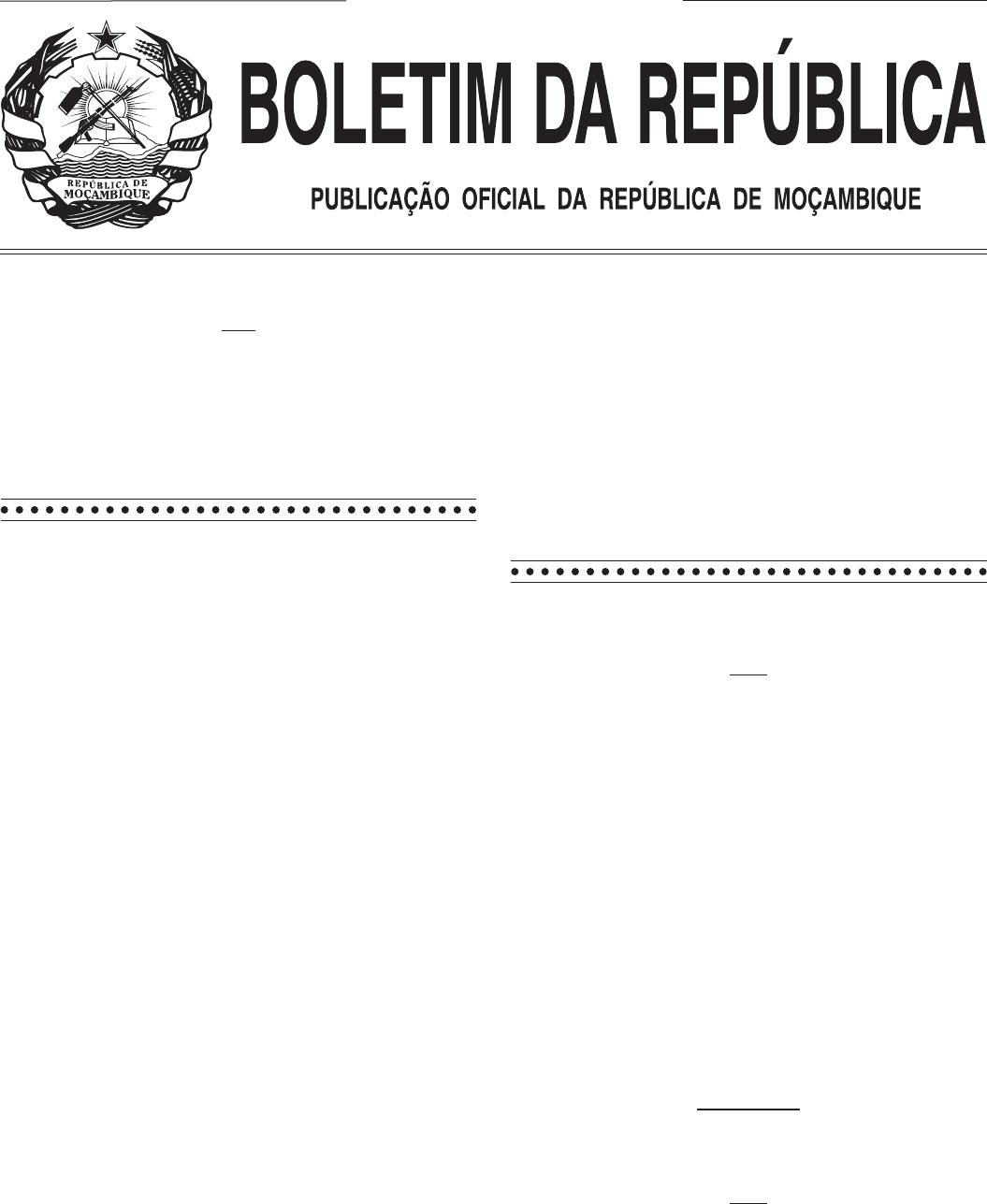 III SÉRIE — Número 99Quarta-feira, 25 de Maio de 2022 IMPRENSA NACIONAL DE MOÇAMBIQUE, E.P. AVISO A matéria a publicar no «Boletim da República» deve ser remetida em cópia devidamente autenticada, uma por cada assunto, donde conste, além das indicações necessárias para esse efeito, o averbamento seguinte, assinado e autenticado: Para publicação no «Boletim da República». SUMÁRIO Ministério da Justiça, Assuntos Constitucionais e Religiosos: Despacho. Direcção Nacional dos Registos e Notariado: Despacho. Governo da Província de Inhambane: Despacho. Governo da Província da Zambézia: Despacho. Governo do Distrito de Gilé: Despacho. Governo do Distrito de Montepuez: Despacho. Anúncios Judiciais e Outros: Associação Centro de Acolhimento Menino Jesus. Associação Comunitária Amandla de Inhambane. Associação dos Camponeses do Bairro Baixa. Associação EKURO. Ahama Service – Sociedade Unipessoal, Limitada. Amuda Comércio & Serviços – Sociedade Unipessoal, Limitada. Angelina Catering & Serviços – Sociedade Unipessoal, Limitada. ARBAT LogÍstica & Serviços, Limitada. Camaga Construções – Sociedade Unipessoal, Limitada. Casa Jardins da Regaleira, Limitada. Chibata Construções – Sociedade Unipessoal, Limitada. Cirumed, Limitada. Confiança Comercial – Sociedade Unipessoal, Limitada. Escola Primária Completa Centro de Acolhimento Menino Jesus – Sociedade Unipessoal, Limitada. Farmácia Salmo 37v.5, EI. Grupo Siga, Limitada. I Think e Prestação de Serviços, Limitada. Joseph Multi Serviços & Transporte Logística, Limitada. Local Offshore Consultant – Sociedade Unipessoal, Limitada. LogExpress - Logística & Serviços, Limitada. Lugela Agro Comercial, Transporte e Prestação de Serviços, Limitada. Master Medical Clinic, Limitada. Mini Mercado, Limitada. Direcção Nacional dos Registos e Notário DESPACHO Nos termos do artigo 362 do Código do Registro Civil, é concedida autorização aos senhores Ikechukwu Raymod Ifionu e Gift Onyinye Ifionu, a efectuarem a mudança do nome de seu filho menor Albright Chimaobim Ifionu para passar a usar o nome completo de Albright Chimaobim Ikechukwu. Direcção Nacional dos Registos e Notariado, em Maputo, Maio de 2022. — Director Nacional, Arafat Nadim de Almeida Jumá Zamila. MINISTÉRIO DA JUSTIÇA, ASSUNTOS CONSTITUCIONAIS E RELIGIOSOS DESPACHO Um grupo de cidadaõs requereu a Ministra da Justica, Assuntos Constitucionais e Religiosos, o reconhecimento jurídico de OFEC – Organização para o Fortalecimento Económico da Comunidade como pessoa jurídica, juntando ao pedido estatutos da sua constituição. Apreciado o precesso verifica-se que se trata de uma associação que prossegue fins licítos, determinados e legalmente possíveis cujo acto de constituição e os estatutos da mesma cumprem o escopo e os requisitos exigidos por lei, portanto, nada obsta o seu reconhecimento. Nestes termos, ao abrigo do disposto no n.º 1, do artigo 5, da Lei n.º 8/91, de 18 de Julho, conjugado com o artigo 1, do Decreto n.º 21/91, de 3 de Outubro, vai reconhecida como pessoa jurídica a OFEC – Organização para o Fortalecimento Económico da Comunidade. Ministério da Justiça, Assuntos Constitucionais e Religiosos, em Maputo, 28 de Abril de 2022. — A Ministra, Helena Mateus Kida. Mozpet Reciclagem – Sociedade Unipessoal, Limitada. Novac Logistic – Sociedade Unipessoal, Limitada. O Embomdeiro 1977 – Sociedade Unipessoal, Limitada. OFEC – Organização para o Fortalecimento Económico da Comunidade. Rakel Rent House – Sociedade Unipessoal, Limitada. RR Engineering Construction Service – Sociedade Unipessoal, Limitada. Rubiar – Sociedade Unipessoal, Limitada. Shalom – Sociedade Unipessoal, Limitada. Tribunal Judicial da Província da Zambézia. 2on Consultores & Serviços, Limitada. III SÉRIE — NÚMERO 993294 Governo do Distrito de Gilé DESPACHO Um grupo de cidadãos em representação da Associação dos Camponeses do Bairro Baixa, abreviadamente designada por (ACB), requereu ao Adminstrador do Distrito de Gilé, o reconhecimento como pessoa jurídica juntando ao pedido os estatutos da sua constituição. Apreciados os documentos submetidos, verifica-se que se trata de uma associação, que prossegue fins lícitos não lucrativos determinados e possíveis e que o acto de constituição e os estatutos da mesma cumprem o escopo e os requisitos exigidos por lei, não obstando ao seu reconhecimento jurídico-legal pelo Governo do Distrito. Nestes termos, e no disposto dos n.ºs 1, 2, e 9, do artigo 5, do Decreto- -Lei n.º 2/2006, de 3 de Maio, vem reconhecida a Associação dos Camponeses do Bairro Baixa, abreviadamente designada por (ACB), com sede na comunidade de Baixa, localidade sede, posto administrativo de Gilé Sede, distrito de Gilé, província da Zambézia. Governo do Distrito de de Gilé, 23 de Dezembro de 2022. — O Administrador do Distrito, Mariano Alberto Maquize. Governo do Distrito de Montepuez DESPACHO Um grupo de cidadãos de uma associação civil de Nacuca, requereu ao Posto de Mirate o seu reconhecimento como pessoa jurídica juntando ao pedido os estatutos da sua constituição. Apreciados os documentos submetidos, verifica-se que se trata de uma organização civil que prossegue fins lícitos, não lucrativos, determinados e possíveis, e que o acto de constituição e os estatutos da mesma cumprem o escopo e os requisitos exigidos por lei, não obstando ao seu reconhecimento. Os órgãos sociais da referida associação eleitos por período de 3 anos, renovável uma vez, são seguintes: Assembleia Geral; Conselho de Direcção e Conselho Fiscal. Nestes termos, e no disposto no artigo 1, do Decreto-Lei n.º 2/2006, de 3 de Maio, vai reconhecida definitivamente a Associação EKURO. Governo do Distrito de Montepuez, 10 de Dezembro de 2013. — O Chefe do Posto Administrativo, Ilegível. Governo da Província da Zambézia DESPACHO Um grupo de cidadãos em repr