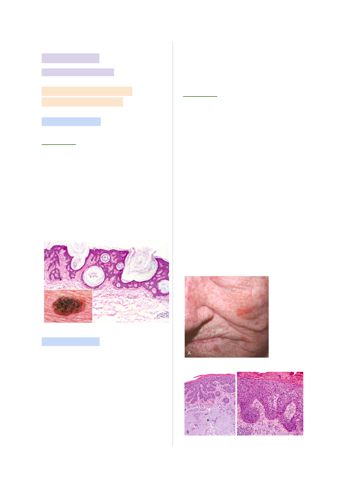 Tumores de pele Por: Melissa Becker Trois Lesões epiteliais benignas e potencialmente malignas Ceratose seborréica Morfologia • Esses tumores pigmentados epidérmicos comuns ocorrem com mais frequência em indivíduos de meia-idade ou mais velhos. • Placas redondas e planas compostas por proliferações monótonas de células epidérmicas basais, que em alguns casos contêm melanina. • A hiperqueratose e os cistos preenchidos por queratina são algumas características. Queratose Actínica • Essas lesões são originadas pela exposição solar crônica e associadas com hiperqueratose e, por isso, são chamadas de queratoses actínicas (relacionadas ao Sol). • Muitas queratoses actínicas evoluem para o carcinoma com o tempo • Muitas lesões regridem ou permanecem estáveis. • Elevada parcela dessas lesões está associada com mutações no gene TP53 causadas por danos ao DNA induzidos pela luz UV. Morfologia • Lesões menores que 1 cm de diâmetro; apresentam coloração vermelha ou marrom-acastanhada e são ásperas ao toque, semelhantes a uma lixa • Microscopicamente, as regiões inferiores da epiderme exibem atipias celulares, frequentemente associadas com hiperplasia das células basais • Pode ter atrofia e redução difusa da superfície epidérmica. A derme contém fibras elásticas espessas, azul-acinzentadas (elastose solar), resultado dos danos solares crônicos. A camada córnea é espessa, com núcleos retidos (paraqueratose). • Em algumas lesões, atipias em toda a espessura epidérmica são observadas, sendo consideradas formas de carcinomas de células escamosas in situ Tumores Epidérmicos Malignos Carcinoma de Células Escamosas • O carcinoma de células escamosas é um tumor comum que surge em locais expostos ao sol e em indivíduos com idade mais avançada. • Maior incidência em homens do que em mulheres Morfologia • Os carcinomas de células escamosas in situ aparecem como placas eritematosas, escamosas e bem definidas; • Muitos são precedidos pelas queratoses actínicas. • Na fase avançada, as lesões invasivas são nodulares, exibem escamas variáveis e podem ulcerar. • Microscopicamente, o carcinoma de células escamosas in situ é caracterizado por atipia celular intensa em todas as camadas da epiderme, com aglomeração e desorganização nuclear. • Os tumores invasivos, definidos pela invasão da membrana basal, exibem graus variáveis de diferenciação Carcinoma de Células Basais • Câncer comum, de crescimento lento e que raramente sofre metástases. • Apresenta tendência para ocorrer em locais suscetíveis a exposição solar crônica e em indivíduos com pouca pigmentação. Patogenia • Está associado com a desregulação da via de sinalização de Hedgehog. • Defeitos herdados no gene PTCH, um supressor tumoral que regula a sinalização da via de Hedgehog, causa o carcinoma de células basais familial na síndrome de Gorlin. • Mutações funcionais em PTCH1, um gene supressor de tumor que regula negativamente a sinalização Hedgehog; portanto, os tumores exibem a ativação constitutiva dessa via de sinalização. • As mutações em TP53 também são comuns, tanto nos tumores hereditários quanto nos esporádicos. Morfologia • Os carcinomas de células basais se manifestam como pápulas peroladas, que muitas vezes contêm vasos sanguíneos subepidérmicos dilatados e proeminentes • Alguns tumores contêm melanina e, por isso, podem ser semelhantes aos nevos melanocíticos ou melanoma. • Microscopicamente, as células tumorais se assemelham às células normais da camada basal da epiderme • Não ocorrem nas superfícies das mucosas. Proliferações Melanocíticas Nevos Melanocíticos • O termo nevo denota qualquer lesão congênita de pele • O nevo melanocítico refere-se a qualquer neoplasia benigna de melanócitos congênita ou adquirida. • São pápulas pequenas (≤5 mm de largura) com bordas arredondadas bem definidas, coloração marrom-acastanhada e uniformemente pigmentados Patogenia • Os nevos melanocíticos são neoplasias benignas derivadas dos melanócitos • O crescimento progressivo e a migração de células névicas são acompanhados por alterações de senescência celular • As células névicas superficiais são maiores, apresentam tendência a produzir melanina e crescem em ninhos • As células névicas profundas são menores, produzem pouco ou nenhum pigmento e crescem em cordões ou através de células individuais. • A maioria dos nevos benignos apresenta uma mutação ativadora em BRAF, que codifica uma serina/treonina quinase mediada por RAS • A sinalização descontrolada de BRAF/RAS induz a proliferação melanocítica seguida por senescência. • O “freio” na proliferação pela indução da senescência explica a razão de que poucos nevos se transformam em melanomas malignos. A, A pele normal exibe apenas melanócitos difusos. B, Nevo juncional. C, Nevo composto. D, Nevo intradérmico. E, Nevo intradérmico com extensa senescência celular. Nevos Displásicos • Os nevos displásicos podem ser esporádicos ou familiais - os familiares são importantes clinicamente, pois são considerados precursores (em potencial) do melanoma. • As mutações ativadoras em BRAF ou NRAS são comumente encontradas nos nevos displásicos Morfologia • Maiores do que a maioria dos nevos adquiridos (frequentemente, >5 mm de diâmetro) • Podem ser em número de centenas • Máculas ou placas levemente elevadas, com superfície “pedregosa”, pigmentação variável e bordas irregulares • As atipias citológicas consistem em contornos irregulares dos núcleos, frequentemente angulados e hipercromáticos • Microscopicamente, os nevos displásicos geralmente são compostos e exibem atipias arquiteturais e citológicas de crescimento anormal • Os ninhos de células névicas dentro da epiderme podem estar aumentados e se fundir • As células névicas ind