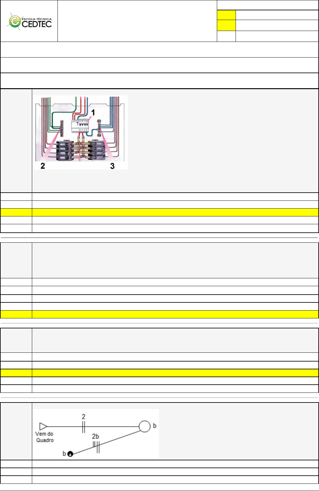 Pincel Atômico - 26/02/2023 21:19:43 1/2 Exercício Caminho do Conhecimento - Etapa 29 (14710) Atividade finalizada em 17/04/2022 17:47:39 (329131 / 2) LEGENDA Resposta correta na questão # Resposta correta - Questão Anulada X Resposta selecionada pelo Aluno Disciplina: INSTALAÇÕES ELÉTRICAS PREDIAIS [427266] - Avaliação com 4 questões, com o peso total de 4,33 pontos [capítulos - 110] Turma: Curso Técnico: Eletrotécnica - Grupo: EAD - JANEIRO/22 - EAD ELE [63862] Aluno(a): 91279239 - RAFAEL GOMES DE SOUZA - Respondeu questões corretas, obtendo um total de 0,00 pontos como nota [350083_102 48] Questão 001 A seguir, apresenta-se ao lado, o quadro de distribuição bifásico de uma edificação. Sobre o elemento indicado com o número 1, analise as afirmativas a seguir. 1. Tem como função apenas proteger os circuitos de possíveis sobrecargas. 2. Conjuga um disjuntor termomagnético e um disjuntor residual geral. 3. Esse elemento é conhecido como disjuntor diferencial residual geral e permite manobra manual. Se somente a afirmativa (II) for verdadeira Se somente as afirmativas (I) e (II) forem verdadeiras Se somente a afirmativa (III) for verdadeira Se somente a afirmativa (I) for verdadeira X Se somente as afirmativas (II) e (III) forem verdadeiras [350083_102 50] Questão 002 O que deve ser observado na montagem do QDC? 1. Acessibilidade a todos os componentes instalados; 2. Identificação dos componentes (Placas e Etiquetas); 3. Independência dos componentes (Interferência prejudicial); 4. Espaço Reserva (Prever aumento da demanda). Pode-se afirmar que esta correta a afirmação: Somente a afirmação IV é verdadeira X As afirmações I, II e IV estão corretas Somente I e II estão corretas As afirmações I, II, III e IV estão erradas As afirmações I, II, III e IV estão corretas [350083_102 46] Questão 003 Para funcionar com desempenho satisfatório e ser suficientemente segura contra risco de acidentes fatais, toda instalação elétrica de alta e baixa tensão deve possuir um sistema de aterramento, dimensionado adequadamente para as condições de cada projeto. Dentre os objetivos abaixo, qual NÃO diz respeito aos propósitos de um sistema de aterramento? X Uniformização do potencial em toda a área do projeto, prevenindo contra lesões perigosas que possam surgir durante uma falta fase-terra. Proteção do indivíduo contra contatos com partes metálicas da instalação energizadas acidentalmente. Segurança contra sobrecarga. Segurança de atuação da proteção. Proteção do indivíduo contra descargas atmosféricas. [350083_102 49] Questão 004 O diagrama a seguir corresponde a qual instalação? Lâmpada fluorescente comandada por interruptor simples Lâmpada comandada por rele de impulso Lâmpada comandada por interruptor paralelo Pincel Atômico - 26/02/2023 21:19:43 2/2 Lâmpada comandada por interruptor bipolar X Lâmpada comandada por interruptor simples