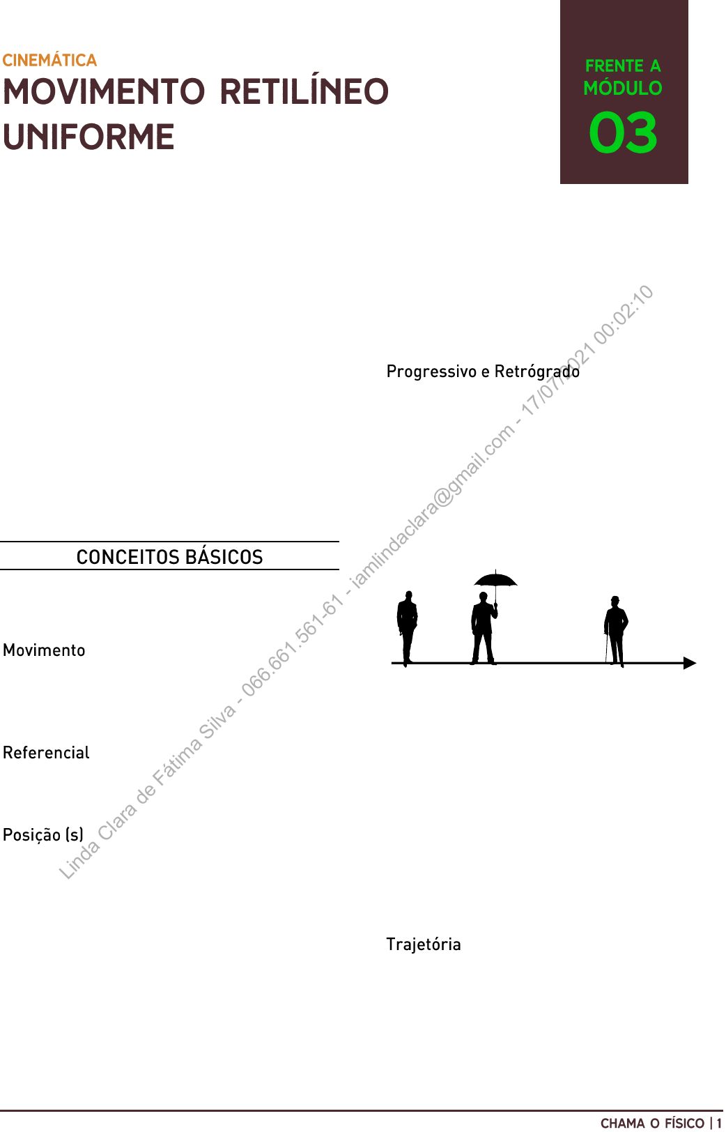 A cinemática é a parte da física que estuda os movimentos sem se preocupar com as causas. Em outras palavras, vamos estudar como um corpo se movimenta, sem focar com o motivo pelo qual ele está em movimento — esses motivos nós veremos em Leis de Newton, mais para frente no curso Chama o Físico. Na cinemática, você verá cinco módulos, sendo: • Movimento Retilíneo Uniforme; • Movimento Retilíneo Uniformemente Variado; • Queda livre e Lançamento Vertical; • Composição de Movimentos; • Movimento Circular Uniforme. Bora começar? Bons estudos! Vamos iniciar o nosso estudo da cinemática com alguns conceitos básicos, mas extremamente importantes! A cinemática é a parte da física que estuda os movimentos. Um corpo está em movimento quando ele mudar de posição em relação a um referencial. Referencial é o local, ou seja, o ponto de vista de onde se observa a situação. A posição é a distância de um corpo em relação a um referencial. Para compreender esses conceitos, imagine um trem em movimento. Para analisar o movimento desse trem, podemos utilizar diversos referenciais. Por exemplo, podemos pegar o referencial de um passageiro dentro do trem ou de alguém parado em uma estação por onde o trem passa. A percepção de movimento do trem varia de acordo com o referencial. Por exemplo, se o referencial for o passageiro dentro do trem, o trem está parado! Estranho né? O trem está parado pois o passageiro no seu interior acompanha o mesmo movimento do trem e, consequentemente, não se desloca em relação ao trem. Entretanto, se o referencial for alguém parado na estação, a posição do trem vai mudando em relação a esse referencial, ou seja, o trem estaria em movimento! Um movimento pode ser de dois tipos: progressivo ou retrógrado. Dizemos que um movimento é progressivo quando sua posição está aumentando em relação ao referencial e, nesse caso, a velocidade do corpo é positiva. Dizemos que o movimento é retrógrado quando sua posição está diminuindo e, portanto, a velocidade será negativa. Veja o diagrama abaixo: Nosso referencial está em 0, no ponto B. Caso a pessoa mude do ponto A para o B e depois para o C, ela estará aumentando suas posições e, portanto, estará em movimento progressivo. Porém, se ela for da direita para a esquerda, partindo do ponto C ao A, ela estará em movimento retrógrado, diminuindo suas posições. Vale reforçar que isso não significa que o corpo está dando ré, mas sim que ele está apenas voltando no referencial! Agora que você já sabe o que é movimento, referencial e posição, vamos falar da trajetória de um corpo. Trajetória representa o caminho descrito por um corpo. A trajetória depende do referencial e pode tomar diversos formatos, como retilínea, curvilínea, circular, parabólica, dentre outros. Para entender melhor, vamos imaginar um avião se movimentando em linha reta com uma velocidade Lin da C lar a de F át im a Si lva - 06 6. 66 1. 56 1- 61 - iam lin da cla ra @ gm ail .co m - 17 /0 7/ 20 21 0 0: 02 :1 0 constante, ou seja, em Movimento Retilíneo Uniforme (MRU). Em certo momento, esse avião abandona uma bomba, conforme a imagem abaixo: Vamos analisar essa situação em dois referenciais: (1) de uma pessoa na Terra, olhando o movimento da bomba e do avião, (2) e do piloto, dentro do avião. Como a bomba está acoplada ao avião e este segue seu trajeto para a direita em MRU, podemos afirmar que a bomba também possui uma velocidade constante para a direita, certo? Quando o avião solta a bomba, a única força atuando sobre a bomba é a força peso, em direção ao chão. Cuidado para não associar força com velocidade! Eu espero que você tenha matado o Aristóteles dentro de você no curso de Fundamentos da Mecânica. Não há nenhuma força atuando na bomba para a direita. Então podemos afirmar que, horizontalmente, a bomba seguirá em movimento uniforme. Lembra? Quando a força resultante sobre um corpo é zero, se ele está em movimento, ele tenderá a continuar em movimento uniforme. E o movimento vertical? Bom, como falamos, a força peso atua sobre a bomba, ou seja, verticalmente teremos uma força resultante diferente de 0, o que significa que o movimento da bomba nessa direção será acelerado. Ok, agora, como nossos dois referenciais enxergam o movimento dessa bomba? Primeiro, temos uma pessoa parada na Terra vendo todo o movimento. Você concorda que ela verá tanto o movimento da bomba horizontal quanto vertical? Mas qual a trajetória que ela enxerga? Como falamos, para a direita a bomba estará em MRU, assim como o avião, o que significa que ela seguirá bem abaixo do avião durante todo o seu movimento (considerando que o avião não vai acelerar nem frear). Mas ela também estará em um movimento acelerado para baixo, o que significa que a bomba formará uma trajetória parabólica aos olhos de quem está na Terra observando. E o piloto do avião? Ele também enxergará a trajetória parabólica da bomba? A resposta é não. Para o piloto, a bomba faz uma trajetória retilínea. Basta pensar que o piloto segue dentro do avião em MRU e que a bomba segue na mesma direção, sentido e com a mesma velocidade. Ou seja, o piloto só verá a bomba caindo e não será capaz de enxergar seu movimento para a direita, já que está ele também indo para a direita. Ou seja, ele perceberá apenas um movimento vertical da bomba afastando-se dele! A conclusão que chegamos com essa análise é que o movimento é relativo e depende do referencial pelo qual você o analisa. Detalhe: compreender que o movimento é relativo é considerado o primeiro grande desafio do estudo da cinemática! Se você estiver incomodado com essas discussões, fique tranquilo(a)! Nós ainda iremos amadurecer bastante as nossas ideias! Quando falamos de velocidade média, existem dois tipos que você precisa considerar. A velocidade escalar média e a velocidade vetorial média. A velocidad