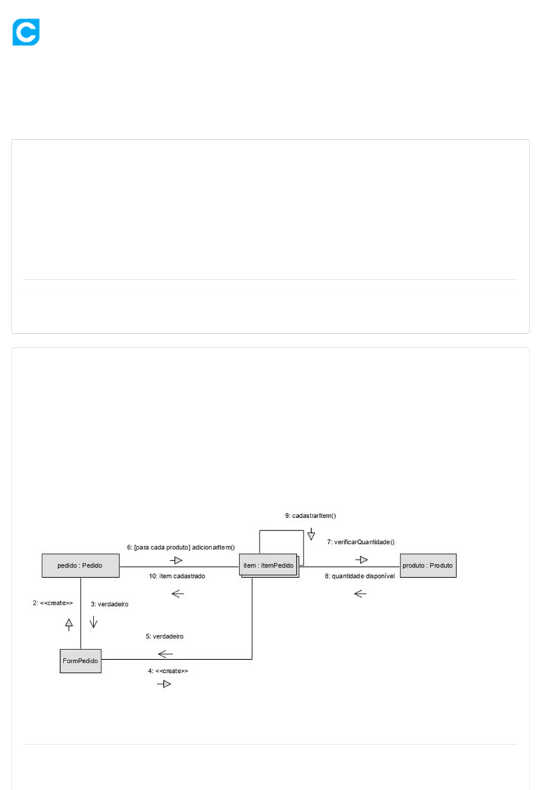 Análise Orientada a Objetos (/aluno/timelin… Av2 - Análise Orientada a Objetos (/notific Informações Adicionais Período: 06/02/2023 00:00 à 13/03/2023 23:59 Situação: Cadastrado Tentativas: 2 / 3 Pontuação: 1500 Protocolo: 831434809 Avaliar Material 1) A ênfase do Diagrama de Comunicação está em demonstrar exatamente a ligação entre os objetos representados pela Lifeline, que participam da realização de um caso de uso. Segundo Guedes (2018), o Diagrama de Comunicação complementa o Diagrama de Sequência, concentrando-se na representação de como os elementos do diagrama estão vinculados e a ocorrência das mensagens que esses elementos trocam entre si durante a execução de um processo, normalmente baseado em um caso de uso, não se preocupando com a temporalidade do processo. A figura a seguir ilustra um recorte de um Diagrama de Comunicação, correspondente ao caso de uso “Realizar Pedido” de um sistema de vendas. Sobre os elementos representados no Diagrama de Comunicação, assinale a alternativa correta que condiz com a representação. Alternativas: https://www.colaboraread.com.br/aluno/timeline/index/3198922403?ofertaDisciplinaId=1945091 https://www.colaboraread.com.br/notificacao/index javascript:void(0); a) b) c) d) e) 2) a) b) c) d) e) 3) A mensagem “9:cadasstrarItem( )” representa uma mensagem construtora para o objeto “item:ItemPedido” O elemento “produto:Produto” representa uma Linha de Vida (Lifeline), indicando uma coleção de instâncias da classe “Pedido”. O elemento “item:ItemPedido” representa um Multiobjeto, ou seja, uma coleção de objetos de uma mesma classe, participando da interação. Alternativa assinalada O elemento “FormPedido” representa uma Linha de Vida (Lifeline), indicando uma coleção de objetos do tipo interface do sistema. O elemento “pedido:Pedido” representa uma Linha de Vida (Lifeline), indicando uma coleção de instâncias da classe “Pedido”. Uma das formas mais utilizadas de especificar a interação entre os objetos é enfatizando à ordenação temporal das mensagens, representando a sequência lógica da troca de mensagens formada por um conjunto de objetos e seus relacionamentos, a partir da adoção do Diagrama de Sequência, o qual é uma forma de representar a ordem temporal em que as mensagens são trocadas entre os objetos envolvidos na execução de um processo, ou seja, na realização de um caso de uso. Sobre as possíveis trocas de mensagens que podem acontecer entre os elementos do Diagrama de sequência, julgue as afirmativas a seguir: I. Ator e Ator: indica uma comunicação entre os atores envolvidos na realização de um caso de uso. II. Ator e Objeto: geralmente o ator provoca um evento, enviando uma mensagem que dispara uma operação, contudo o ator pode simplesmente transmitir uma informação sem disparar uma operação. III. Objeto e Ator: indica o retorno de uma mensagem com a resposta que transmite uma mensagem reflexiva para o Ator. IV. Objeto e Objeto: indica o envio de uma mensagem, disparando uma operação, sendo que um objeto pode enviar uma mensagem para si mesmo, denominada de mensagem reflexiva. É correto o que se afirma em Alternativas: I e II, apenas. III e IV, apenas. I, II e IV, apenas. Alternativa assinalada II, III e IV, apenas. I, II, III e IV. Todo objeto do mundo real ou do mundo computacional assumem diferentes estados durante a sua existência, ou seja, durante seu ciclo de vida. Durante a execução de uma funcionalidade do sistema, um objeto muda de estado quando acontece algum evento interno ou externo ao sistema, provocando uma transição entre os estados do objeto e com isso, o objeto realiza determinadas ações responsáveis pela consistência e integridade dos dados do sistema. Para modelar os estados de um objeto usa-se o Diagrama de Máquina de Estados. a) b) c) d) e) 4) a) b) c) d) e) Sobre a notação dos principais elementos do Diagrama de Máquina de Estados, julgue as afirmativas a seguir: I. O elemento “Estado Inicial” representa o estado de um objeto quando ele é criado. Pode haver vários estados iniciais em um diagrama de máquina de estados. II. O elemento “Estado Final” representa o fim do ciclo de vida de um objeto. Este estado é opcional e pode haver mais de um estado final em um diagrama de máquina de estados. III. O elemento “Estado” representa uma situação na vida de um objeto durante a qual ele satisfaz alguma condição ou realiza alguma atividade. IV. O elemento “Transição de Estado” representa uma associação entre os estados, com uma seta apontando para um dos estados. É correto o que se afirma em: Alternativas: I e II, apenas. III e IV, apenas. I, II e IV, apenas. II, III e IV, apenas. Alternativa assinalada I, II, III e IV. A empresa Lógica Soluções em TI está revisando a sua metodologia de desenvolvimento de sistemas de softwares e decidiu adotar o modelo de processo denominado - Processo Unificado Ágil (AUP - Agile Unified Process) que adota as atividades em fases clássicas do Processo Unificado – Concepção, Elaboração, Construção e Transição, fornecendo uma camada serial, ou seja, uma sequência linear de atividades de engenharia de software que permite a` equipe visualizar o fluxo do processo geral de um projeto de software. Decidiu-se também adotar algumas técnicas de modelagem da Unified Modeling Language (UML) para modelagem dos sistemas, entre elas, um diagrama de interação que demonstra a sequência de eventos que ocorrem em um determinado processo, identificando quais métodos devem ser disparados entre os atores e objetos envolvidos, representando a troca de mensagens sequenciais entre os objetos das classes. Considerando o contexto descrito, assinale a alternativa correta que indica o diagrama da UML que deve ser adotado para esse objetivo. Alternativas: Diagrama de Pacotes. Diagrama de Atividades. Diagrama de Máquina de Estados. Diagrama de Sequ