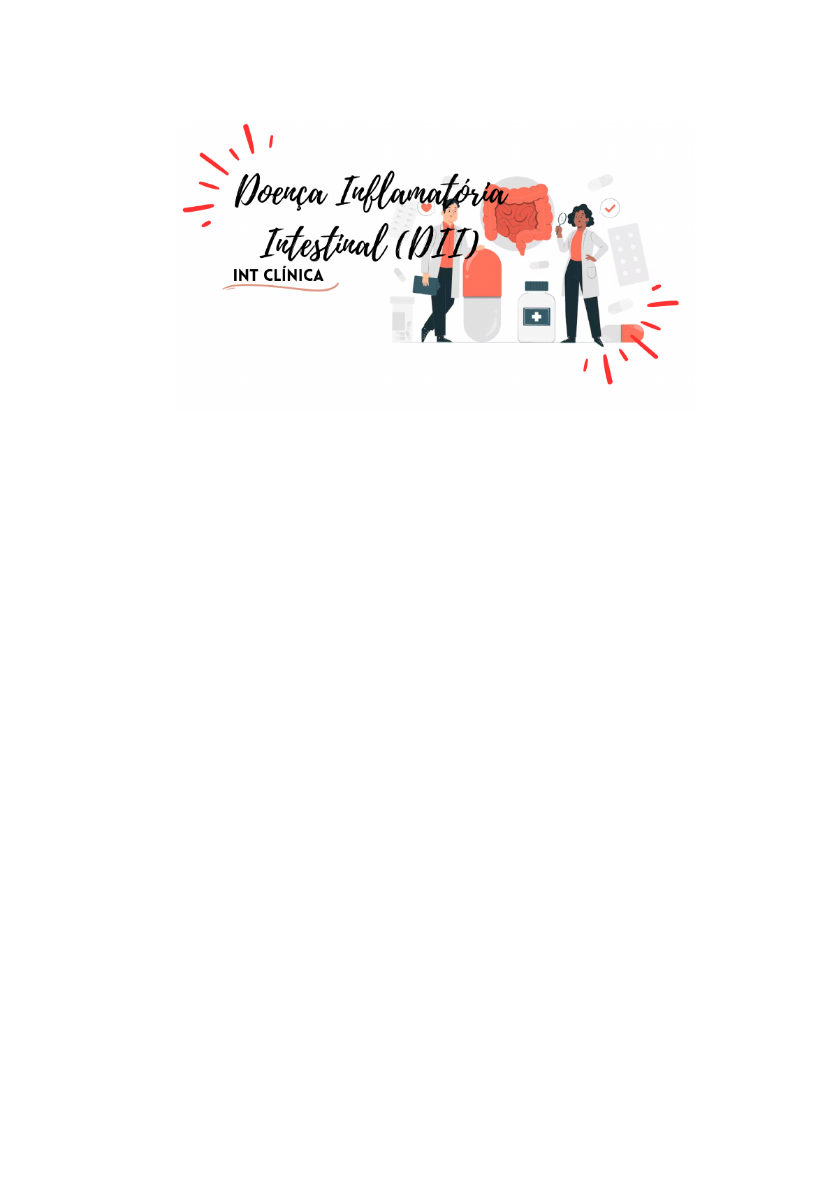 Lara Mendonça P7 → São entidades inflamatórias crônicas do trato gastrointestinal, com surtos de remissão e exacerbação; → Compreende: ● Doença de Crohn (DC) e a Retocolite Ulcerativa (RCU); ● Trata-se de doenças multifatoriais; ● Fatores genéticos, ambientais, microbiota intestinal e regulação imunológica da mucosa; ETIOLOGIA ● Alteração na função da barreira epitelial intestinal; ● Facilitando a colonização e o constante estímulo de produtos bacterianos e citocinas pró-inflamatórias; ● Disfunção da imunidade inata e perda do sistema de tolerância; ● Amplificação do processo imunoinflamatório; FATORES DE RISCO ● Estilo de vida ocidental; ● Dieta rica em gordura e açúcar e pobre em frutas; ● Exposição a toxinas e xenobióticos (agrotóxicos, drogas, metais, parabenos, produtos químicos); ● Uso de medicamentos (antibióticos e AINES); ● Alto nível socioeconômico; ● Tabagismo (maior risco de DC e aparente proteção na retocolite ulcerativa); ● História Familiar (positiva em 10-20% dos casos). QUADRO CLÍNICO ● Altamente dependente do local e extensão da doença, bem como a forma e intensidade do processo inflamatório; ● No caso da Doença de Crohn (DC) – inflamatório, estenosante ou fistulizante); ● Se atentar para as enterites: dor abdominal + diarreia + febre + emagrecimento; Lara Mendonça P7 ● Presença de manifestações extraintestinais; MANIFESTAÇÕES EXTRAINTESTINAIS → A Retocolite Ulcerativa (RU) acomete essencialmente a mucosa do reto e/ou submucosa e dos cólons com distribuição simétrica e contínua; Lara Mendonça P7 → A Doença de Crohn (DC) se caracteriza por processo inflamatório transmural, podendo acometer desde a boca ao ânus com predileção pela região ileal ou ileocolônica com característica descontínua , podendo assumir formas estenosantes e fistulizantes; DIAGNÓSTICO O diagnóstico envolve forte suspeita clínica , associada essencialmente a achados endoscópicos, radiológicos e histológicos; EXAMES COMPLEMENTARES ● Hemograma; ● Ureia; ● Creatinina; ● Ionograma (K, Na , Cl); ● PCR, VSH e ALFA-1- GLICOPROTEÍNA; ● Parasitológico de fezes, coprocultura e pesquisa de toxina para Clostridium; ● Marcadores fecais: LACTOFERRINA E CALPROTECTINA FECAL (Diagnóstico/Acompanhamento/Atividade da doença); ● AST/ALT /FOSFATASE ALCALINA/BILIRRUBINAS/GAMA GLUTAMILTRANSFERASE; ● Proteínas totais e frações, Ácido Fólico , Vitamina B12, zinco e perfil do ferro ( ferro sérico, ferritina e saturação de transferrina) ● Anticorpo anti- Saccharomyciscereviriae (ASCA) ● Anticorpo Anticitoplasma de neutrófilo perinuclear (pANCA) Lara Mendonça P7 TRATAMENTO Para a escolha apropriada da melhor abordagem terapêutica, é necessário considerar grau de atividade clínica e endoscópica da doença, localização, extensão, comportamento, eficácia da droga e seus potenciais efeitos colaterais, resposta prévia a algum tipo de tratamento, presença de manifestações extraintestinais ou complicações relacionadas à doença. → Objetivos do Tratamento: ● Controle sustentado da inflamação por meio da cicatrização da mucosa; ● Prevenção de lesões estruturais irreversíveis e complicações (fístulas, abscessos, estenoses, fibrose, dismotilidade , neoplasia); Em 2021 , um grupo de especialistas internacionais de DII publicou 13 recomendações atualizadas para o monitoramento e tratamento da DII, tanto em adultos quanto em pediatria (STRIDE II) → STRIDE II – Resposta e remissão clínica, bem como normalização da proteína C reativa (PCR) como alvos terapêuticos a serem atingidos a curto prazo. E a longo prazo , a restauração da qualidade de vida e a ausência de incapacidade. O arsenal terapêutico atual de DII está dividido em: 1. Terapias Convencionais a. Corticosteróides b. Imunossupressores orais c. Aminossalicilatos orais e tópicos 2. Terapias Biológicas a. Antifator de necrose tumoral b. Anti-integrinas c. Anti interleucinas 3. Pequenas moléculas para uso oral a. Inibidores da Janus quinase Lara Mendonça P7 → CORTICOSTERÓIDES ● Indicado para indução de remissão clínica na doença em atividade; ● Não estão indicados na manutenção da remissão; ● O mais utilizado é a Prednisona 1mg/kg/dia ● Não deve exceder o uso 8-12 SEMANAS ( necessidade de DESMAME); → DOENÇA LEVE A MODERADA: ● MESALAZINA/SULFASSALAZINA: Mais efetivos para RCU não havendo evidências científicas de seu uso na DC; ● AZATIOPRINA: É o imunossupressor de escolha. Como ponto negativo : risco de linfoma (5X), neoplasia renal e câncer de pele não melanoma; ● METOTREXATO: Imunossupressor alternativo à azatioprina. Cuidado em mulheres em idade fértil (TERATOGENICIDADE). Papel limitado na RCU, estando reservada para casos específicos de DC. → DOENÇA MODERADA A GRAVE: ● ANTI-TNF: ○ Podem ser utilizados tanto para RCU e DC; ○ São indicados para: DII intestinal refratária aos imunossupressores, Doença de Crohn fistulizantes, Presença de manifestações extraintestinais; ● PEQUENA MOLÉCULA /INIBIDOR DA JAK: ○ Aprovado para RCU ativa, moderada à grave ○ Tiveram uma resposta inadequada ○ Perda de resposta ou que são intolerantes à terapia convencional ou a um anti-TNF; TRATAMENTO CIRÚRGICO ● DC: Geralmente está indicada nas complicações da doença, como quadros obstrutivos, perfuração e hemorragias; ● RCU: Cerca de 20 a 30% dos pacientes com RCU necessitam de tratamento cirúrgico. É indicada a cirurgia eletiva a casos de intratabilidade por medidas clínicas. PROGNÓSTICOS DESFAVORÁVEIS ● DC ○ Pacientes jovens no momento do diagnóstico; ○ Tabagismo; ○ Presença de lesões anais; ○ Necessidade inicial de corticoides; ○ Envolvimento extenso do intestino delgado; ○ Úlceras profundas. ● RCU ○ Pacientes jovens; ○ Envolvimento pancolonico; ○ Ulcerações; Lara Mendonça P7 ○ Necessidade 