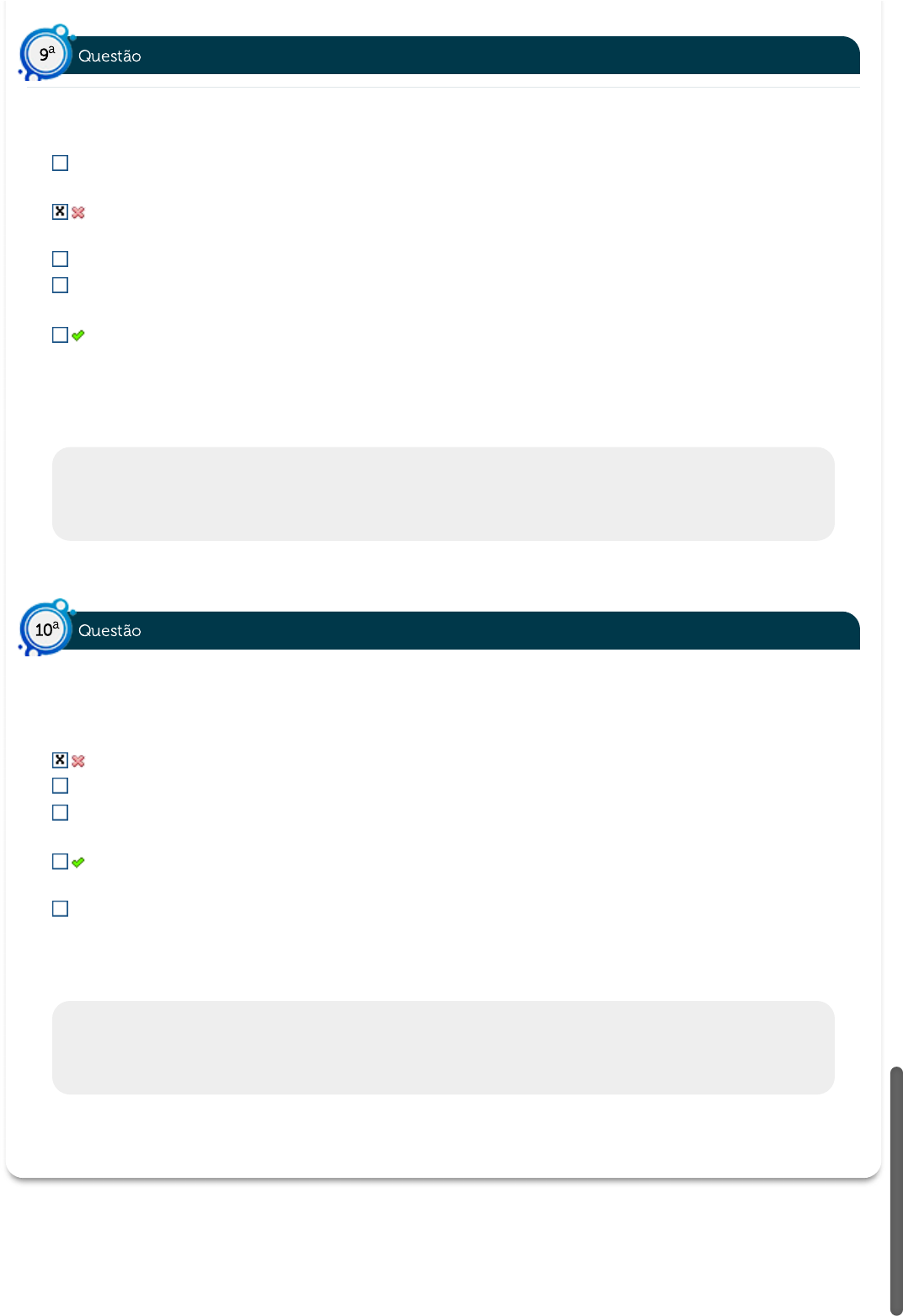 27/02/2023, 15:37 Estácio: Alunos https://simulado.estacio.br/alunos/ 1/1 Acerto: 0,0 / 1,0 Marque a alternativa que aponta as três subáreas da medicina veterinária que contribuem para a saúde pública animal: Vigilância, prevenção e controle de zoonoses; inocuidade alimentar; medicina veterinária preventiva de animais de pequeno porte Vigilância e controle de zoonoses; inocuidade alimentar; medicina veterinária preventiva Vigilância; prevenção e controle de zoonoses; inocuidade alimentar Vigilância e prevenção de zoonoses; inocuidade alimentar; medicina veterinária preventiva Vigilância, prevenção e controle de zoonoses; inocuidade alimentar; medicina veterinária preventiva Respondido em 24/03/2022 08:39:10 Explicação: A resposta correta é: Vigilância, prevenção e controle de zoonoses; inocuidade alimentar; medicina veterinária preventiva Acerto: 0,0 / 1,0 Todas as práticas abaixo podem ser realizadas em situações específicas, quando há normas e recomendações técnicas vigentes que recomendem seu uso, sem caracterizar maus-tratos, nos termos da Resolução n. 1.236/2018, EXCETO: A mutilação de animais. O abate de animais. O abate e a depopulação para fins de controle sanitário, especialmente de animais sinantrópicos. O abate e a depopulação para fins de controle estatístico, especialmente de animais sinantrópicos. A eutanásia. Respondido em 24/03/2022 08:40:56 Explicação: A resposta correta é: O abate e a depopulação para fins de controle estatístico, especialmente de animais sinantrópicos. Questão9 a Questão10 a
