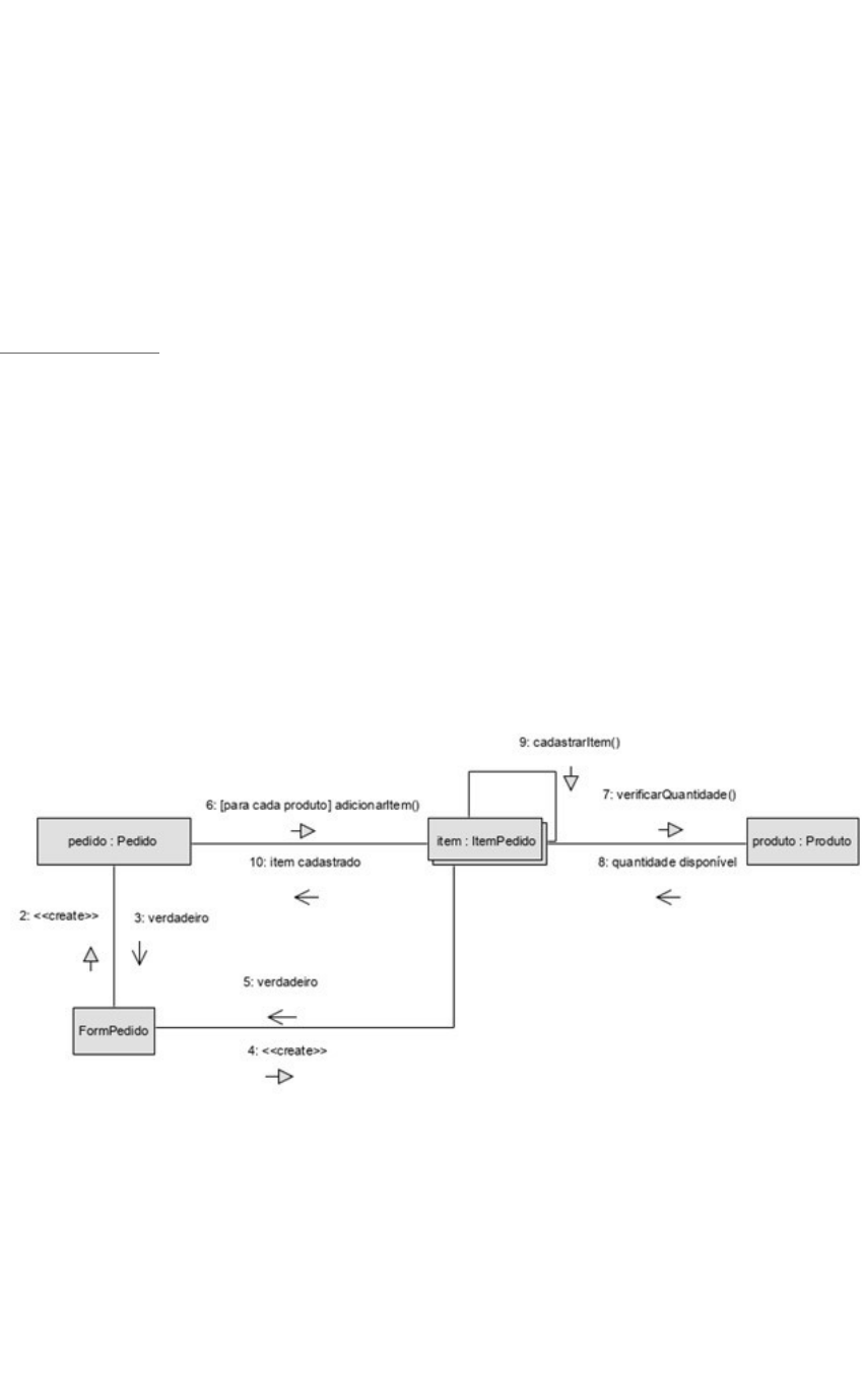 Informações Adicionais · Período: 06/02/2023 00:00 à 13/03/2023 23:59 · Situação: Cadastrado · Tentativas: 1 / 3 · Pontuação: 1500 · Protocolo: Avaliar Material 1) A ênfase do Diagrama de Comunicação está em demonstrar exatamente a ligação entre os objetos representados pela Lifeline, que participam da realização de um caso de uso. Segundo Guedes (2018), o Diagrama de Comunicação complementa o Diagrama de Sequência, concentrando-se na representação de como os elementos do diagrama estão vinculados e a ocorrência das mensagens que esses elementos trocam entre si durante a execução de um processo, normalmente baseado em um caso de uso, não se preocupando com a temporalidade do processo. A figura a seguir ilustra um recorte de um Diagrama de Comunicação, correspondente ao caso de uso “Realizar Pedido” de um sistema de vendas. Sobre os elementos representados no Diagrama de Comunicação, assinale a alternativa correta que condiz com a representação. Alternativas: · a) A mensagem “9:cadasstrarItem( )” representa uma mensagem construtora para o objeto “item:ItemPedido” · b) O elemento “produto:Produto” representa uma Linha de Vida (Lifeline), indicando uma coleção de instâncias da classe “Pedido”. · c) O elemento “item:ItemPedido” representa um Multiobjeto, ou seja, uma coleção de objetos de uma mesma classe, participando da interação. Alternativa assinalada · d) O elemento “FormPedido” representa uma Linha de Vida (Lifeline), indicando uma coleção de objetos do tipo interface do sistema. · e) O elemento “pedido:Pedido” representa uma Linha de Vida (Lifeline), indicando uma coleção de instâncias da classe “Pedido”. 2) Uma das formas mais utilizadas de especificar a interação entre os objetos é enfatizando à ordenação temporal das mensagens, representando a sequência lógica da troca de mensagens formada por um conjunto de objetos e seus relacionamentos, a partir da adoção do Diagrama de Sequência, o qual é uma forma de representar a ordem temporal em que as mensagens são trocadas entre os objetos envolvidos na execução de um processo, ou seja, na realização de um caso de uso. Sobre as possíveis trocas de mensagens que podem acontecer entre os elementos do Diagrama de sequência, julgue as afirmativas a seguir: I. Ator e Ator: indica uma comunicação entre os atores envolvidos na realização de um caso de uso. II. Ator e Objeto: geralmente o ator provoca um evento, enviando uma mensagem que dispara uma operação, contudo o ator pode simplesmente transmitir uma informação sem disparar uma operação. III. Objeto e Ator: indica o retorno de uma mensagem com a resposta que transmite uma mensagem reflexiva para o Ator. IV. Objeto e Objeto: indica o envio de uma mensagem, disparando uma operação, sendo que um objeto pode enviar uma mensagem para si mesmo, denominada de mensagem reflexiva. É correto o que se afirma em Alternativas: · a) I e II, apenas. · b) III e IV, apenas. · c) I, II e IV, apenas. Alternativa assinalada · d) II, III e IV, apenas. · e) I, II, III e IV. 3) Todo objeto do mundo real ou do mundo computacional assumem diferentes estados durante a sua existência, ou seja, durante seu ciclo de vida. Durante a execução de uma funcionalidade do sistema, um objeto muda de estado quando acontece algum evento interno ou externo ao sistema, provocando uma transição entre os estados do objeto e com isso, o objeto realiza determinadas ações responsáveis pela consistência e integridade dos dados do sistema. Para modelar os estados de um objeto usa-se o Diagrama de Máquina de Estados. Sobre a notação dos principais elementos do Diagrama de Máquina de Estados, julgue as afirmativas a seguir: I. O elemento “Estado Inicial” representa o estado de um objeto quando ele é criado. Pode haver vários estados iniciais em um diagrama de máquina de estados. II. O elemento “Estado Final” representa o fim do ciclo de vida de um objeto. Este estado é opcional e pode haver mais de um estado final em um diagrama de máquina de estados. III. O elemento “Estado” representa uma situação na vida de um objeto durante a qual ele satisfaz alguma condição ou realiza alguma atividade. IV. O elemento “Transição de Estado” representa uma associação entre os estados, com uma seta apontando para um dos estados. É correto o que se afirma em: Alternativas: · a) I e II, apenas. · b) III e IV, apenas. · c) I, II e IV, apenas. · d) II, III e IV, apenas. Alternativa assinalada · e) I, II, III e IV. 4) A empresa Lógica Soluções em TI está revisando a sua metodologia de desenvolvimento de sistemas de softwares e decidiu adotar o modelo de processo denominado - Processo Unificado Ágil (AUP - Agile Unified Process) que adota as atividades em fases clássicas do Processo Unificado – Concepção, Elaboração, Construção e Transição, fornecendo uma camada serial, ou seja, uma sequência linear de atividades de engenharia de software que permite a` equipe visualizar o fluxo do processo geral de um projeto de software. Decidiu-se também adotar algumas técnicas de modelagem da Unified Modeling Language (UML) para modelagem dos sistemas, entre elas, um diagrama de interação que demonstra a sequência de eventos que ocorrem em um determinado processo, identificando quais métodos devem ser disparados entre os atores e objetos envolvidos, representando a troca de mensagens sequenciais entre os objetos das classes. Considerando o contexto descrito, assinale a alternativa correta que indica o diagrama da UML que deve ser adotado para esse objetivo. Alternativas: · a) Diagrama de Pacotes. · b) Diagrama de Atividades. · c) Diagrama de Máquina de Estados. · d) Diagrama de Sequência. Alternativa assinalada · e) Diagrama de Visão Geral de Interação. 5) Na modelagem da atividade de Análise ou da atividade de Projeto, a melhor indicação de uso do Diagrama de Máqu