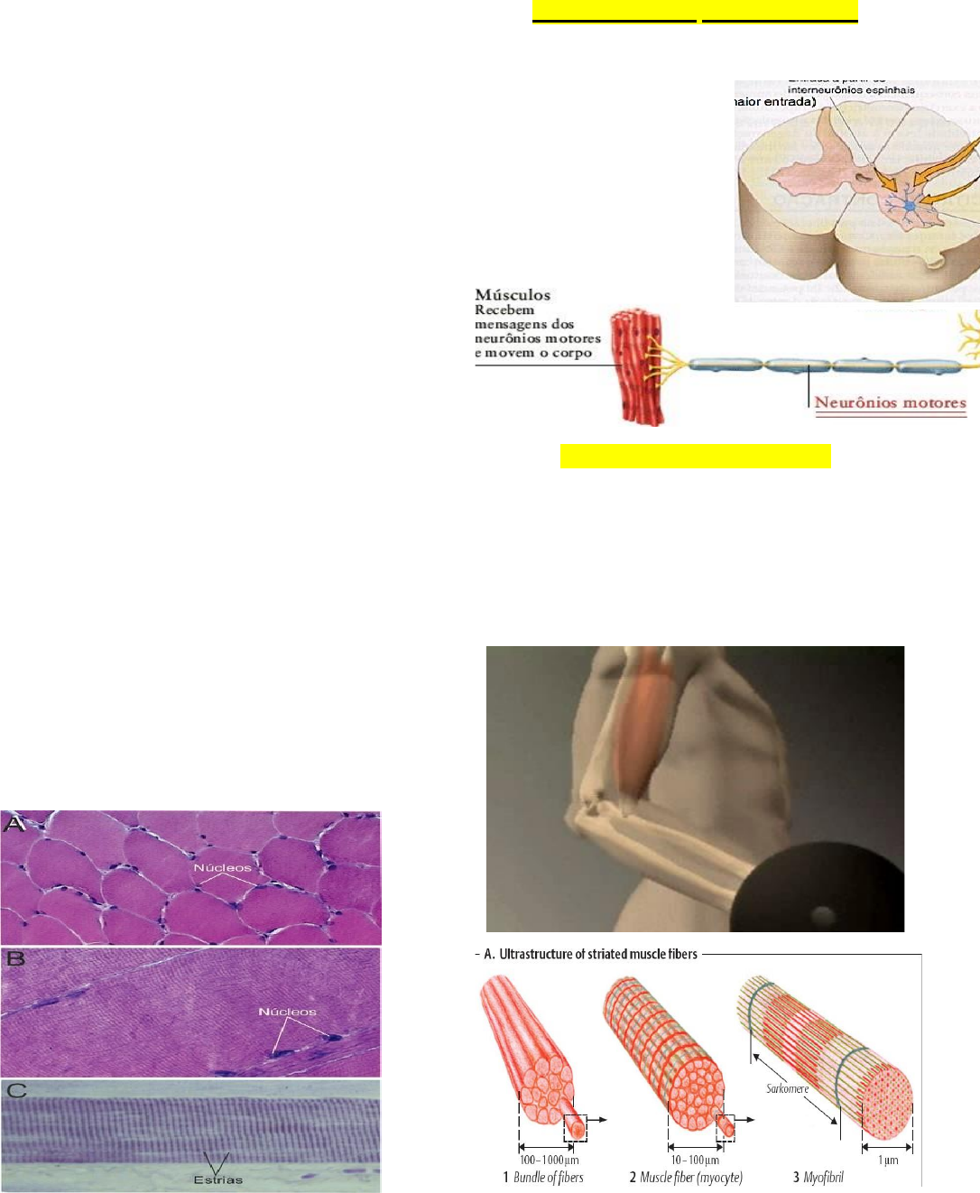 O músculo esquelético é um órgão especializado na transformação de energia química em movimento (energia mecânica), desenvolvido para otimizar esta função utilizando um conjunto bem ordenado de proteínas relacionadas com o movimento. Os 600 músculos esqueléticos do corpo humano são compostos de centenas a centenas de milhares de células alongadas, multinucleadas chamadas fibras musculares. Cada fibra contém as proteínas contrateis Miosina e Actina, que compõe os filamentos grossos e finos respectivamente, que estão dispostos paralelamente nas miofibrilas que compõe as fibras. As miofibrilas estão também paralelamente arranjadas e apresentam um padrão de bandas escuras e claras dispostas em série, que dão o caráter de estrias às fibras de tais músculos. Esta aparência estriada característica da miofibrila observável na microscopia de luz decorre da birrefringência diferente das proteínas contrateis:a banda clara, chamada banda-I, é devida a isotropia (I) da região da miofibrila dada pelos filamentos finos e a banda-A, devida a sua anisotropia(A), constituída pelos filamentos grossos intercalados aos finos. Os limites laterais da unidade contrátil chamada de sarcômero são dados pelos discos Z, constituídos por alfa Actinina, onde se ancoram os filamentos finos, a Tinina e a Nebulina. Na microscopia de luz o sarcômero é delimitado por duas linhas Z e contém duas banda-I e uma banda –A central separando-as. A contração é definida como a ativação das fibras musculares com a tendência destas se encurtarem. Ocorre quando o cálcio citosólico ([Ca 2+] i) aumenta disparando uma série de eventos moleculares que levam à interação entre miosina e actina, ocorrendo o deslizamento desta última sobre os filamentos grosso e o encurtamento dos sarcômeros em série. Conjuntos maciços ou frouxos de células alongadas capazes de mudar seu comprimento a;vamente. - Podem contrair-se ou relaxar-se sob: (i) controle direto/indireto de fibras nervosas (ii) de forma espontânea segundo rítmos intrínsecos produzidos. Músculo estriado ou Músculo voluntário Ligado aos ossos; move o esqueleto Estrutura do Músculo Esquelético • Feiche de fibras musculares • Fibra muscular • Miofibrila Fibra muscular ou Miofibrila: colunas paralelas filamentos grossos e finos A Unidade de Comando ou Unidade Motora Unidade funcional do movimento. -Motoneurônio + todas as fibras por ele inervadas - Cada neurônio motor se ramifica para inervar um número de fibras musculares -Quando o neurônio motor é ativado todas estas fibras musculares se contraem. Neurociências Deslocado a Tropomiosina, expondo os sítios das Act- Gs permitindo a interação com as projeções das cadeias de miosina, chamadas de cabeça, que constituem o filamento grosso. Numa reação que envolve a hidrólise de ATP, tem-se o deslizamento dos filamentos finos em relação aos filamentos grossos, com consequentes encurtamento dos sarcômeros (aproximação dos discos Z), com a produção de força ao longo da miofibrila. A formação de pontes entre Act-F e miosina é reversível, na presença de ATP, ocorrendo com a modificação da posição da cabeça da miosina de 45 à 90 graus, tendo um deslocamento de 100 Angstrons. A energia deste processo provém da hidrólise de ATP, liberando ADP e Pi (processo de transdução de energia). Mecanismo geral da contração muscular Músculo Esquelético: Teoria dos filamentos deslizantes Filamentos finos deslizam entre os filamentos grossos Contrações dos Músculos Esqueléticos Contração muscular • Gera Tensão • Realiza trabalho • O músculo esquelético pode contrair-se em graus distintos • Força de Contração é GRADUADA ou variada • POR QUÊ? • Ativação de número variável de neurônios motores implica em ativação variável de fibras musculares CONTRAÇÃO ISOTÔNICA: • Tensão ou Força gerada pelo músculo é maior que a carga • Músculo se encurta e movimenta carga • Força gerada maior que a força da gravidade CONTRAÇÃO ISOMÉTRICA: • tensão muscular não gera movimento • sem encurtar o comprimento externo Contração Muscular Graduada • O músculo esquelético pode contrair-se em graus distintos; • Recrutamento: aumentando o número de unidades motoras ativas aumentará a força da contração muscular; • Somação das unidades motoras uma contração se sobrepõe à outra; Músculo Liso ou INVOLUNTÁRIO ou Músculo das Víceras • Fibras muito pequenas (20-500um) • • Involuntário • Podem (auto) gerar potenciais de ação • Artérias/Veias: Motilidade, tensão • Víceras: Contrações alternadas das camadas circulares das víceras, produzindo ondas peristálticas • Na superfície das células musculares existem vesículas membranosas chamadas cavéolas. Similares ao retículo sarcoplasmático no músculo estriado: captura e liberação de Cálcio. Contém proteína calmodulina. Fatores de controle do músculo liso • Adrenalina • Noradrenalina • Acetilcolina • Angiotensina • Vasopressina • Oxitocina • Serotonina Fatores de controle do tônus dos vasos • Ausência de oxigênio nos tecidos locais produz relaxamento do músculo liso (vasodilatação) • O excesso de gás carbônico produz vasodilatação • O aumento da concentração de hidrogênio produz vasodilatação Músculo liso MULTI-UNITÁRIO: -Fibras musculares separadas que contraem independentemente. -Cobertos por colágeno e glicoproteínas. -Inervados por uma única fibra neural. EX: Músculo ciliar do olho, músculo piloeretor -Não estão eletricamente ligadas -A despolarização local gerada pelo transmissor se propagará e a célula se contrai -Fibras unidas pelas zonas de oclusão (ou gap junctions) que estão eletricamente ligadas. -Fibras estão agregadas em lâminas ou feixes e suas membranas celulares aderem entre si. -Força gerada em uma fibra é transmitida à seguinte. -Se contraem como uma UNI