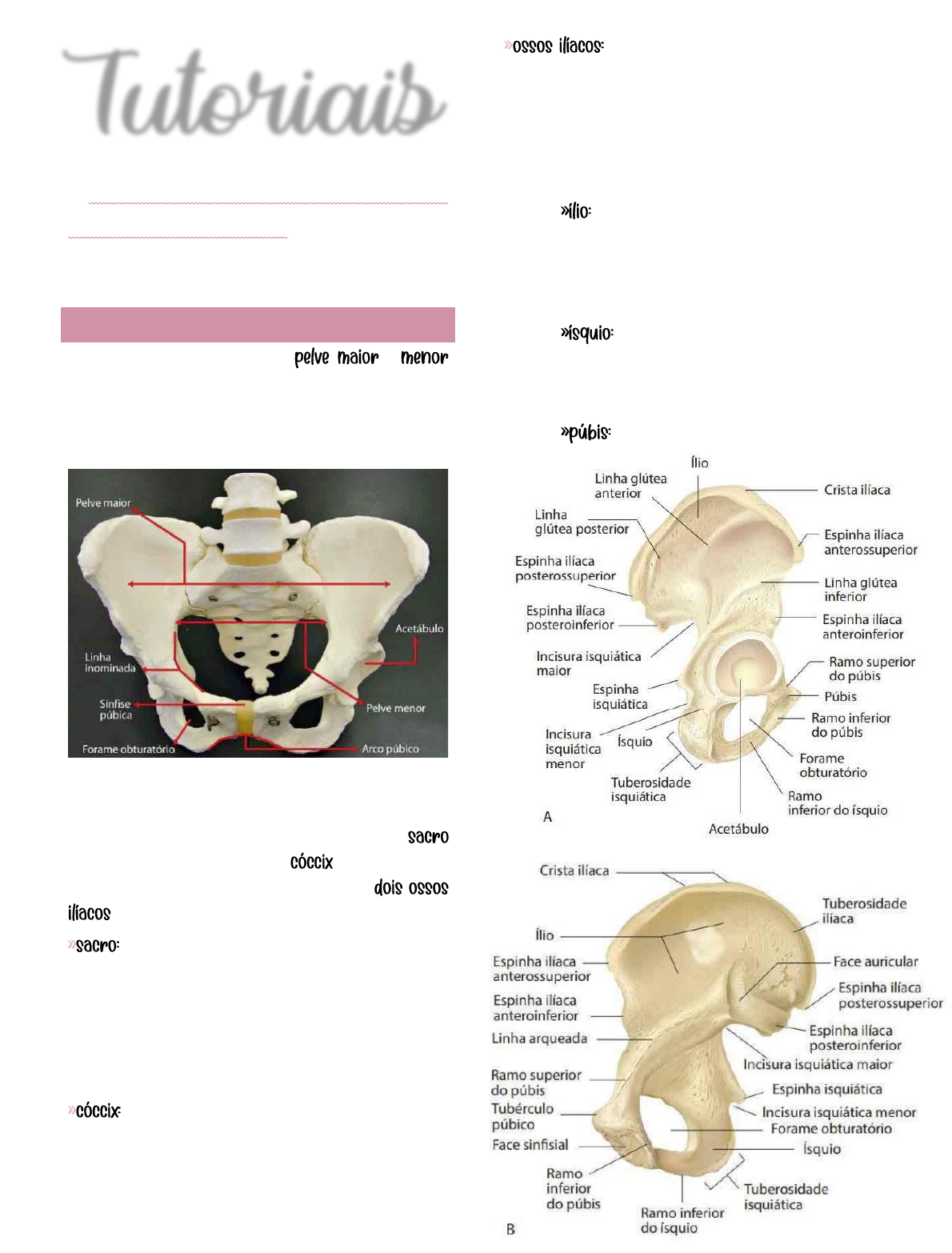 Nascimento, Crescimento e Desenvolvimento | Fernanda Ribeiro – MedUesb XVII Tutoriais Problema 1: Ter história de bons partos é suficiente? Conhecer a anatomia da pelve feminina e a sua relação com o parto ANATOMIA DA PELVE ÓSSEA A pelve ou bacia é dividida em e (bacia obstétrica), que são separadas pela linha inominada, uma margem óssea encurvada que vai do promontório sacral (articulação da vértebra L5 com a SI) até a margem superior da sínfise púbica. É constituída por quatro ossos que possuem uma forma anelar e através dos quais o peso do corpo é transmitido para os membros inferiores: (localizado na região posterior), (junto ao sacro, forma a parte inferior da coluna vertebral) e (lateralmente). localiza-se entre os dois ossos ilíacos e se articula com eles por meio da articulação sacroilíaca. Juntamente à vértebra L5, constitui o ângulo sacrovertebral, cujo vértice é denominado promontório sacral. Sua face anterior, voltada para a pelve, é côncava e apresenta algumas diferenças anatômicas de acordo com os vários tipos de bacia. é formado pela fusão de quatro vértebras rudimentares e se une ao sacro por meio da articulação sacrococcígea, que apresenta grande mobilidade durante o parto. o osso ilíaco é constituído pela fusão de três ossos (ílio, ísquio e púbis) em um processo que se completa entre os 15 e os 16 anos de idade. Na face lateral externa desse osso, em que ocorre a ossificação desses três ossos, há uma depressão circular grande denominado acetábulo. Essa depressão é o ponto de articulação da pelve com os membros inferiores. maior dos ossos pélvicos. Localiza-se na região mais superior. Possui uma crista e quatro ângulos (espinhas) que servem para inserções musculares. Sua face anterior é lisa e côncava, denominada fossa ilíaca. osso posteroinferior do quadril. Medialmente encontra-se a espinha isquiática, ponto de reparo importante na avaliação da descida fetal durante o trabalho de parto. osso anterior do quadril. Nascimento, Crescimento e Desenvolvimento | Fernanda Ribeiro – MedUesb XVII do ponto de vista obstétrico, para a avaliação da via de parto, é necessário apenas o conhecimento das dimensões da bacia menor. é limitada lateralmente pelas fossas ilíacas e posteriormente pela coluna vertebral. O limite anterior se faz com os músculos da parede anterior do abdômen. diâmetro biespinha estende-se da espinha ilíaca anterossuperior de um lado à do lado oposto e mede 24 cm; diâmetro bicrista vai do ponto mais alto da crista ilíaca de um lado até o lado oposto, medindo 28 cm. diâmetro sacropúbico externo, ou conjugara externa (diâmetro de Baudelocque), estende-se da fosseta situada abaixo do processo espinhoso da última vértebra lombar (LS) até a borda superior da sínfise púbica e mede 20 cm. também chamada de bacia obstétrica ou escavação. É dividida, didaticamente, nos estreitos superior, médio e inferior. delimitado, no sentido posteroanterior, pelo promontório sacral, pela borda anterior da asa do sacro, pela articulação sacroilíaca, pela linha inominada, pela eminencia ileopectínea e pela borda superior da sínfese púbica. Apresenta dois diâmetros anteroposteriores, dois diâmetros transversos e dois oblíquos. O diâmetro anterior, com menor interesse obstétrico, é traçado do promontório até a borda superior da sínfise púbica, cujo nome é diãmetro promontossuprapúbico (conjugata vera anatômica) e mede 11 cm. Entretanto, como diâmetro anterior e de maior interesse obstétrico, medindo de 10,5 a 11 cm, deve ser conhecido o (conjugata vera obstétrica ou diâmetro útil de Pinard), traçado do promontório à face posterior da sínfise púbica, mais precisamente até o ponto retrossinfisário de Crouzat, situado 3 a 4 mm abaixo da borda superior da sínfise púbica. Os são denominados , do ponto mais afastado da linha inominada de um lado à linha do lado oposto, com 13 a 13,5 cm; e , que se estende na mediana da conjugata vera anatômica e mede 12 cm. Os , também chamados de , vão de uma eminência ileopectínea de um lado à articulação sacroilíaca contralateral; primeiro oblíquo, o que parte da eminência ileopectínea esquerda, e segundo oblíquo, o que sai da eminência ileopectínea direita. Eles medem aproximadamente 12 cm cada e o primeiro é diretamente maior que o segundo (Eles são nomeados de acordo com a frequência de insinuação). delimitado no sentido posteroanterior pela concavidade do osso sacro até a margem inferior da sínfise púbica. Apresenta dois diâmetros principais: (anteroposterior), que vai do meio da concavidade do osso sacro (S4/S5) até o meio da face posterior da sínfise púbica, medindo 12 cm; e o (transverso), que se estende de uma espinha isquiática à outra, mede 10,5 cm e é o ponto de maior estreitamento do canal de parto. delimitado no sentido posteroanterior pela ponta do cóccix, estende- se pela borda inferior do grande ligamento sacroisquiático até atingir a borda inferior da sínfise púbica. o diâmetro , que se estende da ponta do cóccix à borda inferior da sínfise púbica e mede 9,5 cm, é de interesse obstétrico e, na fase final da expulsão fetal após a retropulsão do cóccix, amplia-se em 2 a 3 cm, recebendo o nome de conjugata exitus. Nascimento, Crescimento e Desenvolvimento | Fernanda Ribeiro – MedUesb XVII segundo classificação tradicional estabelecida por Caldwell e Moloy em 1933, há quatro tipos de bacia, classificados com base na forma do estreito superior: , , e A raça, as condições socioeconômicas, a atividade física, as características nutricionais da infância e da adolescência, além do habitat, interferem na formação da bacia. Assim, bacias das negras tendem para o tipo antropoide (conjugata vera obstétrica mais longa que o diâmetro transverso do estreito superior), que é favorável ao parto, graças à maior amplitude da hemipelve posterior. E mulhe