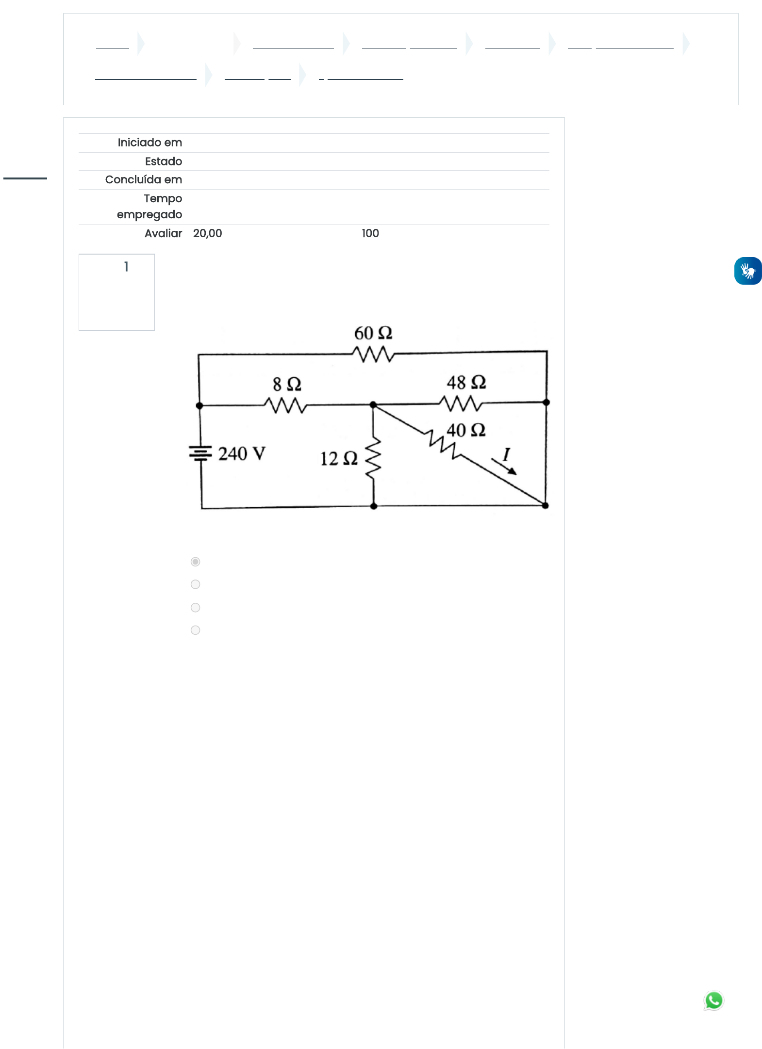 24/02/2023, 15:57 QUESTIONÁRIO 1 https://ava.funec.br/mod/quiz/review.php?attempt=399162&cmid=13123 1/4 Painel Meus cursos CURSOS FUNEC Graduação - EAD Aluno EAD JUNÇÕES DE TURMA Circuitos Elétricos I AVALIAÇÕES QUESTIONÁRIO 1 Questão 1 Completo Atingiu 2,00 de 2,00 Iniciado em Friday, 24 Feb 2023, 15:52 Estado Finalizada Concluída em Friday, 24 Feb 2023, 15:56 Tempo empregado 4 minutos 39 segundos Avaliar 20,00 de um máximo de 20,00(100%) Utilizando a associação de resistores e o método de divisão de corrente por duas vezes, encontre a corrente I no circuito a seguir: Escolha uma opção: a. 2,9 A b. 3,2 A c. 0,5 A d. 61,0 A https://ava.funec.br/my/ https://ava.funec.br/course/index.php?categoryid=10 https://ava.funec.br/course/index.php?categoryid=17 https://ava.funec.br/course/index.php?categoryid=19 https://ava.funec.br/course/index.php?categoryid=77 https://ava.funec.br/course/view.php?id=621 https://ava.funec.br/course/view.php?id=621#section-5 https://ava.funec.br/mod/quiz/view.php?id=13123 javascript:void(0); https://ava.funec.br/user/index.php?id=621 https://ava.funec.br/badges/view.php?type=2&id=621 https://ava.funec.br/admin/tool/lp/coursecompetencies.php?courseid=621 https://ava.funec.br/grade/report/index.php?id=621 https://ava.funec.br/my/ https://ava.funec.br/?redirect=0 https://ava.funec.br/calendar/view.php?view=month&course=621 javascript:void(0); https://ava.funec.br/user/files.php https://ava.funec.br/course/view.php?id=324 https://ava.funec.br/course/view.php?id=757 https://ava.funec.br/course/view.php?id=342 https://ava.funec.br/course/view.php?id=624 https://ava.funec.br/course/view.php?id=819 https://ava.funec.br/course/view.php?id=896 https://ava.funec.br/course/view.php?id=488 https://ava.funec.br/course/view.php?id=621 https://ava.funec.br/course/view.php?id=698 https://ava.funec.br/course/view.php?id=957 https://ava.funec.br/my/ 24/02/2023, 15:57 QUESTIONÁRIO 1 https://ava.funec.br/mod/quiz/review.php?attempt=399162&cmid=13123 2/4 Questão 2 Completo Atingiu 2,00 de 2,00 Questão 3 Completo Atingiu 2,00 de 2,00 Questão 4 Completo Atingiu 2,00 de 2,00 Encontre a corrente I para o circuito a seguir, utilizando uma transformação Δ-Y: Escolha uma opção: a. 5,4 A b. 32,7 A c. 12,6 A d. 11,4 A Encontre a corrente que flui através do bulbo de uma lâmpada para um deslocamento de 6 x 10 elétrons em 5h. Lembre-se que: e = -1,6 x 10 C. Escolha uma opção: a. -5,3 A b. 3,3 A c. -3,3 A d. -19,2 A 23 -19 Qual a corrente máxima pode ser aplicada a um resistor que suporta sem se danificar 1 W, cujas faixas possuem as cores: marrom-cinza-laranja-prata? (Considere o valor nominal do resistor). Escolha uma opção: a. 9,13 mA b. 7,45 mA c. 8,35 A d. 5,55 mA javascript:void(0); https://ava.funec.br/user/index.php?id=621 https://ava.funec.br/badges/view.php?type=2&id=621 https://ava.funec.br/admin/tool/lp/coursecompetencies.php?courseid=621 https://ava.funec.br/grade/report/index.php?id=621 https://ava.funec.br/my/ https://ava.funec.br/?redirect=0 https://ava.funec.br/calendar/view.php?view=month&course=621 javascript:void(0); https://ava.funec.br/user/files.php https://ava.funec.br/course/view.php?id=324 https://ava.funec.br/course/view.php?id=757 https://ava.funec.br/course/view.php?id=342 https://ava.funec.br/course/view.php?id=624 https://ava.funec.br/course/view.php?id=819 https://ava.funec.br/course/view.php?id=896 https://ava.funec.br/course/view.php?id=488 https://ava.funec.br/course/view.php?id=621 https://ava.funec.br/course/view.php?id=698 https://ava.funec.br/course/view.php?id=957 https://ava.funec.br/my/ 24/02/2023, 15:57 QUESTIONÁRIO 1 https://ava.funec.br/mod/quiz/review.php?attempt=399162&cmid=13123 3/4 Questão 5 Completo Atingiu 2,00 de 2,00 Questão 6 Completo Atingiu 2,00 de 2,00 Questão 7 Completo Atingiu 2,00 de 2,00 Questão 8 Completo Atingiu 2,00 de 2,00 Um cabo de alta tensão de alumínio possui uma resistência de 80 Ω a 30º C. Sabendo que a temperatura inferida para resistência zero do alumínio é – 236º C, qual a sua resistência quando a sua temperatura vai a – 5º C? Escolha uma opção: a. 73,38 Ω b. 68,57 Ω c. 88,54 Ω d. 93,35 Ω Encontre a tensão sobre uma torradeira que consome 7500 J quando percorrida por uma corrente de 12,5 A durante 8s? Escolha uma opção: a. 937,5 V b. 100 V c. 75 V d. 600 V A resistência de um determinado condutor é 25 Ω. Qual a queda de tensão em um outro condutor do mesmo material e à mesma temperatura, que possui o dobro do diâmetro e seis vezes o comprimento, se por este condutor, circular uma corrente de 2,5 A? Escolha uma opção: a. 93,75 V b. 20,83 V c. 187,50 V d. 62,50 V Para se ter um consumo de apenas 90 kWh, por quanto tempo pode funcionar um motor de 5 hp operando com uma eficiência de 87 %? Lembre-se que: 1 hp = 746 W. Escolha uma opção: a. 15,7 h b. 75,6 h c. 24,1 h d. 21 h javascript:void(0); https://ava.funec.br/user/index.php?id=621 https://ava.funec.br/badges/view.php?type=2&id=621 https://ava.funec.br/admin/tool/lp/coursecompetencies.php?courseid=621 https://ava.funec.br/grade/report/index.php?id=621 https://ava.funec.br/my/ https://ava.funec.br/?redirect=0 https://ava.funec.br/calendar/view.php?view=month&course=621 javascript:void(0); https://ava.funec.br/user/files.php https://ava.funec.br/course/view.php?id=324 https://ava.funec.br/course/view.php?id=757 https://ava.funec.br/course/view.php?id=342 https://ava.funec.br/course/view.php?id=624 https://ava.funec.br/course/view.php?id=819 https://ava.funec.br/course/view.php?id=896 https://ava.funec.br/course/view.php?id=488 https://ava.funec.br/course/view.php?id=621 https://ava.funec.br/course/view.php?id=698 https://ava.funec.br/course/view.php?id=957 https://ava.funec.br/my/ 24/02/2023, 15:57 QUESTIONÁRIO 1 https://ava.funec.br/mod/quiz/review.php?attempt=399162&cmid=13123 4/4 Questão 9 Completo Atingiu 2,00 de 2,00 Questão 10 Completo Atingiu 2,00 de 2,00 Use o método de divisão de tensão 