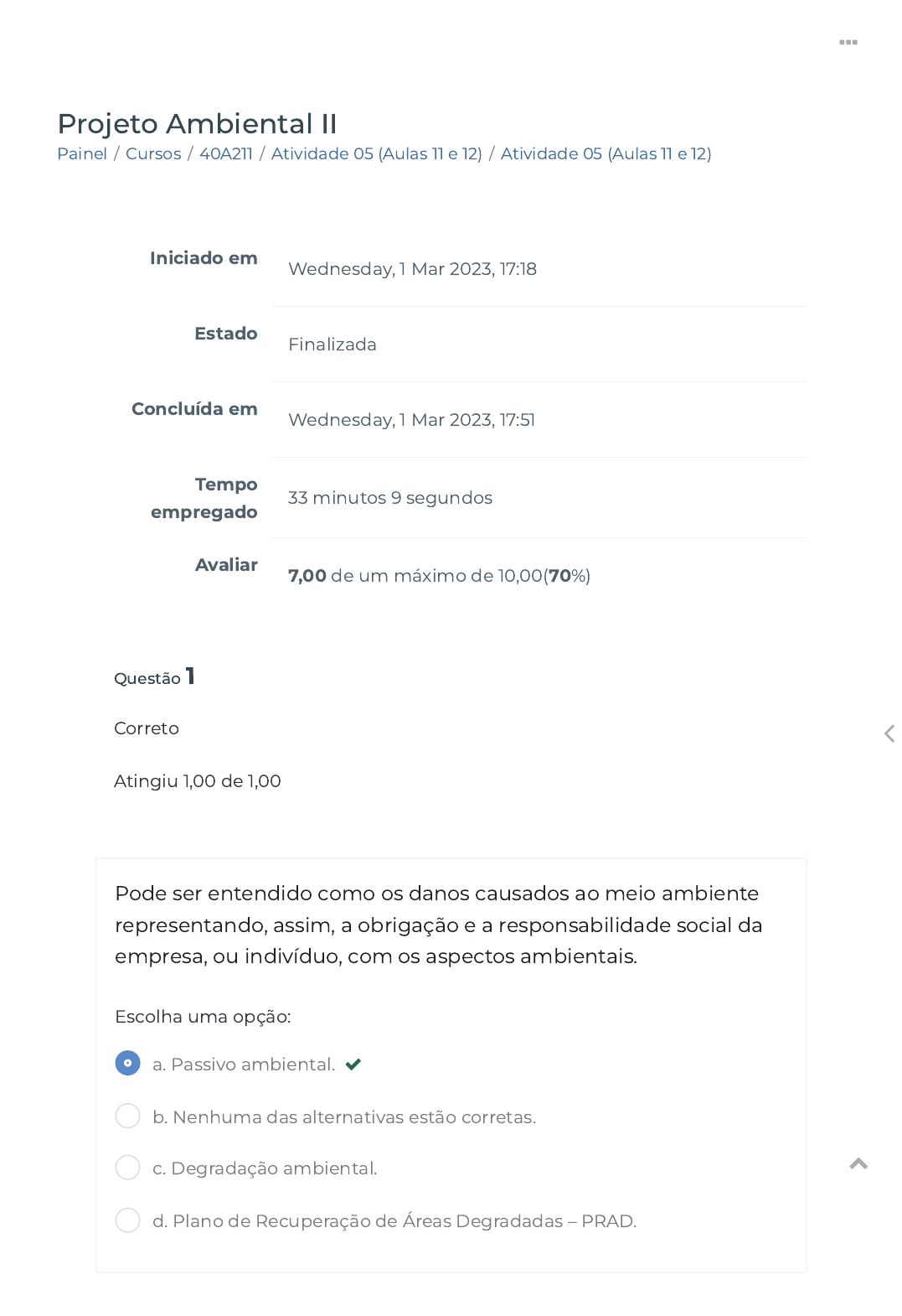 Painel / Cursos / 40A211 / Atividade 05 (Aulas 11 e 12) / Atividade 05 (Aulas 11 e 12) Projeto Ambiental II Iniciado em Wednesday, 1 Mar 2023, 17:18 Estado Finalizada Concluída em Wednesday, 1 Mar 2023, 17:51 Tempo empregado 33 minutos 9 segundos Avaliar 7,00 de um máximo de 10,00(70%) Questão 1 Correto Atingiu 1,00 de 1,00 Pode ser entendido como os danos causados ao meio ambiente representando, assim, a obrigação e a responsabilidade social da empresa, ou indivíduo, com os aspectos ambientais. Escolha uma opção: a. Passivo ambiental. b. Nenhuma das alternativas estão corretas. c. Degradação ambiental. d. Plano de Recuperação de Áreas Degradadas – PRAD. https://ava.politecnicabr.com.br/my/ https://ava.politecnicabr.com.br/course/index.php https://ava.politecnicabr.com.br/course/view.php?id=1053 https://ava.politecnicabr.com.br/course/view.php?id=1053#section-18 https://ava.politecnicabr.com.br/mod/quiz/view.php?id=33710 https://ava.politecnicabr.com.br/ https://ava.politecnicabr.com.br/ Questão 2 Incorreto Atingiu 0,00 de 1,00 Marque a alternativa incorreta quando ao planejamento de um projeto em Educação Ambiental. Escolha uma opção: a. estar na vanguarda do processo educativo. b. objetivos claros e possibilidades de realização. c. todas as alternativas estão corretas. d. envolver o maior número de pessoas, ações e instituições. e. maximizar os recursos já disponíveis. https://ava.politecnicabr.com.br/ https://ava.politecnicabr.com.br/ Questão 3 Incorreto Atingiu 0,00 de 1,00 Marque a alternativa incorreta quando as principais alterações em paisagem urbana. Escolha uma opção: a. a inutilização da camada fértil do solo provoca pouco poder de recuperação em áreas destinadas a jardinamento, paisagismo e etc. b. paisagem pouco alterada, derivada de área já consolidada, com características já alteradas, mas considerada de um sistema. c. em ambientes urbanos, animais (ratos, baratas, pombos e outros), encontram abrigo e alimentação abundantes, o que provoca um aumento populacional, esperado em termos biológicos. d. em área urbana a vegetação tende a ser heterogênea, com o plantio de espécies exóticas, mas in�uenciando pouco nas espécies de fauna local. https://ava.politecnicabr.com.br/ https://ava.politecnicabr.com.br/ Questão 4 Correto Atingiu 1,00 de 1,00 Assinale (V) Verdadeiro e (F) Falso: ( ) O Planejamento de projetos em Educação Ambiental tem como �nalidade criar um projeto que um grupo multidisciplinar, gestor do processo, possa ter como parâmetro para acompanhar o desenvolvimento de ações relacionadas à melhoria de aspectos relativos à promoção educacional na área do meio ambiente. ( ) O Planejamento de projetos em Educação Ambiental está voltado para a formação de pessoas, portanto está implícita a permanência e a continuidade de pessoas e ações para atingir estados futuros desejados, com propostas de transformação socioambiental. ( ) O Planejamento de Projetos em Educação Ambiental PPEA tem como princípios seus produtos e projetos. ( ) A prática de desenvolvimento do Projeto Político-Pedagógico faz parte de nossa cultura, uma vez que estamos acostumados com o currículo e procedimentos ditados pelos órgãos centrais, cabendo às equipes executoras o envio dos relatórios do que foi realizado. Escolha uma opção: a. V, V, F, F. b. V, V, V, V. c. V, F, F, V. d. F, F, F, V. e. V, F, F, F. https://ava.politecnicabr.com.br/ https://ava.politecnicabr.com.br/ Questão 5 Incorreto Atingiu 0,00 de 1,00 Pode ser entendido como paisagem urbana. Escolha uma opção: a. paisagem alterada, derivada de área natural, porém com características já próprias, a ponto de considerar um ecossistema. b. paisagem pouco alterada, derivada de área já consolidada, com características já alteradas, mas considerada de um sistema. c. paisagem pouco alterada, derivada de área já consolidada, com características já alteradas. d. paisagem alterada, derivada de área natural, porém com características já próprias, mas não sendo considerado um ecossistema. https://ava.politecnicabr.com.br/ https://ava.politecnicabr.com.br/ Questão 6 Correto Atingiu 1,00 de 1,00 Marque a alternativa correta quando aos princípios do PPEA. Escolha uma opção: a. caracterizar o espaço territorial almejado. b. maximizar os recursos já disponíveis. c. todas as alternativas estão corretas. d. envolver o maior número de pessoas, ações e instituições. e. estar na vanguarda do processo educativo. https://ava.politecnicabr.com.br/ https://ava.politecnicabr.com.br/ Questão 7 Correto Atingiu 1,00 de 1,00 Qual conceito de planejar de acordo com Gandin: Escolha uma opção: a. Planejar Advém o planejamento, que compreende o empreendi- mento que se realiza por meio de determinação de objetivos e metas, coordenação de meios e recursos e plani�cação de todo o processo. b. Planejar remete a termos como planear, plano no ar, ato de projetar um trabalho, um serviço ou ação complexa. c. Planejar é o processo de busca de equilíbrio entre meios e �ns, entre recursos e objetivos, visando ao melhor funcionamento de empresas, instituições, setores de trabalho, organizações, grupos e outras atividades humanas. d. Planejar é uma atividade que está dentro da educação, visto que esta tem como características básicas evitar a improvisação, prever o futuro, estabelecer caminhos que possam nortear mais apropriadamente a execução da ação educativa e prever o acompanhamento e a avaliação da própria ação. Planejar e avaliar andam de mãos dadas. https://ava.politecnicabr.com.br/ https://ava.politecnicabr.com.br/ Questão 8 Correto Atingiu 1,00 de 1,00 Em que ano ocorreu o vazamento nas instalações da Petrobras, que provocou o derramamento de milhares de litros de óleo na Baía da Guanabara, causando a morte de várias espécies de aves e peixes, além de afetar seriamente a vida das populações locais que viv