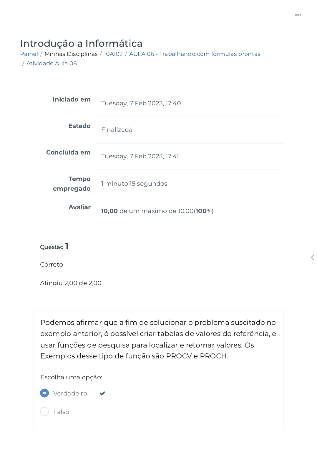 10/02/2023 20:01 Atividade Aula 06 https://ava.politecnicabr.com.br/mod/quiz/review.php?attempt=4333960 1/4 Painel / Minhas Disciplinas / 10A102 / AULA 06 - Trabalhando com fórmulas prontas / Atividade Aula 06 Introdução a Informática Iniciado em Tuesday, 7 Feb 2023, 17:40 Estado Finalizada Concluída em Tuesday, 7 Feb 2023, 17:41 Tempo empregado 1 minuto 15 segundos Avaliar 10,00 de um máximo de 10,00(100%) Questão 1 Correto Atingiu 2,00 de 2,00 Podemos a�rmar que a �m de solucionar o problema suscitado no exemplo anterior, é possível criar tabelas de valores de referência, e usar funções de pesquisa para localizar e retornar valores. Os Exemplos desse tipo de função são PROCV e PROCH. Escolha uma opção: Verdadeiro Falso https://ava.politecnicabr.com.br/my/ https://ava.politecnicabr.com.br/course/view.php?id=829 https://ava.politecnicabr.com.br/course/view.php?id=829#section-22 https://ava.politecnicabr.com.br/mod/quiz/view.php?id=38314 https://ava.politecnicabr.com.br/ 10/02/2023 20:01 Atividade Aula 06 https://ava.politecnicabr.com.br/mod/quiz/review.php?attempt=4333960 2/4 Questão 2 Correto Atingiu 2,00 de 2,00 Tratando-se de Segmentação de textos no Excel podemos a�rmar que é possível capturar partes de um texto de acordo com a necessidade, segmentando o seu início, meio ou �m. Escolha uma opção: Questão 3 Correto Atingiu 2,00 de 2,00 Podemos a�rmar que A �m de veri�car todas as fórmulas lógicas existentes no Microsoft Excel, é possível acessar a faixa de opções Fórmulas, e na seção Biblioteca de funções clicar no item Lógicas. Escolha uma opção: Verdadeiro Falso Verdadeiro Falso https://ava.politecnicabr.com.br/ 10/02/2023 20:01 Atividade Aula 06 https://ava.politecnicabr.com.br/mod/quiz/review.php?attempt=4333960 3/4 Questão 4 Correto Atingiu 2,00 de 2,00 Tratando-se de Fórmulas matemáticas no Excel julgue as a�rmativas a seguir. ( ) Pensando que no trato de planilhas eletrônicas os cálculos matemáticos têm grande importância, as fórmulas matemáticas possuem uma categoria exclusiva, denominada matemática e trigonometria. ( ) O que é fundamental aprender, em termos de fórmulas prontas no Microsoft Excel, é o funcionamento global da aplicação de fórmulas. ( ) Para fazer uso de fórmulas prontas, os de referências relativas e absolutas, bem como os conceitos de copiar e arrastar, continuam valendo. Escolha uma opção: a. V, V, V b. F, F, V c. V, F, F d. F, V, V e. V, F, V https://ava.politecnicabr.com.br/ 10/02/2023 20:01 Atividade Aula 06 https://ava.politecnicabr.com.br/mod/quiz/review.php?attempt=4333960 4/4 © 2022 - Escola Politécnica Brasileira Questão 5 Correto Atingiu 2,00 de 2,00 Podemos a�rmar que as funções de data e hora são, como o próprio nome sugere, aplicados sobre valores de data. Escolha uma opção: Verdadeiro Falso Entre em Contato https://www.politecnicabr.com.br 0800 084 2627 0800 084 2627 Links Úteis Dicas da nossa Diretora Acadêmica Planner de Estudos Declaração de Matrícula Orientações do AVA Abertura de Ticket Fale com o Tutor Cronograma de Estudos Manual de Estágio Manual de Competência Siga-nos nas redes sociais https://ava.politecnicabr.com.br/mod/quiz/0 https://www.politecnicabr.com.br/ https://soundcloud.com/user-501638417/sets/escola-politecnica-brasileira https://storage.googleapis.com/sirius-pubstore/semestre_plannerdeestudo%20poli.pdf https://storage.googleapis.com/sirius-pubstore/declaracao_matricula.pdf https://storage.googleapis.com/sirius-pubstore/orientacoes_ava.pdf https://storage.googleapis.com/sirius-pubstore/abertura_ticket.pdf https://storage.googleapis.com/sirius-pubstore/fale_com_tutor.pdf https://storage.googleapis.com/sirius-pubstore/cronograma_estudos.pdf https://storage.googleapis.com/sirius-pubstore/manual_estagio.pdf https://storage.googleapis.com/sirius-pubstore/manual_competencia.pdf https://www.facebook.com/politecnicabr https://www.instagram.com/politecnicabr_oficial https://ava.politecnicabr.com.br/