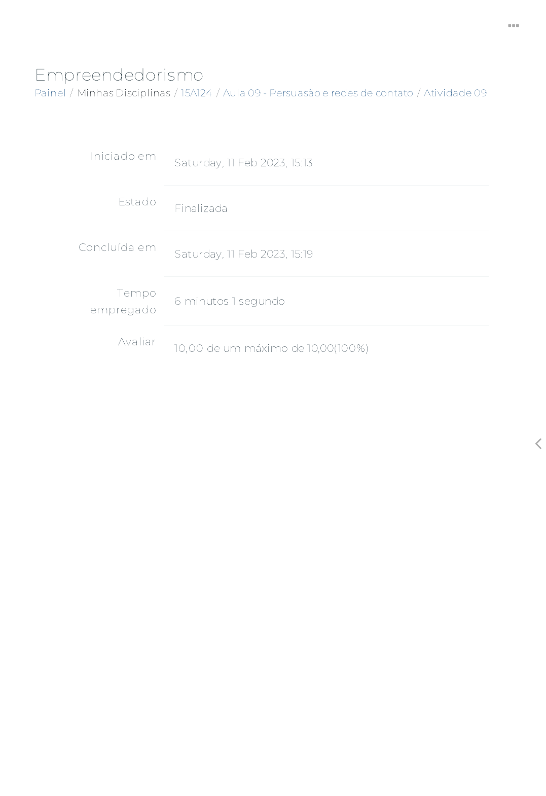 01/03/2023 12:48 Atividade 09 https://ava.politecnicabr.com.br/mod/quiz/review.php?attempt=4359217 1/6 Painel / Minhas Disciplinas / 15A124 / Aula 09 - Persuasão e redes de contato / Atividade 09 Empreendedorismo Iniciado em Saturday, 11 Feb 2023, 15:13 Estado Finalizada Concluída em Saturday, 11 Feb 2023, 15:19 Tempo empregado 6 minutos 1 segundo Avaliar 10,00 de um máximo de 10,00(100%) https://ava.politecnicabr.com.br/my/ https://ava.politecnicabr.com.br/course/view.php?id=883 https://ava.politecnicabr.com.br/course/view.php?id=883#section-10 https://ava.politecnicabr.com.br/mod/quiz/view.php?id=29057 https://ava.politecnicabr.com.br/ 01/03/2023 12:48 Atividade 09 https://ava.politecnicabr.com.br/mod/quiz/review.php?attempt=4359217 2/6 Questão 1 Correto Atingiu 1,43 de 1,43 Ao desenvolver o modelo de competências empreendedoras, McClelland (1987) identi�cou duas competências relacionadas à necessidade de poder. Quais são elas? Escolha uma opção: a. as competências e o estabelecimento de redes de contato. b. a persuasão e o estabelecimento de redes de contato. c. a persuasão e as competências. https://ava.politecnicabr.com.br/ 01/03/2023 12:48 Atividade 09 https://ava.politecnicabr.com.br/mod/quiz/review.php?attempt=4359217 3/6 Questão 2 Correto Atingiu 1,43 de 1,43 Pode inferir que liderança signi�ca atingir objetivos com e por meio de pessoas. Escolha uma opção: Questão 3 Correto Atingiu 1,43 de 1,43 O estilo democrático se baseia na ideia de que o poder do líder é decorrente da posição que ocupa e de que as pessoas são preguiçosas e irresponsáveis por natureza (visão conhecida como Teoria X), enquanto o estilo autoritário supõe que o poder do líder é conferido pelo grupo liderado e que as pessoas podem basicamente dirigir-se a si mesmas e ser criativas no trabalho, desde que adequadamente motivadas (abordagem denominada Teoria Y). Escolha uma opção: Verdadeiro Falso Verdadeiro Falso https://ava.politecnicabr.com.br/ 01/03/2023 12:48 Atividade 09 https://ava.politecnicabr.com.br/mod/quiz/review.php?attempt=4359217 4/6 Questão 4 Correto Atingiu 1,43 de 1,43 Uma ferramenta muito útil é o denominado “mapa de poder” (COOLEY, 1991), que classi�ca o poder em quantas áreas? Escolha uma opção: Questão 5 Correto Atingiu 1,42 de 1,42 O mapa de poder é uma coisa estática. Uma pessoa que hoje se encontra em sua área de in�uência não pode migrar para sua área de controle e vice-versa. Escolha uma opção: a. 6 b. 3 c. 2 d. 4 e. 5 Verdadeiro Falso https://ava.politecnicabr.com.br/ 01/03/2023 12:48 Atividade 09 https://ava.politecnicabr.com.br/mod/quiz/review.php?attempt=4359217 5/6 Questão 6 Correto Atingiu 1,43 de 1,43 O poder não é exercido apenas dentro da organização mas também fora dela, envolvendo o mapeamento de pessoas-chave em outras organizações e a formulação de estratégias de persuasão. Escolha uma opção: Questão 7 Correto Atingiu 1,43 de 1,43 Empreendedores de sucesso desempenham o papel de líderes, sendo que seu estilo de liderança sofre in�uência direta das características de sua personalidade, como motivação, forma de captar informações e processá-las (decidir). Escolha uma opção: Verdadeiro Falso Verdadeiro Falso https://ava.politecnicabr.com.br/ 01/03/2023 12:48 Atividade 09 https://ava.politecnicabr.com.br/mod/quiz/review.php?attempt=4359217 6/6 © 2022 - Escola Politécnica Brasileira Entre em Contato https://www.politecnicabr.com.br 0800 084 2627 0800 084 2627 Links Úteis Dicas da nossa Diretora Acadêmica Planner de Estudos Declaração de Matrícula Orientações do AVA Abertura de Ticket Fale com o Tutor Cronograma de Estudos Manual de Estágio Manual de Competência Siga-nos nas redes sociais https://ava.politecnicabr.com.br/mod/quiz/0 https://www.politecnicabr.com.br/ https://soundcloud.com/user-501638417/sets/escola-politecnica-brasileira https://storage.googleapis.com/sirius-pubstore/semestre_plannerdeestudo%20poli.pdf https://storage.googleapis.com/sirius-pubstore/declaracao_matricula.pdf https://storage.googleapis.com/sirius-pubstore/orientacoes_ava.pdf https://storage.googleapis.com/sirius-pubstore/abertura_ticket.pdf https://storage.googleapis.com/sirius-pubstore/fale_com_tutor.pdf https://storage.googleapis.com/sirius-pubstore/cronograma_estudos.pdf https://storage.googleapis.com/sirius-pubstore/manual_estagio.pdf https://storage.googleapis.com/sirius-pubstore/manual_competencia.pdf https://www.facebook.com/politecnicabr https://www.instagram.com/politecnicabr_oficial https://ava.politecnicabr.com.br/