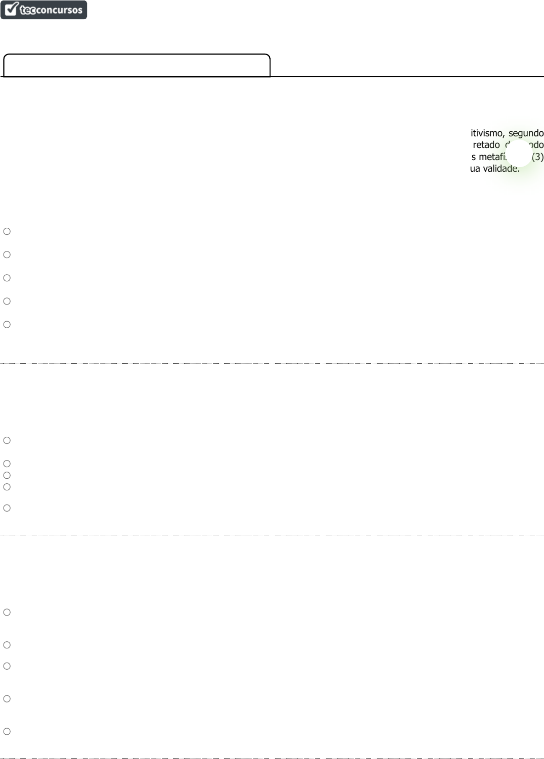 Teoria Geral e Filosofia do Direito para OAB Exame XXXVII - 2023_2023-03-02_07:46 ( https://www.tecconcursos.com.br/s/Q2ZYvv ) Ordenação: Por Matéria Teoria Geral, Filosofia e Sociologia Jurídica Questão 1: FGV - PJ (MPE GO)/MPE GO/2022 Assunto: Juspositivismo e Jusnaturalismo Pedro, professor emérito de direito constitucional, apresentou aos seus alunos três concepções distintas de positivismo, segundo as quais o direito (1) deve ser coativo, legal e imperativo, tendo coerência e completude, e sendo interpretado de modo mecânico; (2) deve ser descrito, enquanto dever ser objetivo, não se compatibilizando com o uso de proposições metafísicas; (3) encontra sustentação no fato de uma comunidade poder decidir que normas o integram, definindo, com isso, a sua validade. As concepções descritas em (1), (2) e (3) indicam, respectivamente: a) o positivismo enquanto método, de Bobbio; o positivismo neutral de Kelsen; e o positivismo de Austin, alicerçado na “vontade do soberano”; b) o positivismo lógico do “Círculo de Viena”; o positivismo inclusivo, de origem anglo-saxã; e o positivismo de Bentham, lastreado no princípio de utilidade; c) o positivismo enquanto teoria, de Bobbio; o positivismo lógico do “Círculo de Viena”; e o positivismo desenvolvido por Hart, lastreado na “regra de reconhecimento”; d) o positivismo neutral de Kelsen; o positivismo enquanto ideologia, em sentido forte, de Bobbio; e o positivismo de Austin, alicerçado na “vontade do soberano”; e) o positivismo inclusivo, de origem anglo-saxã; o positivismo enquanto ideologia, em sentido forte, de Bobbio; e o positivismo de Bentham, lastreado no princípio de utilidade. Esta questão possui comentário do professor no site. www.tecconcursos.com.br/questoes/1864960 Questão 2: CEBRASPE (CESPE) - DP PI/DPE PI/2022 Assunto: Juspositivismo e Jusnaturalismo Acerca da definição de regras e princípios e da crítica do positivismo jurídico, assinale a opção correta. a) Após a Segunda Guerra Mundial um movimento de questionamento ao positivismo jurídico culminou na ideia de uma teoria dos direitos fundamentais em que conflito de princípios seria resolvido com a supremacia do princípio do Estado de direito. b) Regras e princípios desempenham a mesma função no que diz respeito à segurança jurídica e à justiça do caso concreto. c) Os princípios são hierarquicamente inferiores às regras e somente podem ser utilizados diante da inexistência destas. d) Princípios são relatos objetivos, descritivos de determinadas condutas e aplicáveis a um conjunto delimitado de situações. e) A aplicação de uma regra se dá na modalidade tudo ou nada, ou ela regula a matéria em sua inteireza ou é descumprida. Esta questão possui comentário do professor no site. www.tecconcursos.com.br/questoes/1934963 Questão 3: CEBRASPE (CESPE) - DP TO/DPE TO/2022 Assunto: Juspositivismo e Jusnaturalismo Considerando a teoria da norma jurídica e a teoria do ordenamento jurídico segundo Norberto Bobbio, assinale a opção correta. a) O sistema jurídico carece de completude, devendo ser abandonado quando não oferecer a solução expressa das questões sociais. b) As teorias de Bobbio negam a pirâmide de Kelsen e afirmam que não existe hierarquia entre as normas. c) Em questões de pluralismo jurídico internas, a ação mais comum do Estado, na visão de Bobbio, é absorver ordenamentos jurídicos menores. d) A forma de resolver a questão da antinomia em tipos de antinomia concreta é buscar a solução dentro do próprio ordenamento. e) Bobbio aponta a possibilidade de existência de lacunas ideológicas no direito. Esta questão não possui comentário do professor no site. www.tecconcursos.com.br/questoes/1996707 Questão 4: CEBRASPE (CESPE) - DP TO/DPE TO/2022 Assunto: Juspositivismo e Jusnaturalismo Acerca do positivismo jurídico e de seus críticos, assinale a opção correta. a) Lyra Filho diverge do positivismo jurídico no ponto em que levanta a teoria tridimensional fato-valor-norma, integrando à análise da norma aspectos filosóficos e sociais. b) Reale critica a obra de Kelsen a partir de um viés marxista. c) A dialética social do direito critica o juspositivismo e coloca a defesa da moral jusnaturalista como um de seus pressupostos. d) Na crítica a Hart, Dworkin reconhece que o positivismo propõe um modelo para regras e princípios. e) Habermas, em crítica a Kelsen, propõe um modelo de legitimidade do direito a partir de conexões entre direito, moral e política. Esta questão não possui comentário do professor no site. www.tecconcursos.com.br/questoes/1996713 Questão 5: CEBRASPE (CESPE) - DP TO/DPE TO/2022 Assunto: Juspositivismo e Jusnaturalismo Com relação ao positivismo, ao marxismo, ao historicismo e ao direito estatal e extraestatal, assinale a opção correta. a) Max Weber foi pioneiro no debate acerca da função do direito substantivo estatal. b) Os historicistas são considerados os fundadores da sociologia jurídica. c) O positivista August Comte defendia que o direito é o padrão de solidariedade social para a garantia da sociedade orgânica. d) O historicismo em Max Weber se contrapõe ao viés dado por Hegel a respeito da história. e) Para os marxistas, o direito é sempre a expressão das classes sociais menos favorecidas. Esta questão não possui comentário do professor no site. www.tecconcursos.com.br/questoes/1996720 Questão 6: Instituto AOCP - DP PR/DPE PR/2022 Assunto: Juspositivismo e Jusnaturalismo Durante as análises dos debates sobre a lei referente ao furto de madeira, Karl Marx, no livro Os Despossuídos, observa as seguintes contradições, EXCETO a) o efeito deletério de um tipo penal (no caso, o furto da madeira) no próprio Direito ao ser prevista como crime uma situação que não seria crime aos olhos da população. b) argumentar a fé pública de um agente (no caso, o guarda florestal) para aplicar uma pena, mas duvidar de 