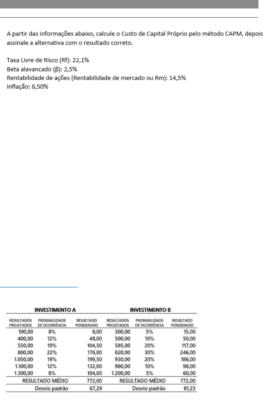 Disciplina: 101708 - AVALIAÇÃO DE EMPRESAS Abaixo estão as questões e as alternativas que você selecionou: Parte superior do formulário QUESTÃO 1 . a ) 14,3% b ) 23,9% c ) -1,9% d ) 21,9% e ) 22,3% Ver justificativa da resposta QUESTÃO 2 Observe a análise dos dados a seguir. Qual investimento representa menor risco? a ) Investimento A, porque seu desvio padrão é menor. b ) Investimento A, porque a probabilidade de ocorrência tem menor variabilidade que no investimento B. c ) Investimento B, porque varia R$ 900 entre o menor resultado projetado (R$ 300,00) e o maior resultado projetado (R$ 1.200,00). d ) Investimento A, porque ele tem possibilidade de ganhos de R$ 1.300,00. e ) Investimento B, porque os Resultados ponderados desse investimento são mais interessantes. Ver justificativa da resposta QUESTÃO 3 Quanto às vantagens e desvantagens do indicador EBITDA, classifique-as a seguir: 1 - Vantagem 2 - Desvantagem ( ) Mostra a produtividade e eficiência do negócio. ( ) Não mostra a liquidez da empresa. ( ) EBITDA positivo pode esconder prejuízo da empresa. ( ) Pode comparar empresas de diferentes países. Relacione as colunas e assinale a alternativa que apresenta a sequência correta. a ) 2, 2, 1, 1 b ) 1, 2, 1, 2 c ) 1, 2, 2, 1 d ) 2, 1, 2, 1 e ) 1, 1, 2, 2 Ver justificativa da resposta QUESTÃO 4 Por meio dos dados abaixo, calcule o Valor Patrimonial da Empresa (VPE), com base na geração de riqueza - EVA®. Em seguida, assinale a alternativa que contenha o valor do resultado. Empresa: Ultra Power Velox Internet Ltda. Patrimônio Líquido (PL): R$ 1.200.000,00 Lucro Líquido: R$ 250.000,00 Endividamento Oneroso: R$ 700.000,00 Disponibilidades: R$ 120.000,00 Custo de Oportunidade (WACC): 9,0% Retorno sobre o PL: 21,0% EVA: 80.000,00 Arredonde para uma casa decimal, se necessário. a ) R$ 1.327.200,00 b ) R$ 1.700.952,40 c ) R$ 1.508.889,90 d ) R$ 1.336.800,00 e ) R$ 2.208.888,90 Ver justificativa da resposta QUESTÃO 5 Sobre Fluxo de Caixa, marque V quando a assertiva for verdadeira e F quando for falsa. Então, assinale a alternativa que apresenta a ordem correta. ( ) Fluxo de caixa é um dos relatórios gerenciais mais importantes. ( ) É elaborado em base diária, mensal e anual. ( ) Em avaliação de empresas utilizamos o fluxo de caixa elaborado pelo regime de caixa. ( ) Demonstra as entradas e saídas de recursos da empresa que resultaram em saldo positivo. ( ) Quando utilizado com as demais informações contábeis, proporciona uma visão muito mais clara sobre como os recursos estão sendo utilizados na empresa. a ) F, V, F, V, V b ) V, F, F, V, V c ) V, V, V, F, V d ) V, V, F, F, V e ) V, V, F, F, F Ver justificativa da resposta QUESTÃO 6 Leia as assertivas sobre Fluxo de Caixa Livre (FCL) e marque V quando for verdadeira e F quando for falsa e, depois, assinale a alternativa que apresenta a ordem correta. ( ) O cálculo do FCL é complexo, pois leva em consideração indicadores de balanço e Demonstração do Resultado do Exercício (DRE). ( ) O FCL mostra qual é a capacidade da empresa de gerar caixa por meio de novos investimentos e cobrir todos os custos e as despesas com a operação. ( ) FCL é reconhecido como uma ferramenta essencial para a avaliação de uma empresa. ( ) A depreciação constante na DRE, por não ser uma despesa financeira, deve ser reincorporada ao Fluxo de Caixa. a ) F, V, V, V b ) V, V, F, F c ) F, V, F, V d ) V, V, V, F e ) F, V, V, F Ver justificativa da resposta QUESTÃO 7 Leia as assertivas a seguir sobre Liquidez: I. A Liquidez Corrente demonstra o potencial de quitação de dívidas de curto prazo. II. A Liquidez Seca mostra o que existe em disponibilidade imediata para quitação das dívidas de curto prazo (Passivo Circulante). III. A Liquidez Imediata considera todo o dinheiro, os valores a receber de curto e longo prazos e os estoques para quitar todas as dívidas da empresa. IV. A Liquidez Seca mostra a relação das dívidas totais com a disponibilidade financeira imediata. V. A Liquidez Geral, quando for abaixo de 1,0, nos indica que a empresa tem sobra de caixa para pagamento de dívidas de curto prazo. Assinale a alternativa que apresenta as assertivas corretas. a ) Apenas as assertivas II e III estão corretas. b ) Apenas as assertivas I e II estão corretas. c ) Apenas as assertivas IV e V estão corretas. d ) Todas as assertivas estão corretas. e ) Apenas as assertivas III e IV estão corretas Ver justificativa da resposta QUESTÃO 8 Leia as seguintes proposições sobre a técnica do Valor Econômico Agregado (EVA®) e, então, assinale a alternativa correta. I. Uma empresa só pode ser realmente chamada de lucrativa se houver geração de riqueza para seus investidores. II. Técnica que possibilita aos empresários, executivos ou investidores avaliar se um recurso financeiro aplicado na empresa foi bem ou mal gerenciado. III. Técnica utilizada para calcular o lucro em uma determinada empresa, buscando o cálculo da rentabilidade real de um capital aplicado. a ) Apenas as assertivas II e III estão corretas. b ) Apenas as assertivas I e II estão corretas. c ) Apenas as assertivas I e III estão corretas. d ) Apenas a assertiva III está correta. e ) Todas as assertivas estão corretas. Ver justificativa da resposta Voltar Parte inferior do formulário