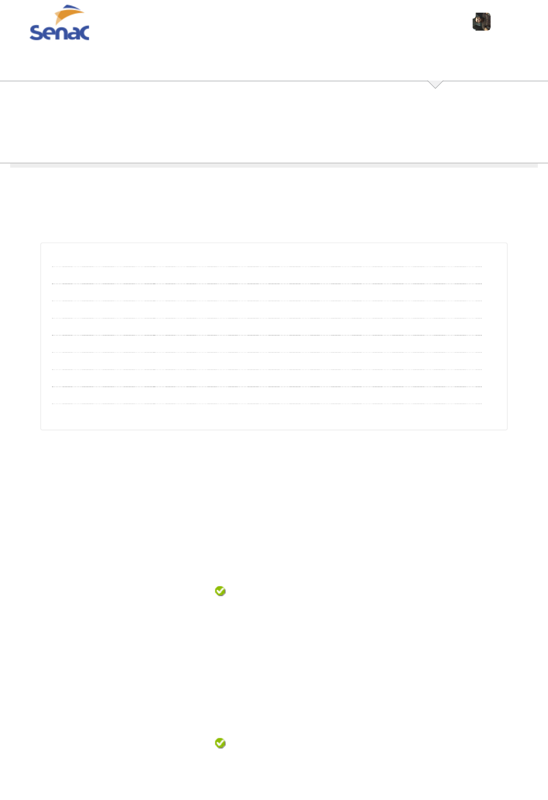 01/03/2023, 14:09 Revisar envio do teste: Clique aqui para iniciar o Quiz &ndash... https://senacsp.blackboard.com/webapps/assessment/review/review.jsp?attempt_id=_29471875_1&course_id=_205175_1&content_id=_920359… 1/7 Revisar envio do teste: Clique aqui para iniciar o Quiz STADCAS4DA_2204-2204-695438 2204-ARQUITETURA DE SOFTWARE Quiz REVISAR ENVIO DO TESTE: CLIQUE AQUI PARA INICIAR O QUIZ Usuário PAULO SERGIO DE MACEDO BARRADAS JUNIOR Curso 2204-ARQUITETURA DE SOFTWARE Teste Clique aqui para iniciar o Quiz Iniciado 01/03/23 13:45 Enviado 01/03/23 14:09 Data de vencimento 29/03/23 23:59 Status Completada Resultado da tentativa 10 em 10 pontos Tempo decorrido 24 minutos Resultados exibidos Todas as respostas, Respostas enviadas, Respostas corretas, Comentários Pergunta 1 Resposta Selecionada: e. Respostas: a. b. c. d. e. Comentário da resposta: Durante o desenvolvimento de uma aplicação, é construída uma classe responsável por entregar a conexão com o banco de dados. Porém, essa classe deve funcionar de maneira síncrona para não disponibilizar conexões a mais do que o suportado pelo sistema. Um desenvolver sugeriu implementar a classe utilizando o padrão singleton. Ao pesquisarem sobre o tema, verão que o padrão de projeto singleton tem por objetivo: assegurar que cada classe tenha uma única instância. criar famílias de objetos por meio de uma única interface. permi�r a variação de interfaces. disponibilizar interfaces simplificadas. processar vários objetos com caracterís�cas similares. assegurar que cada classe tenha uma única instância. Resposta correta: e) assegurar que cada classe tenha uma única instância. Sala de Aula Tutoriais 1 em 1 pontos PAULO SERGIO DE MACEDO BARRADAS JUNIOR 73 https://senacsp.blackboard.com/webapps/blackboard/execute/courseMain?course_id=_205175_1 https://senacsp.blackboard.com/webapps/blackboard/content/listContent.jsp?course_id=_205175_1&content_id=_9203580_1&mode=reset https://www.ead.senac.br/ https://senacsp.blackboard.com/webapps/portal/execute/tabs/tabAction?tab_tab_group_id=_260_1 https://senacsp.blackboard.com/webapps/portal/execute/tabs/tabAction?tab_tab_group_id=_210_1 https://senacsp.blackboard.com/webapps/login/?action=logout 01/03/2023, 14:09 Revisar envio do teste: Clique aqui para iniciar o Quiz &ndash... https://senacsp.blackboard.com/webapps/assessment/review/review.jsp?attempt_id=_29471875_1&course_id=_205175_1&content_id=_920359… 2/7 O singleton controla a quan�dade de instâncias geradas a par�r de uma classe. Pergunta 2 Resposta Selecionada: e. Respostas: a. b. c. d. e. Comentário da resposta: Quando pensamos em uma arquitetura web, o ideal é sempre separarmos a aplicação utilizando o conceito de camadas (tiers). Pensando nos conceitos de thin client e fat client, aplicados à arquitetura web, assinale a opção correta. Na arquitetura tradicional, há três tiers: o cliente remoto, o servidor web e o servidor de banco de dados. A grande vantagem da thin client é a distribuição uniforme de carga de processamento de domínio e de regra de negócio entre as camadas (�ers). Tanto na thin client quanto na fat client, as regras de negócios devem ficar armazenadas em stored procedures na camada de persistência, a fim de permi�r maior independência em relação ao SGBD. Os clientes (desktops) são classificados como fat clients, por permi�rem compa�bilidade com inúmeros �pos de equipamentos, incluindo-se disposi�vos móveis. Os clientes (desktops) são classificados como thin clients, por permi�rem compa�bilidade com poucos �pos de equipamentos. Na arquitetura tradicional, há três tiers: o cliente remoto, o servidor web e o servidor de banco de dados. Resposta correta: e) Na arquitetura tradicional, há três tiers: o cliente remoto, o servidor web e o servidor de banco de dados. Precisamos de três camadas para trabalhar em um sistema web: o servidor, o banco de dados e o cliente. Pergunta 3 Um dos principais pontos na fase de planejamento da criação de um software é a definição de sua arquitetura. Essa decisão pode influenciar em vários pontos do desenvolvimento. Com isso em mente, podemos afirmar que a arquitetura tem como objetivo principal prover um projeto que: 1 em 1 pontos 1 em 1 pontos 01/03/2023, 14:09 Revisar envio do teste: Clique aqui para iniciar o Quiz &ndash... https://senacsp.blackboard.com/webapps/assessment/review/review.jsp?attempt_id=_29471875_1&course_id=_205175_1&content_id=_920359… 3/7 Resposta Selecionada: a. Respostas: a. b. c. d. e. Comentário da resposta: implemente e possa ser verificado se cumpre os requisitos de so�ware. implemente e possa ser verificado se cumpre os requisitos de so�ware. defina a linguagem de programação a ser u�lizada na codificação. permita definir as habilidades da equipe que vai desenvolver o so�ware. defina qual será o modo de redundância a ser u�lizado pelo sistema. determine o �po e parâmetros de compilação a serem u�lizados. Resposta correta: a) implemente e possa ser verificado se cumpre os requisitos de software. A arquitetura é a base para implementação e validação de todos os requisitos. Pergunta 4 Resposta Selecionada: a. Para trabalhar com componentes em Java, temos disponível a especificação EJB. Com ela, é possível trabalhar com 3 tipos de componentes, os chamados beans. Os três tipos existentes são: session beans, entity beans e message- driven beans. Nesse contexto, considere as duas listas a seguir. Qual a associação correta entre os tipos de beans e as características? 1-I; 2-III; 3-II. 1 em 1 pontos 01/03/2023, 14:09 Revisar envio do teste: Clique aqui para iniciar o Quiz &ndash... https://senacsp.blackboard.com/webapps/assessment/review/review.jsp?attempt_id=_29471875_1&course_id=_205175_1&content_id=_920359… 4/7 Respostas: a. b. c. d. e. Comentário da resposta: 1-I; 2-III; 3-II. 1-I; 2-II; 3-III. 1-II; 2-I; 3-III. 1-III; 2-II; 3-I. 1-III; 2-I; 3-II. Res