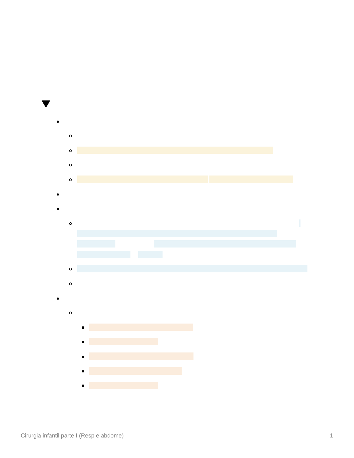 Cirurgia infantil parte I (Resp e abdome) 1 Cirurgia infantil parte I (Resp e abdome) 1. Hérnias diafragmáticas congênitas Epidemiologia causa relativamente comum de desconforto respiratório 90% é posterolateral esquerda (HERNIA DE BOCHDALECK) raramente bilateral minoria é anteromedial ou retroesternal (HERNIA DE MORGAGNI) Etiopatogênese: falha intrauterina no desenvolvimento do diafragma Fisiopatologia visceras abdominais deslocadas para o tórax → aumento da pressão → hipoplasia pulmonar + hipertensão pulmonar e desconforto respiratório → estimula persistência da circulação fetal com shunt direita esquerda = hipoxia na inspiração (pressão negativa) ocorro aumento do volume herniado hipoxemia + hipercapnia + acidose progressivos Manifestações clinicas Síndrome da HDC Hérnia diafragmática congênita Hipoplasia pulmonar Persistência do ducto arterioso Persistência do forame oval Má rotação intestinal Cirurgia infantil parte I (Resp e abdome) 2 💡 crianças que nascem com malformações maiores têm um risco mais elevado de anomalias associadas!!! manifestações clinicas aparecem nas primeiras 24h quanto mais cedo surge o sintoma, mais grave o acometimento pulmonar dispneia, hipoperfusão (hipertensão pulmonar compromete VD) abdome escavado MV reduzido RHA no tórax aumento do diâmetro AP desvio do ictus e bulhas contralateral polidramnia materna na gestação 💡 Dx diferencial: eventração diafragmática - elevação anormal do diafragma, pode ser congênito - por falha de muscularização do diafragma - ou adquirido - lesão do nervo frênico. Assintomático no nascimento, porém com infecções de repetição em lactentes Diagnóstico: Pré natal - USG Pós natal - Radiografia de tórax alças intestinais no tórax redução de conteudo gasoso no abdome desvio do mediastino contralateral Tratamento Cirurgia infantil parte I (Resp e abdome) 3 💡 Hérnias diafragmáticas congênitas não são emergência cirurgica, são emergência clínica = estabilize a hipertensão pulmonar primeiro pra depois resolver o defeito cirurgicamente Diagnóstico no pré-natal - cirurgia intraútero de oclusão da traqueia (atenua a hipoplasia pulmonar) Diagnóstico pós natal - estabilização clínica da HP + cirurgia incisão abdominal subcostal após 2 a 4 dias 2. Malformações broncopulmonares Malformação adenomatosa cistica Substituição do parênquima pulmonar por cistos em um lobo Fisiopatologia Superestímulo ao desenvolvimento de bronquíolos Subdesenvolvimento dos alvéolos Substituição do parênquima por massa cistica em um lobo Manifestações clínicas lesões volumosas → desconforto respiratório grave neonatal lesões pequenas → assintomáticos ou infecções de repetição em pré- escolar Diagnóstico Pré natal: USG (maioria) Pós natal: desconforto respiratório grave Radiografia de tórax imagens cisticas, ovalares, radioluscentes unilaterais Cirurgia infantil parte I (Resp e abdome) 4 desvio do mediastino depressão do diafragma nas formas graves se fizer o Rx nas primeiras horas de vida pode ser que os cistos estejam repletos de liquido ainda. Mas quando o ar entra e ocupa, os cistos se tornam parecidos com as alças intestinais na cavidade torácica, parecendo uma HDC Tratamento: cirurgia de lobectomia (curativa) SE NÃO TRATADA PODE MALIGNIZAR 💡 Diferenciando HDC e MAC NA HDC não da pra visualizar o diafragma ipsilateral ao torax acometido NA HDC há abdome escavado e RHA no torax Na HDC esquerda o estômago pode estar em posição anormal na cavidade abdominal ou em posição toracica Se a sonda gástrica estiver na topografa normal do estomago → pensar em MAC Enfisema lobar congenito Maioria das vezes acometimento é Lobo Superior Esquerdo ou lobo médio direito Maioria tende a regredir espontâneamente Fisiopatologia Ocorre hiperinsuflação do parênquima por obstrução de bronquiolo devido a proliferação mucosa por compressão extrinseca vascular Ocorre hipoventilação do parênquima normal, comprimido pelo hiperinsuflado Cirurgia infantil parte I (Resp e abdome) 5 Manifestação clinica: graus variados de desconforto respiratório hipertimpanismo unilateral Diagnóstico Radiografia de tórax hipertransparência compressão do pulmão saudável → atelectasia e desvio do mediastino contrário ao lado do enfisema (ATELECTASIA PUXA) Tratamento assintomático: observar sintomático: cirurgia de lobectomia 3.Atresia de esôfago e fístula traqueoesofágica Pode acontecer separado atresia de esôfago de fístula TE, mas frequentemente acontecem juntos 60% dos neonatos com atresia de esôfago/ FTE tem anomalias associadas 20% dos casos - trissomia do 8,13,21 10% dos casos - anomalia VACTERL (vertebral, anorretal, cardíaca, traqueia, esôfago, rim e rádio) cardíacas > anorretais > ósseas taxa de mortalidade decorre das anomalias associadas principalmente cardíacas Patogênese: reabsorção do terço médio do esôfago Classificação e frequência 1º - Atresia com fistula distal ( tipo III) 2º - Atresia sem fistula (tipo I) Cirurgia infantil parte I (Resp e abdome) 6 3º - Atresia com fístula proximal (tipo II) Atresia com dupla fistula proximal e distal (tipo IV) Fistula em H sem atresia (tipo V) Manifestações clinicas da ATRESIA DE ESOFAGO COM FTE salivação excessiva regurgitação impossibildade de progredir sonda tosse engasgo taquipneia, cianose, apneia - refluxo do conteudo gastrico para traqueia pela fistula parada da progressão da sonda gástrica 8-12cm da narina do RN distensão gastrica aguda (ar entrando no esofao distal atravaes da comunicação traqueal) pneumonias aspirativas Manifestações clínicas da ATRESIA DE ESOFAGO SEM FTE Predomina sialorreia ‼ parada da progressão da sonda gástrica 8-12cm da narina do RN Quadro respiratório brando história de polidramnio ‼ Cirurgia infantil parte I (Resp e abdome) 7 Diagnóstico Pré natal: USG polidramnio coto esofágico proximal dilatado câmara