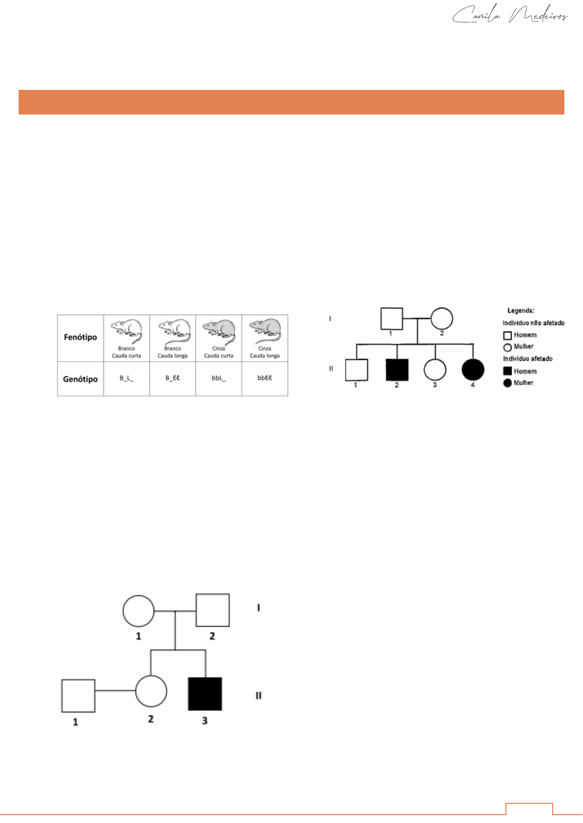 1 1. Em certa espécie de ratos silvestres, as características de cor de pelo e de comprimento da cauda são expressadas cada um por um gene autossômico, localizados em cromossomos diferentes. A característica de pelo branco, expressado pelo alelo “B”, que é dominante sobre a característica de pelo cinza, é condicionada pelo alelo recessivo “b”. Já a característica de cauda curta, condicionada pelo alelo “L”, é dominante em relação à cauda longa, expressada pelo alelo recessivo “ℓ”. O quadro abaixo apresenta os possíveis fenótipos e genótipos em relação à cor do pelo e do comprimento da cauda: Em cruzamentos entre um rato macho branco com cauda curta (duplamente heterozigoto) com uma fêmea cinza com cauda curta (heterozigoto para a característica da cauda), nasceram 16 filhotes. Quantos destes filhotes poderão ser brancos de cauda longa? a) 6 b) 4 c) 2 d) 9 e) 8 2. O heredograma a seguir apresenta uma mutação genética autossômica recessiva para fibrose cística, que afeta o homem II-3. A probabilidade da sua irmã II-2, clinicamente normal, ao se casar com um homem II-1, também clinicamente normal, mas que possui o mesmo genótipo que os sogros, ter um filho independente do sexo com fibrose cística é igual a a) 2/3 b) 1/3 c) 1/2 d) 1/6 e) 1/8 3. A fibrose cística é uma doença autossômica recessiva que afeta as glândulas exócrinas causando problemas para o trato digestivo e para*os pulmões. Sendo assim, analise o heredograma abaixo, que representa um casal não afetado pela doença e seus filhos. Com a análise desse heredograma, é correto afirmar que: a) todas as filhas do indivíduo II.2 serão afetadas pela doença e o genótipo desse indivíduo é aa. b) o indivíduo II.1 é totalmente dominante e seu genótipo é AA. c) todos os filhos do indivíduo II.3 terão pelo menos um gene para doença e o genótipo desse indivíduo é aa. d) todos os descendentes do indivíduo II.4 receberão o gene para doença e o genótipo dele é aa. e) o indivíduo I.2 é totalmente dominante e seu genótipo é AA. 4. Nos gatos, a cor da pelagem preta, laranja ou preta e laranja é devida aos alelos X A (cor preta) e X a (cor laranja). Assim como nos humanos, a determinação do sexo nos gatos é devida aos cromossomos sexuais X e Y. Considerando somente esses alelos, gatos machos apresentam coloração preta ou laranja, mas gatos que apresentam uma anomalia genética, igual à síndrome de Klinefelter nos humanos, apresentam cor da pelagem preta e laranja, quando seu genótipo é a) XA XA Y. b) XA Xa Y. questões de genética QUESTÕES DE CONCURSO questões com gabarito 2 c) Xa Xa YA. d) XA YY e) Xa XA YA. 5. Considerando o heredograma precedente, que representa uma família na qual existe a segregação de uma doença genética hipotética, julgue o seguinte item. A referida doença genética segrega nessa família com padrão de herança autossômico dominante. a) Certo b) Errado 6. Considerando o heredograma precedente, que representa uma família na qual existe a segregação de uma doença genética hipotética, julgue o seguinte item. O risco de o indivíduo III1 gerar um(a) filho(a) afetado(a) em sua prole é de 25% a) Certo b) Errado 7. “Uma planta com um par de alelos idênticos é chamada de homozigota, uma planta na qual os alelos do par diferem é chamada de heterozigota. Às vezes, um heterozigoto para um gene é chamado de monoíbrido. Um indivíduo pode ser classificado como homozigoto dominante (tal como Y/Y), heterozigoto (Y/y) ou homozigoto recessivo (y/y). Geralmente em genética, as combinações alélicas subjacentes aos fenótipos são chamadas de genótipos. Logo, Y/Y, Y/y e y/y são todos genótipos.” (GRIFFITHS, A. J. F., WESSLER, S. R.; LEWONTIN, R. C.; CARROLL S. B. Introdução à Genética. 9ª ed. Rio de Janeiro: Guanabara Koogan, p.34, 2008.) De acordo com as terminologias da genética citadas acima, analise a seguinte proposição: um homem heterozigoto, portador de doença genética de herança autossômica dominante, casa-se com uma mulher normal. Ela está grávida de um par de gêmeos. Qual é a probabilidade de que pelo menos um dos gêmeos venha a ser afetado pela doença no caso de serem, respectivamente, gêmeos dizigóticos ou monozigóticos? a) 25% e 50% b) 25% e 75% c) 75% e 50% d) 50% e 25% e) 50% e 75% 8. T. H. Morgan e seus colaboradores, na “Sala das Moscas”, como ficou conhecido o seu Laboratório na Columbia University, realizaram inúmeros experimentos sobre mutações utilizando as mostras das frutas (Drosophila melanogaster). Esses experimentos foram fundamentais para lançar as bases cromossômicas da herança e correlacionar as ideias de Mendel com o comportamento cromossômico na meiose. Nesse sentido, assinale a alternativa correta. a) O princípio da segregação dos fatores de Mendel é baseado na separação dos cromossomos homólogos durante a anáfase II da meiose. b) O princípio da distribuição independente de Mendel refere-se à separação anafásica de genes em pares diferentes de cromossomos, na meiose. c) A análise da mutação para olho branco na Drosophila foi fundamental para a confirmação da teoria cromossômica da herança, visto que é uma mutação ligada ao cromossomo sexual Y e afetava predominantemente os machos. d) A Meiose I é denominada equacional e a Meiose II é a reducional. e) Durante o diplóteno da prófase I, ocorre a formação do bivalente ou tétrade e, nas regiões do complexo sinaptonêmico, observa-se o crossing over. 3 9. Considerando o cruzamento Aa Bb x Aa bb, é correto afirmar que a fração da prole que terá o fenótipo recessivo para, pelo menos, um gene é a) 1/16 b) 5/8 c) 2/8 d) 7/16 10. Suponha que do cruzamento de um pato e uma pata, ambos de pelo branco, nasça um pato de pelo preto, que é a característica recessiva. Sobre essa situação, é correto afirmar que afirmar que a) os pais do pato preto são homozigotos. b) o pato pr