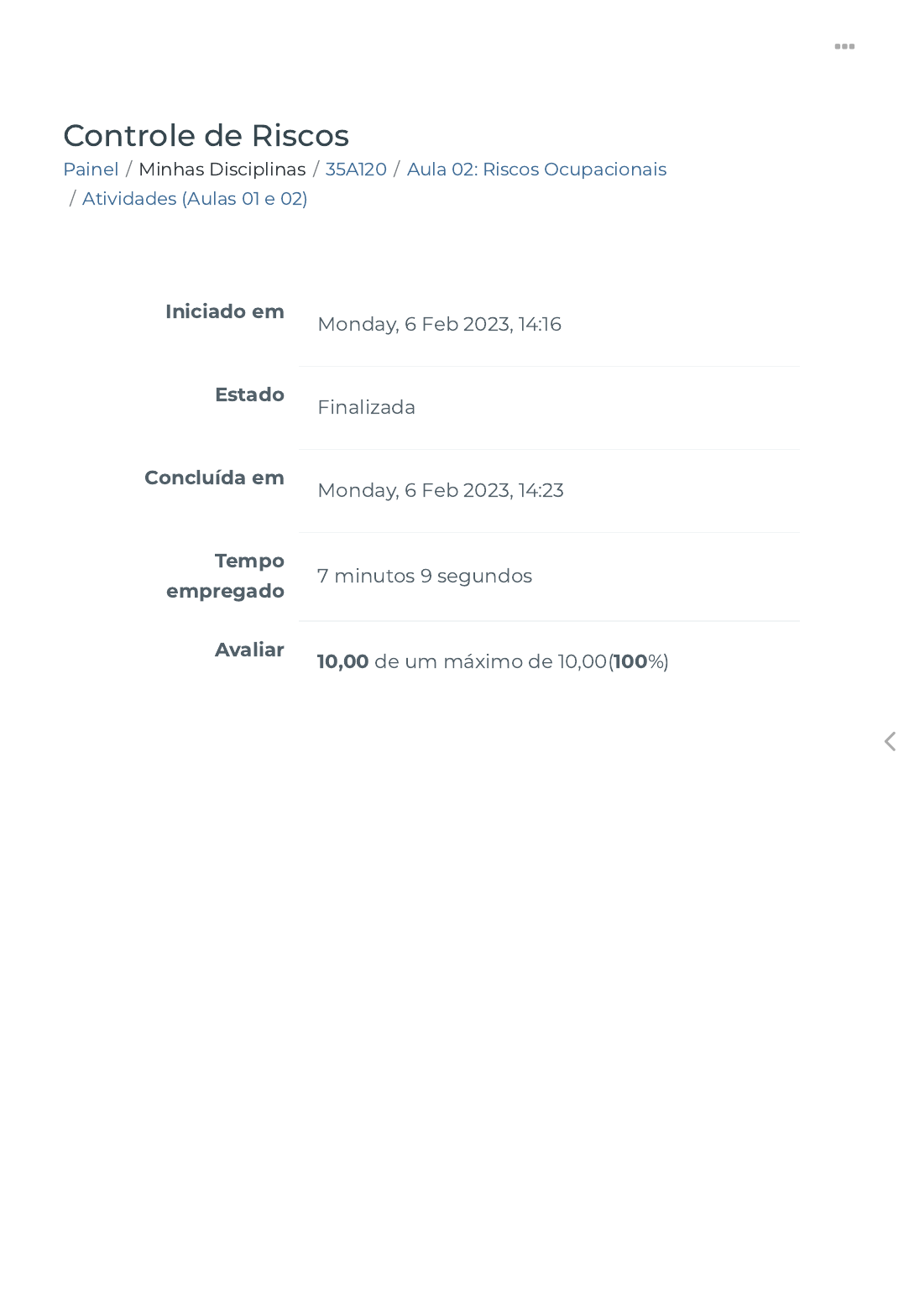 06/02/2023 14:23 Atividades (Aulas 01 e 02) https://ava.politecnicabr.com.br/mod/quiz/review.php?attempt=4324249 1/15 Painel / Minhas Disciplinas / 35A120 / Aula 02: Riscos Ocupacionais / Atividades (Aulas 01 e 02) Controle de Riscos Iniciado em Monday, 6 Feb 2023, 14:16 Estado Finalizada Concluída em Monday, 6 Feb 2023, 14:23 Tempo empregado 7 minutos 9 segundos Avaliar 10,00 de um máximo de 10,00(100%) https://ava.politecnicabr.com.br/my/ https://ava.politecnicabr.com.br/course/view.php?id=1042 https://ava.politecnicabr.com.br/course/view.php?id=1042#section-4 https://ava.politecnicabr.com.br/mod/quiz/view.php?id=32441 https://ava.politecnicabr.com.br/ 06/02/2023 14:23 Atividades (Aulas 01 e 02) https://ava.politecnicabr.com.br/mod/quiz/review.php?attempt=4324249 2/15 Questão 1 Correto Atingiu 1,00 de 1,00 Assinale (V) Verdadeiro e (F) Falso, relacionado a origem da Segurança do Trabalho. ( ) A saúde ocupacional “[...] surge como uma resposta a esse ambiente insalubre, [...] com um clamor multidisciplinar, aliando médicos e engenheiros a um pensamento que enfatiza a higiene industrial” (SILVA, p. 32, 2000). ( ) No Egito há registros que datam de 2360 a.C., como o Papiro Seler II (relaciona o ambiente de trabalho e os riscos a ele inerentes) e o Papiro Anastasi V, mais conhecido como “Sátira dos Ofícios”, de 1800 a.C. (descreve os problemas de insalubridade, periculosidade e penosidade das pro�ssões) (MATTOS et al., 2011). ( ) Na Grécia, as instituições responsáveis pelos con�itos trabalhistas eram denominadas erans e, em Roma, collegia: “Os erans admitiam como membros todos os cidadãos gregos, os �lhos e os escravos, sendo que estes últimos não eram, na realidade, membros com direito pleno e sim um ‘capital de trabalho’”. Quanto aos collegia: “Qualquer pessoa podia ser membro desta associação, inclusive os escravos e os libertos [...]” (FRIEDE, 1973). ( ) No Século I a C., ocorreram mudanças no paradigma espiritualista para o naturalista. O mecanismo do processo saúde-doença pela teoria dos miasmas vigorou até o século XIX. Hipócrates descreveu a “intoxicação saturnina” em um mineiro, porém omitiu o ambiente de trabalho e a ocupação. O Tratado de Hipócrates (ares, águas e lugares) informava ao médico a relação entre ambiente e saúde https://ava.politecnicabr.com.br/ 06/02/2023 14:23 Atividades (Aulas 01 e 02) https://ava.politecnicabr.com.br/mod/quiz/review.php?attempt=4324249 3/15 (clima, topogra�a, qualidade da água, organização política). Escolha uma opção: a. V, V, F, V. b. V, V, V, V. c. V, V, F, F. d. V, V, V, F. e. F, V, V, V. https://ava.politecnicabr.com.br/ 06/02/2023 14:23 Atividades (Aulas 01 e 02) https://ava.politecnicabr.com.br/mod/quiz/review.php?attempt=4324249 4/15 Questão 2 Correto Atingiu 1,00 de 1,00 A prevenção de riscos de acidentes é complexa, necessitando de especial atenção dos pro�ssionais envolvidos com a segurança do trabalho, que devem observar cada tipo de risco e propor a respectiva medida de prevenção. Marque a alternativa correta: Escolha uma opção: a. Para evitar acidentes com animais peçonhentos, devem-se veri�car as vestimentas antes de usá-las, principalmente os trabalhadores da indústria da construção civil, de obras inacabadas, ou seja, onde houver entulhos, materiais de construção etc., pois esses animais costumam estar presente nesses ambientes. b. Todos os trabalhadores devem estar em perfeitas condições de saúde, a ponto de exercerem suas atividades com total atenção, zelo e pro�ssionalismo. c. Não utilizar, em hipótese alguma, acessórios e adornos pessoais durante o expediente de trabalho, como anéis, pulseiras, brincos, colares etc. d. Mais de uma alternativa correta. e. Todos os trabalhadores devem conhecer os riscos a que estão expostos, bem como ser treinados quanto às respectivas formas de prevenção e controle. https://ava.politecnicabr.com.br/ 06/02/2023 14:23 Atividades (Aulas 01 e 02) https://ava.politecnicabr.com.br/mod/quiz/review.php?attempt=4324249 5/15 Questão 3 Correto Atingiu 1,00 de 1,00 Quanto a classi�cação dos riscos, assinale a alternativa correspondente. Escolha uma opção: a. os riscos físicos, como o ruído, as vibrações, as radiações ionizantes e não ionizantes, o frio e o calor, as pressões anormais e a umidade. É sinalizado pela cor vermelha no mapa de riscos. b. nenhuma das alternativas. c. os riscos de acidentes, como o arranjo físico inadequado, as máquinas e equipamentos sem proteção, as ferramentas inadequadas ou defeituosas, a iluminação inadequada, a eletricidade, a probabilidade de incêndio ou explosão, o armazenamento inadequado, os animais peçonhentos e outras situações de risco que poderão contribuir para a ocorrência de acidentes. É sinalizado pela cor azul no mapa de riscos. d. os riscos ecológicos, como os vírus, as bactérias, os protozoários, os fungos, os parasitas e os bacilos. É sinalizado pela cor marrom no mapa de riscos. e. os riscos químicos, como as poeiras, os fumos, as névoas, neblinas e gases, os vapores e as substâncias, compostos ou produtos químicos em geral. É sinalizado pela cor verde no mapa de riscos. https://ava.politecnicabr.com.br/ 06/02/2023 14:23 Atividades (Aulas 01 e 02) https://ava.politecnicabr.com.br/mod/quiz/review.php?attempt=4324249 6/15 Questão 4 Correto Atingiu 1,00 de 1,00 As de�nições de risco e perigo não são pací�cas atualmente; há estudiosos que defendem que esses termos são sinônimos e outros (a grande maioria), que são termos completamente diferentes, tanto na nomenclatura quanto no conceito técnico propriamente dito. Dentre as alternativas com base no material de aula, marque a correta. Escolha uma opção: a. NR 10, norma do MTE que regulamenta a segurança em instalações e serviços em eletricidade, de�ne o perigo como a “situação ou condição de risco com probabilidade de causar lesão f