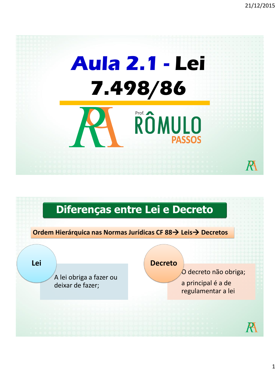 21/12/2015 1 Aula 2.1 - Lei 7.498/86 A lei obriga a fazer ou deixar de fazer; Lei O decreto não obriga; a principal é a de regulamentar a lei Decreto Diferenças entre Lei e Decreto Ordem Hierárquica nas Normas Jurídicas CF 88 Leis Decretos Valdeneide de franca guedes - 065.584.014-10 21/12/2015 2 Enfermeiro Aux. de Enfermagem Parteira Téc. de Enfermagem Enfermagem Planejamento Programação das instituições e serviços de saúde Incluem A programação é a prescrição da assistência de enfermagem Valdeneide de franca guedes - 065.584.014-10 21/12/2015 3 Membro da Equipe = Saúde Privativas = Enfermagem Atribuições do Enfermeiro Atividades Privativas do Enfermeiro Direção do órgão de enfermagem integrante da estrutura básica da instituição de saúde, pública e privada Valdeneide de franca guedes - 065.584.014-10 21/12/2015 4 Atividades Privativas do Enfermeiro de unidade de serviço Chefia Atividades Privativas do Enfermeiro - organização e direção dos serviços de enfermagem e de suas atividades técnicas e auxiliares nas empresas prestadoras desses serviços; Valdeneide de franca guedes - 065.584.014-10 21/12/2015 5 Planejamento organização coordenação execução avaliação Administrar os Serviços de Enfermagem dos serviços da assistência de enfermagem. Atividades Privativas do Enfermeiro A ti vi d ad e s P ri va ti va s d o En fe rm e ir o Consultoria Auditoria Emissão de parecer Consulta Prescrição da assistência Valdeneide de franca guedes - 065.584.014-10 21/12/2015 6 Atividades Privativas do Enfermeiro Pa ci e n te s G ra ve s co m R is co d e V id a; ↑ C o m p le xi d ad e Té cn ic a Cuidados diretos de enfermagem Exijam conhecimentos de base científica e capacidade de tomar decisões imediatas. a) assistência à parturiente e ao parto normal; b) identificação das distocias obstétricas e tomada de providências até a chegada do médico; c) realização de episiotomia e episiorrafia e aplicação de anestesia local, quando necessária. Atribuições dos titulares de diploma ou certificados de Obstetriz ou de Enfermeira Obstétrica Resoluções COFEN 477 e 478/2015 - normatizam a atuação do Enfº. Obstetra nos partos normais Valdeneide de franca guedes - 065.584.014-10 21/12/2015 7 Programação de Saúde Planos Assistenciais de Saúde planejamento, execução e avaliação elaboração, execução e avaliação participação Atividades do Enfermeiro - Integrante da Equipe de Saúde Atividades do Enfermeiro - Integrante da Equipe de Saúde Prescrição de Medicamentos estabelecidos em quê? programas de saúde pública e em rotina aprovada pela instituição de saúde. Valdeneide de franca guedes - 065.584.014-10 21/12/2015 8 Atividades do Enfermeiro - Integrante da Equipe de Saúde - participação em projetos de construção ou reforma de unidades de internação; - prevenção e controle sistemático da infecção hospitalar e de doenças transmissíveis em geral; O Decreto específico para atuação nos programas de vigilância epidemiológica. Atividades do Enfermeiro - Integrante da Equipe de Saúde - prevenção e controle sistemático de danos que possam ser causados à clientela durante a assistência de enfermagem; A prevenção de danos é dever de todos os membros da equipe de enfermagem. Valdeneide de franca guedes - 065.584.014-10 21/12/2015 9 - assistência de enfermagem à gestante, parturiente e puérpera; - acompanhamento da evolução e do trabalho de parto; - execução do parto sem distocia; Atividades do Enfermeiro - Integrante da Equipe de Saúde Decreto amplia também ao RN. Principais atribuições do Técnico de Enfermagem a) Participar da programação da assistência de enfermagem; b) Executar ações assistenciais de enfermagem, exceto as privativas do Enfermeiro; c) Participar da orientação e supervisão do trabalho de enfermagem em grau auxiliar; d) Participar da equipe de saúde. Valdeneide de franca guedes - 065.584.014-10 21/12/2015 10 Principais atribuições do Auxiliar de Enfermagem a) Observar, reconhecer e descrever sinais e sintomas; b) Executar ações de tratamento simples; c) Prestar cuidados de higiene e conforto ao paciente. d) Participar da equipe de saúde. A disciplina é a chave para a vitória!! Valdeneide de franca guedes - 065.584.014-10 21/12/2015 11 Aula 2.2 - Decreto 94.406/87 Atividades do Enfermeiro - Integrante da Equipe de Saúde Outras atribuições no Decreto nº 94406/87 Participação nos programas à saúde individual e de grupos específicos, particularmente os prioritários e de alto risco; Educação sanitária; Educação em saúde e treinamentos. Valdeneide de franca guedes - 065.584.014-10 21/12/2015 12 Atividades do Enfermeiro - Integrante da Equipe de Saúde Outras atribuições no Decreto nº 94406/87 Participação na saúde do trabalhador; Participação no sistema de referência e contra referência nos diferentes níveis de atenção à saúde; Participar de desenvolvimento de tecnologia na saúde; Participar em bancas examinadoras. Principais Atribuições do Técnico de Enfermagem - Decreto I- assistir ao Enfermeiro: a) no planejamento, programação, orientação e supervisão das atividades de assistência de Enfermagem; b) na prestação de cuidados diretos de Enfermagem a pacientes em estado grave; c) na prevenção e controle das doenças transmissíveis em geral em programas de vigilância epidemiológica; Valdeneide de franca guedes - 065.584.014-10 21/12/2015 13 Principais Atribuições do Técnico de Enfermagem - Decreto d) na prevenção e controle sistemático da infecção hospitalar; e) na prevenção e controle sistemático de danos físicos que possam ser causados a pacientes durante a assistência de saúde; f) na execução dos programas referidos nas letras “”i”” e “”o”” do item II do Art. 8º.(programas específicos de saúde e saúde do trabalhador) Principais atribuições do Auxiliar de Enfermagem - Decreto I – prep
