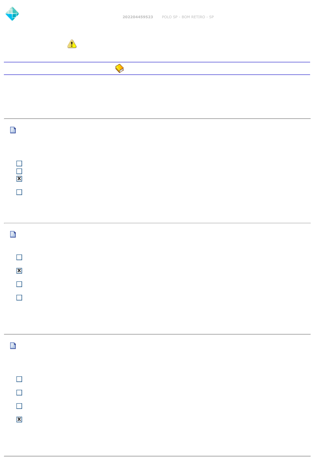 04/03/2023, 15:23 Aulapos: Estácio https://aulapos.estacio.br/aulapos/ 1/3 Anna Raphaella Bueno Rot Ferreira O resultado desta avaliação ficará disponível após o dia 22/03/2023. ENGENHARIA DA QUALIDADE Simulado: NPG4905_AV_202204459523 (AG) Aluno(a): ANNA RAPHAELLA BUENO ROT FERREIRA Matrícula: 202204459523 Data: 04/03/2023 14:21:36 (Finalizada) 1a Questão Marque a alternativa correta. São funções do Representante da Alta Direção (RA ou RD): Criar procedimentos, dar treinamentos, liberar recursos. Liberar recursos, participar de treinamentos, participar de auditorias. Liberar recursos, servir de exemplo para a conscientização dos funcionários e relatar a alta direção o desempenho do sistema de gestão. Liberar recursos, assinar procedimentos, realizar auditoria. 2a Questão O mapeamento de processos pode ser realizado, seguindo a metodologia: Comunicação das responsabilidades, enquadramento do processo, identificação das necessidades dos clientes, definição dos indicadores de desempenho e registro do fluxo do processo. Atribuição de responsabilidades, enquadramento do processo, identificação das necessidades dos clientes, definição dos indicadores de desempenho e registro do fluxo do processo. Identificação das necessidades dos clientes, definição de metas, estabelecimento de planos de ação, registro do fluxo do processo e acompanhamento. Atribuição de responsabilidade, identificação das necessidades dos clientes, definição das metas, redesenho do processo, registro do fluxo. 3a Questão Assinale a alternativa correta. Auditoria é: São registros, apresentação de fatos ou outras informações, relacionados aos critérios, que podem ser verificáveis. São resultados da avaliação da evidência coletada, comparada com os critérios avaliados, que geram uma determinada conclusão. É um conjunto de políticas, procedimentos ou requisitos estabelecido como uma referência para a auditoria. É um processo sistemático, documentado e independente, para obter evidência de auditoria e avaliá-la objetivamente para determinar a extensão na qual os critérios de auditoria são atendidos. 202204459523 POLO SP - BOM RETIRO - SP 04/03/2023, 15:23 Aulapos: Estácio https://aulapos.estacio.br/aulapos/ 2/3 4a Questão Com base na frase abaixo, selecione o princípio da qualidade a que ela esta relacionada: Muitas pessoas erroneamente pensam que qualidade lida somente com a padronização de processos e produtos. De fato, a padronização é um dos pilares desta teoria, contudo outro elemento tão importante quanto ela é a melhoria. (OLIVEIRA, 2014, p. 30) Foco no Cliente. Melhoria contínua. Abordagem factual para tomada de decisão. Abordagem de processos. 5a Questão A melhoria de processos pode seguir uma metodologia Analise que itens abaixo estão presentes: ( )Definir e traçar um diagrama funcional com as tarefas básicas que apoiam os objetivos do processo ( )Analisar criticamente as unidades funcionais ( )Reformular o fluxo operacional ( )Determinar indicadores e outros itens de controle ( ) Padronizar o novo processo ( )Comunicar e treinar colaboradores envolvidos. Sendo assim a sequencia que melhor representa a metodologia de processos é: V, V, V, V, V, V. V, V, V, F, V, V. V, V, F, V, V, V. V, V, V, V, V, F. 6a Questão Continua busca por melhores práticas, interna e externamente à organização, com o objetivo de acelerar a aprendizagem e levar a vantagens competitivas sustentáveis. (CORREA e CORREA, 2005, p. 145). O conceito acima se refere a : Pesquisa de mercado. Parceria argumentativa. Benchmarking. Melhoria continua. 7a Questão Assinale a alternativa correta. Melhoria da qualidade é: É a parte da gestão da qualidade que visa aumentar a capacidade de atender aos requisitos da qualidade. É a gestão da organização especifica para a área da qualidade. É a parte da gestão da qualidade que visa atender aos requisitos da qualidade. É a parte da gestão da qualidade que é responsável por determinar objetivos da qualidade e os recursos e processos para atender a estes objetivos. 8a Questão 04/03/2023, 15:23 Aulapos: Estácio https://aulapos.estacio.br/aulapos/ 3/3 Assinale V ou F quais as formas de elaboração de um organograma: ( ) Estrutural ( ) Circular ou radial ( ) Funcional ( ) Estrutural funcional ( ) Matricial Agora, assinale a alternativa correta: V, F, V, V, V. F, F, V, V, F. V, V, V, V, V. F, F, V, V, V. 9a Questão Assinale verdadeiro ou falso nas alternativas abaixo. A gestão de processos possui abordagem diferenciada quanto a ( ) Alocação de pessoas ( ) Autonomia Operacional ( ) Avaliação de desempenho ( ) Capacitação de individuos Com base na sequencia acima assinale a alternativa verdadeira: V, V, V, V. V, F, V, F. V, V, F, F. V, V, F, V 10a Questão São características da Reengenharia de Processos: Risco moderado. Mudança estrutural. Nível de mudança gradual. Parte de processos existentes.