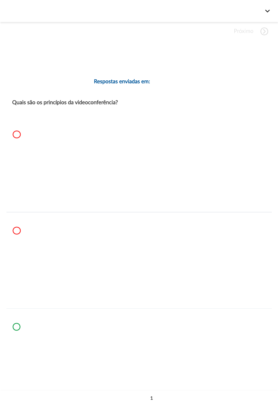 Exercícios Respostas enviadas em: 04/03/2023 16:23 1. Quais são os princípios da videoconferência? Resposta incorreta. A. a) Um dos princípios fundamentais da videoconferência é a transmissão de dados que o sistema ponto a ponto permite realizar. Outro princípio é o da comunicação digital através de mul�pontos. Os princípios da videoconferência são a comunicação e a conexão de vídeo entre pessoas que estão distantes. Os sistemas de videoconferência possibilitam o trabalho coopera�vo, permi�ndo que as informações e os materiais de trabalho sejam compar�lhados sem a necessidade da presença �sica dos par�cipantes, além de preservarem o diálogo. Resposta incorreta. B. b) A videoconferência é conhecida pela possibilidade de transferência de dados entre grupos, sendo esse seu princípio fundamental; além disso, a conexão de grupos em diferentes localizações geográficas é um princípio que a caracteriza. Os princípios da videoconferência são a comunicação e a conexão de vídeo entre pessoas que estão distantes. Os sistemas de videoconferência possibilitam o trabalho coopera�vo, permi�ndo que as informações e os materiais de trabalho sejam compar�lhados sem a necessidade da presença �sica dos par�cipantes, além de preservarem o diálogo. Você acertou! C. c) Os princípios da videoconferência são a comunicação e a conexão de vídeo entre pessoas que estão distantes. A distância pode ser de uma cidade para outra, ou até mesmo entre países diferentes. A comunicação pode ser realizada ponto a ponto ou em mul�pontos. Os princípios da videoconferência são a comunicação e a conexão de vídeo entre pessoas que estão distantes. Os sistemas de videoconferência possibilitam o trabalho coopera�vo, permi�ndo que as informações e os materiais de trabalho sejam compar�lhados sem a necessidade da presença �sica dos par�cipantes, além de preservarem o diálogo. 1 de 5 perguntas Anterior AR Resposta incorreta. D. d) A conexão de vídeo através da internet é o princípio fundamental da videoconferência, conhecida como comunicação mul�pontos. Antes da internet, as videoconferências eram precárias e somente possíveis por meio da comunicação ponto a ponto. Os princípios da videoconferência são a comunicação e a conexão de vídeo entre pessoas que estão distantes. Os sistemas de videoconferência possibilitam o trabalho coopera�vo, permi�ndo que as informações e os materiais de trabalho sejam compar�lhados sem a necessidade da presença �sica dos par�cipantes, além de preservarem o diálogo. Resposta incorreta. E. e) A conexão de vídeo entre diferentes pessoas, por meio de satélites, é o princípio fundamental da videoconferência. A comunicação que ocorre entre os par�cipantes é o seu princípio secundário. Os princípios da videoconferência são a comunicação e a conexão de vídeo entre pessoas que estão distantes. Os sistemas de videoconferência possibilitam o trabalho coopera�vo, permi�ndo que as informações e os materiais de trabalho sejam compar�lhados sem a necessidade da presença �sica dos par�cipantes, além de preservarem o diálogo. Próximo 1 de 5 perguntas Anterior AR Exercícios Respostas enviadas em: 04/03/2023 16:23 2. Na educação, a videoconferência é vista como potencializadora da aprendizagem, pois possibilita a comunicação com estudantes de diferentes contextos e a realização de projetos com diferentes ins�tuições. Marque a alterna�va que corresponde a uma das principais caracterís�cas da videoconferência na educação. Você não acertou! A. a) A videoconferência na educação permite que o aluno desenvolva sua autonomia, ao operar equipamentos de áudio e vídeo, para execução de projetos mul�disciplinares, além do senso crí�co ao escolher os roteiros na produção dos vídeos. O avanço da tecnologia nos proporciona encurtar distâncias e realizar a�vidades antes não imaginadas sem a presença �sica dos par�cipantes. A videoconferência está aí, também, para proporcionar a presença na virtualidade e a comunicação entre pessoas separadas pela distância �sica. Resposta correta. B. b) Ao ser u�lizada em projetos nos quais os alunos tenham contato com pessoas de diferentes regiões do país ou do exterior, a videoconferência possibilita o desenvolvimento da interculturalidade. O avanço da tecnologia nos proporciona encurtar distâncias e realizar a�vidades antes não imaginadas sem a presença �sica dos par�cipantes. A videoconferência está aí, também, para proporcionar a presença na virtualidade e a comunicação entre pessoas separadas pela distância �sica. Resposta incorreta. C. c) Uma caracterís�ca fundamental da videoconferência na educação é a possibilidade de oportunizar o desenvolvimento de habilidades técnicas nos alunos, uma vez que u�lizarão ferramentas para as transmissões e necessitarão de conhecimentos prévios. O avanço da tecnologia nos proporciona encurtar distâncias e realizar a�vidades antes não imaginadas sem a presença �sica dos par�cipantes. A videoconferência está aí, também, para proporcionar a presença na virtualidade e a comunicação entre pessoas separadas pela distância �sica. Resposta incorreta. 2 de 5 perguntas Anterior Próximo AR D. d) A principal caracterís�ca da videoconferência na educação é a possibilidade de compar�lhar arquivos sem estar conectado à internet, o que é feito após a realização da videoconferência, deixando os arquivos salvos em uma sala virtual. O avanço da tecnologia nos proporciona encurtar distâncias e realizar a�vidades antes não imaginadas sem a presença �sica dos par�cipantes. A videoconferência está aí, também, para proporcionar a presença na virtualidade e a comunicação entre pessoas separadas pela distância �sica. Resposta incorreta. E. e) A videoco