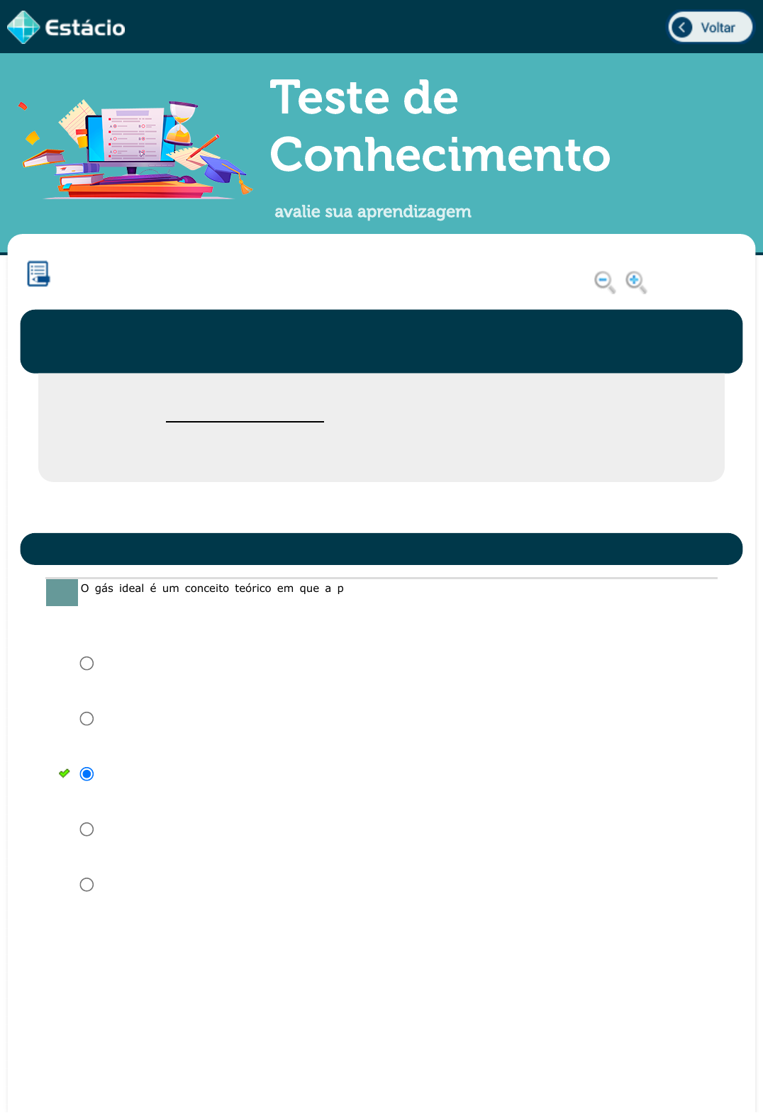 04/03/2023, 19:23 Estácio: Alunos https://simulado.estacio.br/alunos/ 1/7 Teste de Conhecimento avalie sua aprendizagem O gás ideal é um conceito teórico em que a pressão interna do gás é baixa. Esse conceito utiliza a equação de Clapeyron como parâmetro. Sobre o comportamento do gás ideal e sobre o motivo de o conceito ser meramente teórico, marque a opção correta: FÍSICO-QUÍMICA Lupa DGT0182_202202635511_TEMAS Aluno: STHEFANI MOREIRA LEITE CHAVES Matr.: 202202635511 Disc.: FÍSICO-QUÍMICA 2023.1 FLEX (G) / EX Prezado (a) Aluno(a), Você fará agora seu TESTE DE CONHECIMENTO! Lembre-se que este exercício é opcional, mas não valerá ponto para sua avaliação. O mesmo será composto de questões de múltipla escolha. Após responde cada questão, você terá acesso ao gabarito comentado e/ou à explicação da mesma. Aproveite para se familiarizar com este modelo de questões que será usado na sua AV e AVS. 02431ESTADOS DE AGREGAÇÃO DA MATÉRIA 1. O gás ideal é aquele no qual as forças intermoleculares não são nulas e a compressão do gás é infinita. É um conceito teórico pelo simples fato de nem toda matéria ocupar lugar no espaço e a compressão infinita ser impossível. Além disso, em um sistema gasoso em que as moléculas se movimentam em velocidade alta, é incorreto dizer que as forças intermoleculares são nulas. O gás ideal é aquele no qual as forças intermoleculares são altas e a compressão do gás é finita. Isso é verdade pelo simples fato de toda matéria ocupar lugar no espaço e a compressão infinita ser impossível. Além disso, em um sistema gasoso em que as moléculas se movimentam em velocidade alta, é incorreto dizer que as forças intermoleculares são nulas. Os choques são contínuos. O gás ideal é aquele no qual as forças intermoleculares são nulas e a compressão do gás é infinita. É um conceito teórico pelo simples fato de toda matéria ocupar lugar no espaço e a compressão infinita ser impossível. Além disso, em um sistema gasoso em que as moléculas se movimentam em velocidade alta, é incorreto dizer que as forças intermoleculares são nulas. O gás ideal é aquele no qual as forças intermoleculares são nulas e a compressão do gás é pequena. É um conceito teórico pelo simples fato de toda matéria ocupar lugar no espaço e a compressão pequena ser impossível. Além disso, em um sistema gasoso em que as moléculas se movimentam em velocidade alta, é incorreto dizer que as forças intermoleculares são nulas. O gás ideal é aquele no qual as forças intermoleculares são muito altas e a compressão do gás é finita. Isso é verdade pelo simples fato de toda matéria ocupar lugar no espaço e a compressão infinita ser impossível. Além disso, em um sistema gasoso em que as moléculas se movimentam em velocidade alta, é incorreto dizer que as forças intermoleculares são nulas. Data Resp.: 04/03/2023 19:14:53 Explicação: A opção correta é: O gás ideal é aquele no qual as forças intermoleculares são nulas e a compressão do gás é infinita. É um conceito teórico pelo simples fato de toda matéria ocupar lugar no espaço e a compressão infinita ser impossível. Além disso, em um sistema gasoso em que as moléculas se movimentam em velocidade alta, é incorreto dizer que as forças intermoleculares são nulas. O conceito de gás ideal é teórico, mas pode ser utilizado em condições bem específicas: temperaturas baixas e pressões extremamente baixas. É utilizado para situações em que o cálculo matemático é complexo. Não pode ser tomado como uma regra e os cálculos segundo esse conceito devem se basear nas condições-limite de pressão e temperatura. Em situações fora dessas condições, o gás deve ser tratado como real e usado o índice de compressibilidade (Z) na equação de Clapeyron como ajuste no comportamento do gás. javascript:voltar(); javascript:voltar(); javascript:diminui(); javascript:aumenta(); 04/03/2023, 19:23 Estácio: Alunos https://simulado.estacio.br/alunos/ 2/7 Três gases (A, B e C) apresentavam, nas mesmas condições, valores de Z (fator de compressibilidade gasosa) próximos de 1 (valores propostos pelo chefe da indústria em função do comportamento que os gases apresentavam). Esses mesmos gases foram submetidos à compressão para confirmar a sugestão do valor de Z pelo chefe, porém, o gás A foi o que mais apresentou dificuldade para ser comprimido. Sobre os comportamentos dos gases A, B e C, marque a opção correta: Um gás necessitava passar por uma transformação isotérmica. Esse processo era necessário, pois a temperatura não poderia variar em função da segurança. Antes da compressão, o gás apresentava a pressão de 18,5bar em um recipiente de volume igual a 2,06m3. Após a compressão, o volume encontrado foi de 0,98m3. Calcule a pressão do sistema ao final do processo. Dados:1 bar = 0,986923 atm 2. Os gases A e C apresentavam comportamento ideal e, por isso, o valor de Z realmente deve ser próximo de 1. O valor de Z para o gás B deve estar incorreto. Pode-se concluir que o valor de Z deve ser completamente diferente de 1. Os gases A e B apresentavam comportamento ideal e por isso o valor de Z realmente deve ser próximo de 1. O valor de Z para o gás C deve estar incorreto, pois como apresentou alta resistência à compressão, pode-se concluir que o valor de Z (para o gás C) deve ser completamente diferente de 1. Os gases B e C apresentavam comportamento ideal e por isso o valor de Z realmente deve ser próximo de 1. O valor de Z para o gás A deve estar incorreto, pois como apresentou alta resistência à compressão, pode-se concluir que o valor de Z (para o gás A) deve ser pouco diferente de 1. Os gases B e C apresentavam comportamento ideal e por isso o valor de Z realmente deve ser próximo de 1. O valor de Z para o gás A deve estar incorreto, pois como apresentou alta resistência à compressão, pode-se co