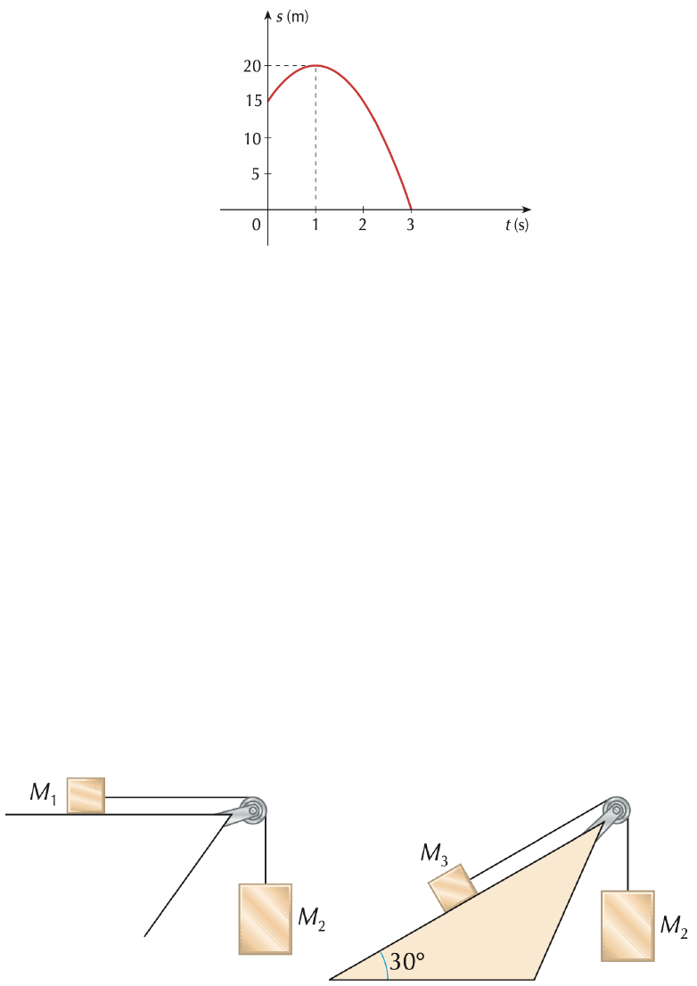 Professor: Leocádio Física 1 Prova1 INSTRUÇÕES: • Ao entregar a avaliação individual, certifique que a avaliação esteja de forma organizada e com letra legível. O não cumprimento acarretará a anulação da questão ou perdas de pontos. • Enumere suas páginas. • Erros quanto a notação matemática sofrerão penalizações entre 0,5 a 1,0 ponto. 1) O gráfico abaixo representa o espaço percorrido, em função do tempo, por um móvel em MRUV. Qual é a posição do móvel para t = 0, 5 s e a função horária da velocidade ? 2) A pista do “Castelinho” possui 400 m de comprimento. Se um atleta corre com uma velocidade escalar constante de 10,0 m/s, quantas voltas ele completará em 20 minutos? 3) Um trem se move com velocidade horizontal constante. Dentro dele estão o observador A e um garoto, ambos parados em relação ao trem. Na estação, sobre a plataforma, está o observador B, parado em relação a ela. Quando o trem passa pela plataforma, o garoto joga uma bola verticalmente para cima. Desprezando-se a resistência do ar, podemos afirmar que: 01) o observador A vê a bola se mover verticalmente para cima e cair nas mãos do garoto. 02) o observador B vê a bola descrever uma parábola e cair nas mãos do garoto. 04) os dois observadores veem a bola se mover numa mesma trajetória. 08) o observador B vê a bola se mover verticalmente para cima e cair atrás do garoto. 16) o observador A vê a bola descrever uma parábola e cair atrás do garoto. Dê como resposta a soma dos números associados às proposições corretas. 4) Sejam a1 e a3 os módulos das acelerações dos blocos de massa M1 e M3, respectivamente. Encontre a relação a1/a3, sabendo-se que 1 M1 = M3 = M2 3 . Despreze todos os atritos e as massas das roldanas. 5) O veículo da figura tem peso P = 10.000N e passa no ponto inferior da depressão com 54km/h. O raio da curva nesse ponto é 10m. Determine a força de reação da pista no veículo nesse ponto. Adoteg = 10m/s2. 2