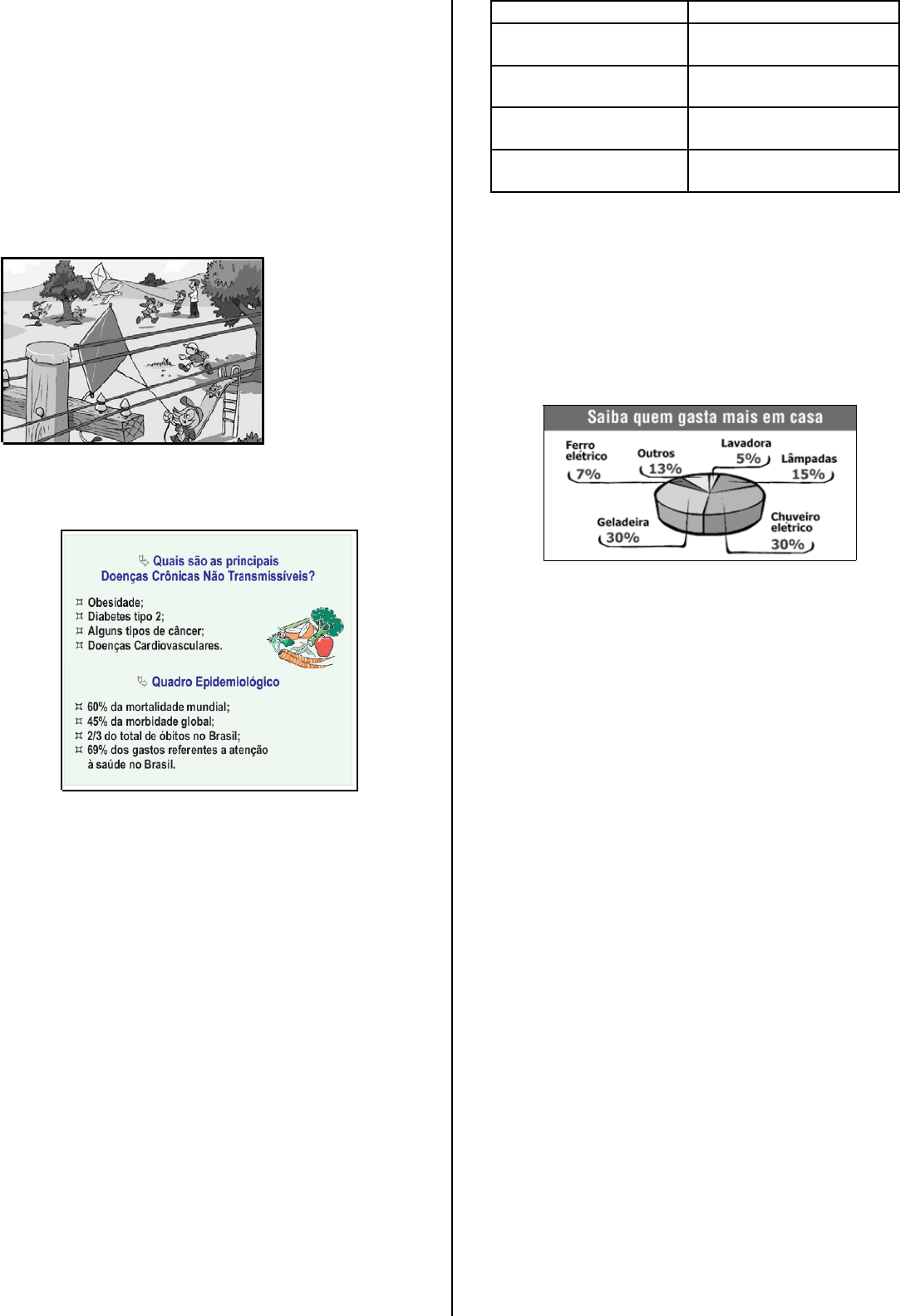 1 - A gravidez na adolescência é um problema de saúde pública no Brasil, sendo importante a difusão de métodos contraceptivos. Dentre esses métodos, apresentados a seguir, destaque aquele que além de evitar a gravidez, também é eficaz na prevenção contra doenças sexualmente transmissíveis (DST). A) Diafragma. C) Tabelinha. B) Dispositivo intrauterino (DIU). D) Camisinha. 2 - Soltar pipas próximo a fios de alta tensão, como sugere a imagem, é considerada uma atividade de risco: A) sempre, com ou sem o uso do cerol. B) às vezes, apenas com o uso do cerol. C) às vezes, apenas sem o uso do cerol. D) às vezes, apenas quando se está descalço. 3 - Observe o slide a seguir, elaborado a partir de dados da Organização Pan-Americana para a Saúde (OPAS): Segundo as informações do slide, podemos concluir que são comportamentos importantes para evitar a ocorrência das principais doenças crônicas não transmissíveis: A) não consumir proteínas nem se expor a agentes cancerígenos. B) praticar atividades físicas e ter uma alimentação balanceada. C) tomar remédios constantemente e fazer tratamentos preventivos. D) tomar todas as vacinas e não entrar em contato com pessoas doentes. 4 O hormônio folículo estimulante (FSH) é produzido pela glândula hipófise e atua respectivamente na transformação de meninas e meninos em mulheres e homens. Porém, a ação deste hormônio é diferente em cada sexo. Nos sexos feminino e masculino, o FSH atua, respectivamente: Sexo Feminino Sexo Masculino A) Acelerando o metabolismo Aumentando a massa muscular B) Amadurecendo os óvulos Promovendo a formação de espermatozoides C) Estimulado a produção de leite Acelerando o metabolismo D) Induzindo a produção de testosterona Induzindo a produção de estrogênio 5 - A tabela a seguir apresenta o consumo dos aparelhos elétricos que mais gastam energia elétrica nas residências. É possível verificar que os aparelhos que mais consomem energia são aqueles usados para A) iluminação e limpeza. B) resfriamento e iluminação. C) aquecimento e limpeza. D) aquecimento e resfriamento. 6 - A comunidade biológica de um rio apresenta enorme diversidade. Há peixes herbívoros que se alimentam de folhas e frutos dos vegetais das margens. Outros peixes são carnívoros. Também há peixes que filtram a água, alimentando-se de algas unicelulares e outros organismos microscópicos. A base da cadeia alimentar desse rio, ou seja, os organismos autótrofos são: A) as plantas e algas. B) os peixes carnívoros. C) os peixes herbívoros. D) os peixes que filtram água 7 - Pesquisas em medicina do esporte mostram que jogadores de futebol podem melhorar seu desempenho se modificarem sua alimentação diária. Eles frequentemente se alimentam errado, pois comem mais alimentos gordurosos e menos carboidratos do que deveriam. Portanto, para melhorar a eficiência em campo, os jogadores devem passar a comer, em maior quantidade, alimentos do grupo: A) das carnes vermelhas ou brancas. B) do leite, queijos e iogurte. C) dos pães, cereais e tubérculos. D) das frutas e verduras. 8 - A tuberculose é uma doença que afeta cerca de 15% da população mundial. O gráfico abaixo mostra o número de internações por tuberculose pulmonar no Estado de São Paulo, em 2004: De acordo com esses dados e seus conhecimentos sobre a doença, pode-se afirmar que:< 1 1 a 5 a 10 a 15 a 20 a 25 a 30 a 35 a 40 a 45 a 50 a 55 a 60 a 65 a 70 a 75 a 80 Faixa etária dos pacientes Homens Mulheres A) a tuberculose é uma doença característica da infância, afetando crianças até 10 anos de idade. B) há mais mulheres internadas devido à tuberculose do que homens. C) não é necessário vacinar crianças, pois não há casos de internações em pessoas com até 15 anos. D) a maior parte das internações ocorre com pessoas entre 30 e 50 anos. 9 - Na tabela abaixo estão as necessidades energéticas diárias de acordo com idade, sexo e massa(kg). Sexo e Idade Massa Corporal (Kg) Energia (kcal) Meninos de 11 a 14 anos 45 2500 Rapazes de 15 a 18 anos 66 3000 Homens de 19 a 24 anos 72 2900 Meninas de 11 a 14 anos 46 2200 Moças de 15 a 18 anos 52 2400 Mulheres de 19 a 24 anos 58 2200 Jonas é um rapaz saudável de 66 Kg e 15 anos. Ciça é uma moça saudável de 52 kg e 17 anos. O que aconteceria com Jonas caso ele adotasse a alimentação de Ciça por um longo período de tempo sem alterar suas atividades físicas? A) Emagreceria, pois seu organismo precisaria retirar energia de suas reservas. B) Emagreceria, pois a alimentação de Ciça fornece mais energia do que sua dieta. C) Engordaria, pois seu consumo de energia seria maior do que sua necessidade energética. D) Engordaria, pois seu organismo precisaria retirar energia de suas reservas. 10 - O Sol é considerado uma estrela. No entanto, ao observarmos o céu noturno percebemos aspectos diferentes das estrelas, como tamanho, brilho e temperatura, quando comparadas à nossa estrela Sol. Isso ocorre porque: A) o Sol é maior que as demais estrelas e está mais perto da Terra. B) as demais estrelas estão a uma distância muito maior da Terra que o Sol. C) o Sol produz muito mais calor que as demais estrelas, menores que ele. D) o Sol está mais distante da Terra, apesar de produzir mais calor. 11 - Na tabela são apresentadas as características de quatro personagens fictícios.Número de internações Marco Lucas Fernando Augusto Idade 55 anos 55 anos 55 anos 55 anos Altura 1,72 m 1,72 m 1,72 m 1,72 m Característica Física Magro Obeso Obeso Magro Tipo de Alimentação Alimentação balanceada Alimentação rica em sódio Alimentação rica em gordura saturada Alimentação balanceada Modo de Vida Praticante de atividades físicas Sedentário Sedentário Sedentário Hábito de Vida Não fumante Não fumante Fumante Fumante Desses personagens, aquele que possui o maior número de hábitos que são fatores de risco para a saúde do sistema cardiovascular é: A) Marco