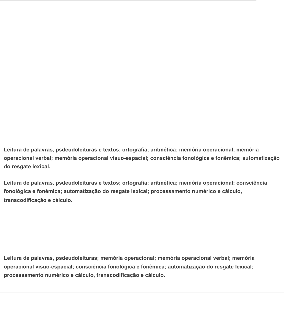 05/03/2023, 11:07 Comentários https://sereduc.blackboard.com/ultra/courses/_145617_1/outline/assessment/_7162853_1/overview/attempt/_24433750_1/review/inline-feedback… 1/6 Conteúdo do exercício Ocultar opções de resposta Pergunta 1 0 / 0,5 O roteiro de avaliação neuropsicológica apresentado abarca testes que avaliam: Incorreta: Ortografia; aritmética; memória operacional;memória operacional verbal; memória operacional visuo- espacial; consciência fonológica e fonêmica; automatização do resgate lexical; processamento numérico e cálculo, transcodificação e cálculo. Leitura de palavras, psdeudoleituras e textos; ortografia; aritmética; memória operacional; memória operacional verbal; memória operacional visuo-espacial; consciência fonológica e fonêmica; automatização do resgate lexical. Leitura de palavras, psdeudoleituras e textos; ortografia; aritmética; memória operacional; consciência fonológica e fonêmica; automatização do resgate lexical; processamento numérico e cálculo, transcodificação e cálculo. Resposta correta Leitura de palavras, psdeudoleituras e textos; ortografia; aritmética; memória operacional; memória operacional verbal; memória operacional visuo-espacial; consciência fonológica e fonêmica; automatização do resgate lexical; processamento numérico e cálculo, transcodificação e cálculo. Leitura de palavras, psdeudoleituras; memória operacional; memória operacional verbal; memória operacional visuo-espacial; consciência fonológica e fonêmica; automatização do resgate lexical; processamento numérico e cálculo, transcodificação e cálculo. Pergunta 2 0,5 / 0,5 05/03/2023, 11:07 Comentários https://sereduc.blackboard.com/ultra/courses/_145617_1/outline/assessment/_7162853_1/overview/attempt/_24433750_1/review/inline-feedback… 2/6 Ocultar opções de resposta São processos das funções executivas: Resposta correta Planejamento, controle inibitório, tomadas de decisão, flexibilidade cognitiva, memória operacional, fluência e redes atencionais. Planejamento, controle inibitório, tomadas de decisão, flexibilidade cognitiva e redes atencionais; Planejamento, tomadas de decisão, flexibilidade cognitiva, memória operacional, fluência e redes atencionais; Planejamento, controle inibitório, tomadas de decisão, flexibilidade cognitiva, fluência e redes atencionais; Planejamento, controle inibitório e tomadas de decisão, flexibilidade cognitiva, memória semântica, fluência e redes atencionais; Pergunta 3 0,5 / 0,5 Ao ser percebido ou diagnosticado um transtorno de aprendizagem, não é fundamental que o tratamento seja iniciado o quanto antes, pois não há relação com a idade da criança e com o tempo de ocorrência da lesão neurológica (no caso das dificuldades de aprendizagens adquiridas). Esta afirmação é: V Verdadeiro F Falso Resposta correta Pergunta 4 0,5 / 0,5 05/03/2023, 11:07 Comentários https://sereduc.blackboard.com/ultra/courses/_145617_1/outline/assessment/_7162853_1/overview/attempt/_24433750_1/review/inline-feedback… 3/6 Ocultar opções de resposta Compreender as funções cognitivas e seus transtornos é importante para os transtornos de aprendizagem, pois: O profissional precisa compreender e identificar as dificuldades de aprendizagem. Resposta correta O profissional precisa compreender as funções cognitivas e seus transtornos para auxiliar na identificação dos transtornos de aprendizagem. O profissional necessita compreender os transtornos de aprendizagem. A compreensão dos transtornos das funções cognitivas nunca interfere nos transtornos de aprendizagem. Compreender que os transtornos das funções cognitivas são diferentes de dificuldades de aprendizagem. Pergunta 5 0,5 / 0,5 Apesar de ainda ser reduzido o número de instrumentos psicométricos válidos no Brasil, já é possível esboçar um roteiro de exame neuropsicológico para crianças e jovens com dificuldade escolar. Esta afirmação é: V Verdadeiro Resposta correta F Falso Pergunta 6 0,5 / 0,5 05/03/2023, 11:07 Comentários https://sereduc.blackboard.com/ultra/courses/_145617_1/outline/assessment/_7162853_1/overview/attempt/_24433750_1/review/inline-feedback… 4/6 Apesar das funções executivas não serem primordiais para diferenciar síndromes neuropsiquiátricas entre si, são importantes para determinar o risco de aparecimento de vários transtornos infantis. Esta afirmação é: V Verdadeiro Resposta correta F Falso Pergunta 7 0,5 / 0,5 Os testes psicométricos não descobrem nunca a natureza do atraso, nem permitem interpretá-lo em absoluto. Esta afirmação é; V Verdadeiro Resposta correta F Falso Pergunta 8 0,5 / 0,5 Em relação ao desenvolvimento de uma pessoa, da concepção até a maturidade, as funções executivas atingem seu apogeu mais cedo se comparadas às demais funções cognitivas. Essa afirmação é: V Verdadeiro F Falso Resposta correta Pergunta 9 0,5 / 0,5 05/03/2023, 11:07 Comentários https://sereduc.blackboard.com/ultra/courses/_145617_1/outline/assessment/_7162853_1/overview/attempt/_24433750_1/review/inline-feedback… 5/6 Ocultar opções de resposta Ocultar opções de resposta Um declínio sutil no desempenho das funções executivas como categorização, organização, planejamento, solução de problemas e memória de trabalho, começa a ocorrer por volta: Dos 40 anos de idade; Resposta corretaDos 50 anos de idade. Dos 70 anos de idade; Dos 60 anos de idade; Pergunta 10 0,5 / 0,5 Assinale a alternativa correta: Apesar de se descrever um pouco as alterações ocorridas nos mecanismos neuropsicológicos que afetam a aprendizagem, os estudos e pesquisas ainda não conseguem explicar o motivo que causam estas alterações, nem a relação com os mecanismos cerebrais implícitos no processo. Por não conseguir descrever as alterações ocorridas nos mecanismos neuropsicológicos que afetam a aprendizagem, os estudos e pesquisas ainda não conseguem explicar o moti