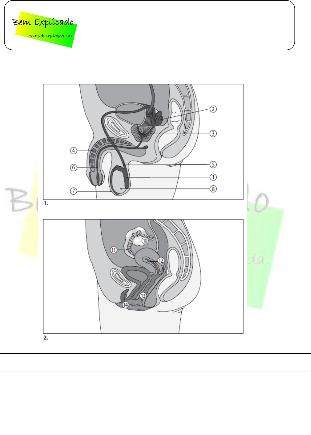 bemexplicado.pt Bem Explicado - Centro de Explicações Lda. C.N. 9º Ano – Sistema Reprodutor Nome: _________________________________________________ Data: ___/___/___ 1. Os sistemas reprodutores masculino e feminino são diferentes apesar de serem constituídos por estruturas com funções semelhantes. Observa os seguintes esquemas: 1.1 Faz a legenda das figuras: FIGURA 1 Sistema reprodutor _______________ FIGURA 2 Sistema reprodutor _______________ 1 - _______________ 5 - ______________ 2 - _______________ 6 - ______________ 3 - _______________ 7 - ______________ 4 - _______________ 8 - ______________ 10 - _______________ 14 - ______________ 11 - _______________ 12 - _______________ 13 - _______________ bemexplicado.pt 1.2 Identifica as gónadas masculinas e femininas. ________________________________________________________________________________ ________________________________________________________________________________ 1.3 Indica a função das vias genitais femininas. ________________________________________________________________________________ 1.4 Indica a função das glândulas anexas masculinas. ________________________________________________________________________________ 2. Classifica as frases seguintes de verdadeiro (V) ou falso (F). a. ____ A puberdade é um período que se caracteriza pelo desenvolvimento dos caracteres sexuais secundários. b. ____ Os caracteres sexuais secundários surgem por volta dos 14-15 anos. c. ____ Nos rapazes, a puberdade verifica-se mais cedo. d. ____ O alargamento das ancas, o início da menstruação e o crescimento dos seios são algumas das mudanças da puberdade nas raparigas. e. ____ O aumento dos órgãos sexuais, o engrossar da voz e as primeiras ejaculações são algumas das mudanças da puberdade nos rapazes. 3. Liga corretamente os elementos da coluna A aos elementos da coluna B. COLUNA A COLUNA B 1 – Testículo 2 - Epidídimo 3 - Pénis 4 – Canal deferente 5 – Útero 6 – Vagina 7 – Trompa de Falópio 8 – Orifício genital 9 - Espermatozoide a. Orifício que corresponde à abertura da vagina. b. Cavidade musculosa coberta por uma mucosa, o endométrico. c. Local no qual ocorre a maturação dos espermatozoides. d. Órgão copulador. e. Gonada masculina. f. Canal que recolhe o ovócito II g. Gâmeta masculino h. Canal muscular que estabelece a comunicação entre o núcleo e o exterior i. Canal que conduz os espermatozoides até à uretra. 1 - ____ 2 - ____ 3 - ____ 4 - ____ 5 - ____ 6 - ____ 7 - ____ 8 - ____ 9 - ____ bemexplicado.pt 4. A formação dos espermatozoides leva algumas semanas e realiza-se a uma temperatura inferior à temperatura do corpo. Observa a figura. 4.1 Faz a legenda da figura: 1 - ________________________________________ 2 - ________________________________________ 3 - ________________________________________ 4.2 Indica o trajeto seguido pelos espermatozoides, desde o local da sua formação até serem libertados. ________________________________________________________________________________ ________________________________________________________________________________ ________________________________________________________________________________ ________________________________________________________________________________ 4.3 Explica como é que os testículos conseguem produzir os espermatozoides a uma temperatura inferior à temperatura do corpo. ________________________________________________________________________________ ________________________________________________________________________________ ________________________________________________________________________________ 4.4 O esperma é um líquido esbranquiçado libertado durante uma ejaculação. Qual a sua constituição? ________________________________________________________________________________ ________________________________________________________________________________ 5. Comenta a afirmação seguinte: “Na mulher, os aparelhos reprodutor e urinário estão perfeitamente separados e diferenciados.” ________________________________________________________________________________ ________________________________________________________________________________ ________________________________________________________________________________ ________________________________________________________________________________ bemexplicado.pt 6. A produção de testosterona é controlada por hormonas hipofisárias produzidas pelo complexo hipotálamo-hipófise. Completa o seguinte esquema com os termos adequados. 7. Estabelece a correspondência entre os elementos da coluna A com os elementos da coluna B. COLUNA A COLUNA B 1 – Ovários 2 – Ovócito II 3 - Estrogénios 4 – Progesterona 5 – Ovulação 6 – Fecundação 7 – Nidação 8 - Trompa de Falópio a. Óvulo não fertilizado. b. Libertação do ovócito II para a trompa. c. Fixação do embrião na mucosa uterina. d. Hormona sexual feminina. e. Glândulas responsáveis pela produção dos gâmetas femininos e pela produção de hormonas sexuais femininas. f. Processo de fusão dos dois gâmetas sexuais. g. Local no qual ocorre a fecundação. 1 - ____ 2 - ____ 3 - ____ 4 - ____ 5 - ____ 6 - ____ 7 - ____ 8 - ____ bemexplicado.pt 8. Ao conjunto de processo cíclicos que compreende alterações que nos ovários, quer no útero, dá-se o nome de ciclo sexual. Observa, com atenção, os esquemas da figura. 8.1 Estabelece a correspondência entre as afirmações que se seguem e as letras da figura. 1. _____ Desenvolvimento de alguns folículos. 2. _____ A parede uterina interna atinge o máximo de espessura. 3. _____ Rutura dos vasos sanguíneos e descamação do endométrico. 4. _____ Libertação do ovócito II para as trompas de Falópio. 5. _____ Formação e desenvolvimento do corpo amarelo. 6. _____ Reconstituição do endométrico e dos vasos sanguíneos. 8.2 Indica as fases do ciclo ovárico e do ciclo uterino. ____________________
