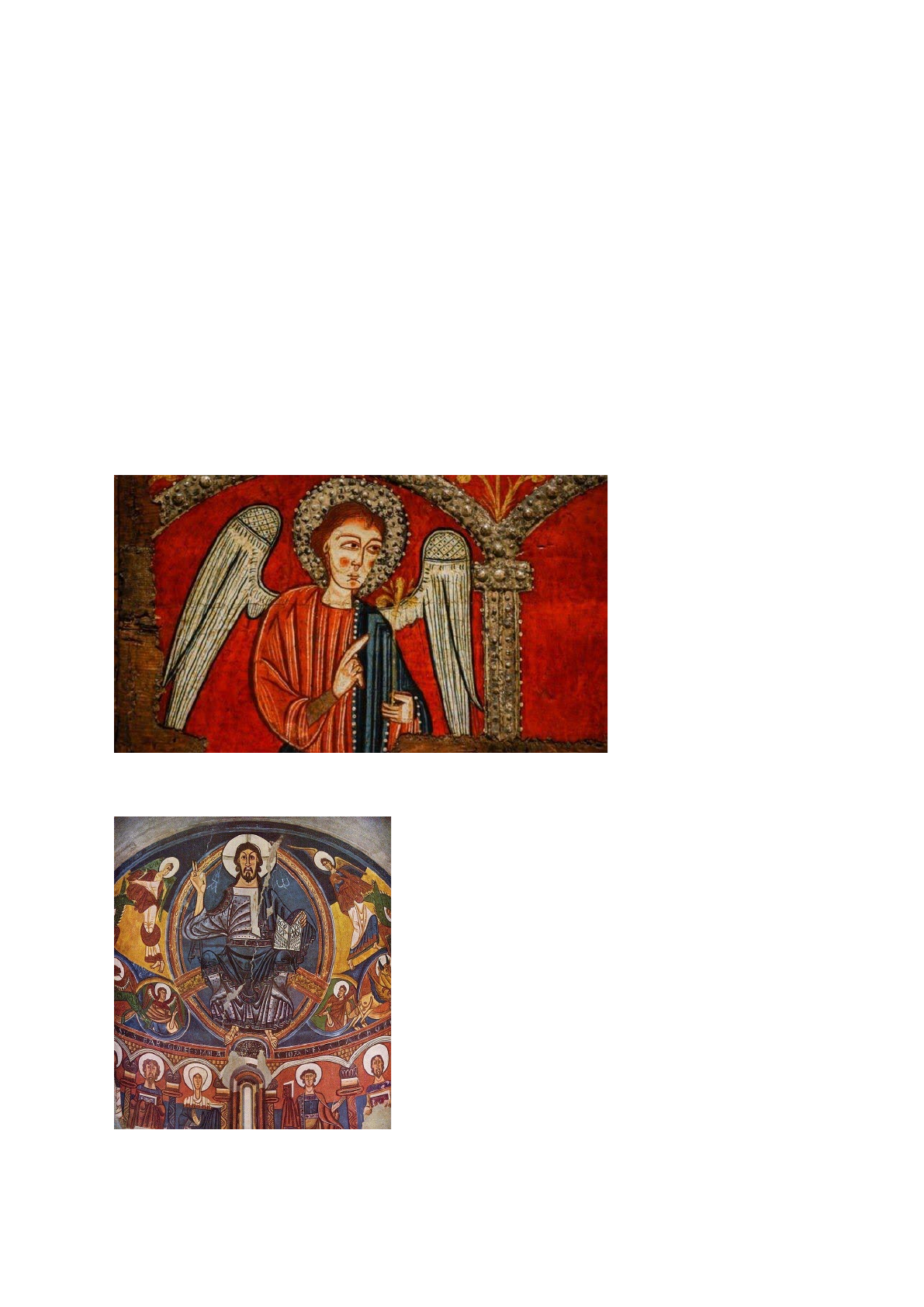 Arte românica Como eram feitas: Temas bíblicos e religiosos marcam a pintura românica. Geralmente, essas pinturas adornam as igrejas e catedrais da época. Foi utilizada a técnica do afresco, em que a pintura era feita sobre uma parede úmida. Diversos murais, iluminuras e tapeçarias surgem com temas religiosos. Feitas em cores vivas e fortes, elas preenchiam as paredes dos templos religiosos. Vale ressaltar, que na Idade Média, poucos sabiam ler e escrever e, assim, essas pinturas serviam de “alfabetização religiosa” para os mais leigos. Datas : surgiu durante a Idade Média, mais precisamente na Alta Idade Média (entre os séculos XI e XIII). Pintores: A maioria das obras de arte do período não tem autoria definida, pois o pensamento medieval pregava que o verdadeiro autor das obras era Deus. Anjo presente no altar frontal da Igreja Santa Maria de Mosoll (Espanha). A obra data do século XIII. Assim como outras criações românicas não há uma autoria identificada Pintura em mural que decora a Igreja de Sant Climent de Taüll (Espanha). Jesus Cristo ganha protagonismo por estar posicionado no centro da imagem e em grandes dimensões, característica presente em muitas obras românicas