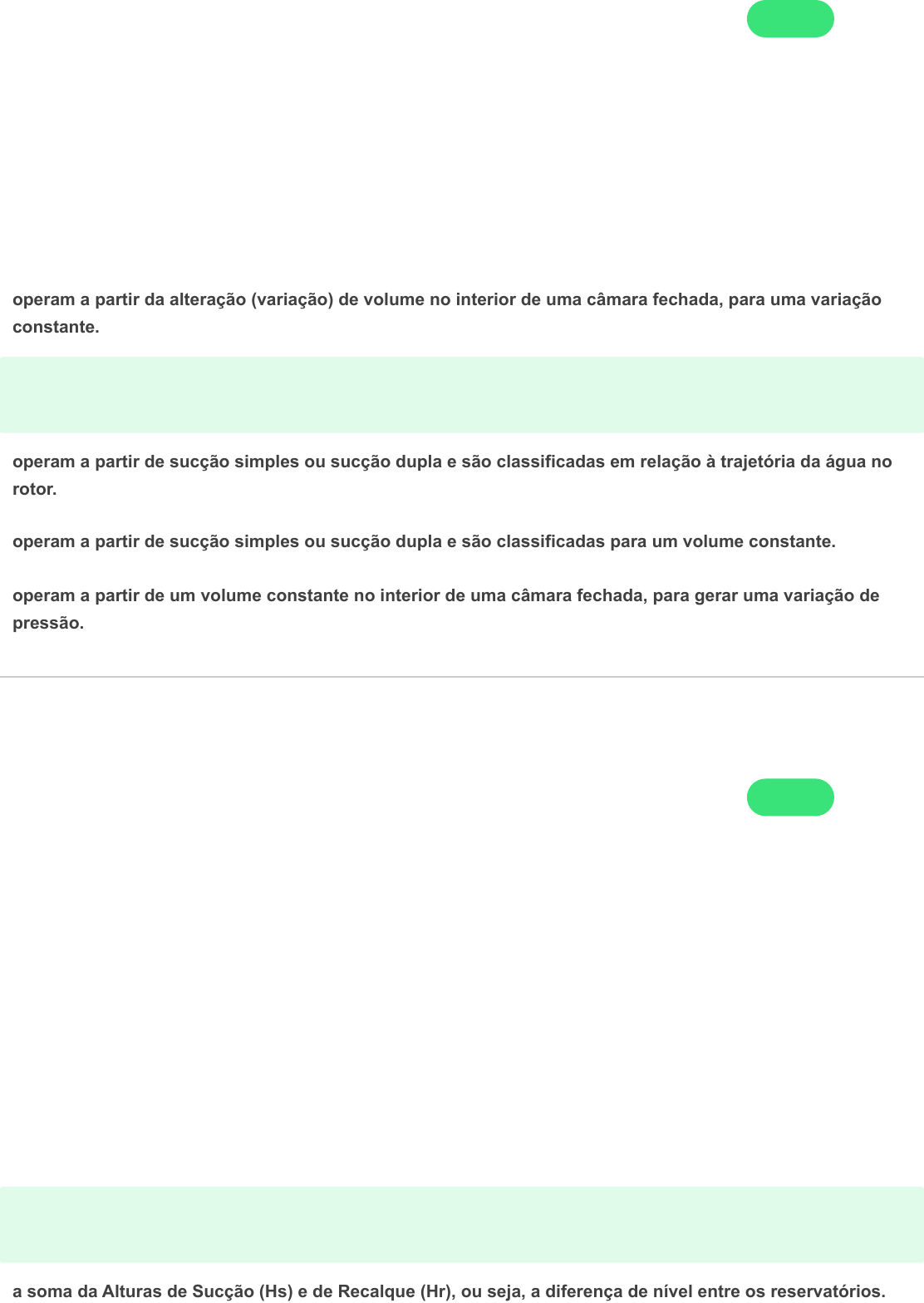 05/03/2023 16:52 Comentários https://sereduc.blackboard.com/ultra/courses/_147169_1/grades/assessment/_7217789_1/overview/attempt/_24439249_1/review/inline-feedback… 1/7 Ocultar opções de resposta Ocultar opções de resposta Pergunta 1 1 / 1 As bombas utilizadas em sistemas hidráulicos recebem diversas classificações, como em relação à trajetória do fluido, posição do eixo da bomba conforme o nível de água, entre outras. Dessa forma, cabe ao projetista analisar o sistema e bombas disponíveis para dimensionar o sistema hidráulico. Considerando essas informações e o conteúdo abordado sobre classificação das máquinas hidráulicas, pode-se afirmar que as bombas volumétricas: operam a partir da alteração (variação) de volume no interior de uma câmara fechada, para uma variação constante. Resposta correta operam a partir da alteração (variação) de volume no interior de uma câmara fechada, para gerar uma variação de pressão. operam a partir de sucção simples ou sucção dupla e são classificadas em relação à trajetória da água no rotor. operam a partir de sucção simples ou sucção dupla e são classificadas para um volume constante. operam a partir de um volume constante no interior de uma câmara fechada, para gerar uma variação de pressão. Pergunta 2 1 / 1 Leia o excerto a seguir: “O conjunto elevatório (bomba-motor) deverá vencer a diferença de nível entre os dois pontos, mais as perdas de carga em todo o percurso (perda por atrito ao longo da canalização e perdas de carga localizada devido às peças especiais).” Fonte: NETTO. A. Manual de hidráulica. 9. ed. São Paulo: Blucher, 2015. p. 270. (Adaptado). Considerando essas informações e o conteúdo abordado sobre máquinas hidráulicas, pode-se afirmar que a Altura Manométrica (Hm) é: Resposta correta a soma da Altura Geométrica (Hg) com as perdas de carga referente às tubulações e peças especiais de sucção (Δhs) e recalque (Δhr). a soma da Alturas de Sucção (Hs) e de Recalque (Hr), ou seja, a diferença de nível entre os reservatórios. 05/03/2023 16:52 Comentários https://sereduc.blackboard.com/ultra/courses/_147169_1/grades/assessment/_7217789_1/overview/attempt/_24439249_1/review/inline-feedback… 2/7 Ocultar opções de resposta a Altura Geométrica (Hg) subtraída das perdas de carga referente às tubulações e peças especiais de sucção (Δhs) e recalque (Δhr). a Altura de Sucção (Hs) subtraída da Altura de Recalque (Hr), ou seja, a diferença de nível entre os reservatórios. a soma da Altura Geométrica (Hg) com as perdas de carga referente às tubulações de recalque (Δhr). Pergunta 3 1 / 1 Leia o excerto a seguir: “Se a pressão de um líquido cai, a temperatura na qual ocorre a ebulição também cai. Segue-se que uma queda na pressão de magnitude suficiente induzirá a ebulição, mesmo em condições atmosféricas normais de temperatura.” Fonte: CHADWICK, A.; MORFETT, J.; BORTHWICK, M. Hidráulica em engenharia civil e ambiental. 5 ed. Estados Unidos: CRC Press, 2013, p. 97. Considerando essas informações e o conteúdo abordado sobre cavitação, analise os conceitos a seguir e associe-os com suas respectivas características. 1) Bolsão de ar. 2) Implosão da bolha. 3) Cavitação. 4) Rotor da bomba. ( ) É o efeito físico gerado por uma grande compressão nas bolhas, sendo esta a última etapa da cavitação. ( ) É o dispositivo que cria uma região de alta pressão no seu interior, o que condiciona (entre sua entrada e saída) a cavitação. ( ) São formados em uma região de baixa pressão na entrada do rotor, quando essa pressão é menor (ou igual) à pressão de vapor. ( ) É o fenômeno que ocorre em sistemas de bombeamento e causa danos ao sistema; assim, deve ser evitado. Agora, assinale a alternativa que apresenta a sequência correta: 2, 1, 4, 3. Resposta correta2, 4, 1, 3. 1, 2, 4, 3. 1, 4, 2, 3. 3, 2, 1, 4. 05/03/2023 16:52 Comentários https://sereduc.blackboard.com/ultra/courses/_147169_1/grades/assessment/_7217789_1/overview/attempt/_24439249_1/review/inline-feedback… 3/7 Ocultar opções de resposta Pergunta 4 0 / 1 Leia o excerto a seguir: “Bombas centrífugas podem ser aplicadas em muitos ambientes, como estações de tratamento de esgoto, sistemas de drenagem e sistemas de irrigação. Quando o impulsor gira na velocidade de projeto, ele transmite um componente de movimento ao fluido.” Fonte: CHADWICK, A.; MORFETT, J.; BORTHWICK, M. Hidráulica em engenharia civil e ambiental. 5 ed. Estados Unidos: CRC Press, 2013, p. 216. Considerando essas informações e o conteúdo abordado sobre classificação das máquinas hidráulicas, pode-se afirmar que a bomba centrífuga: apresenta melhor rendimento para baixas pressões e possui trajetória do fluxo de escoamento conforme um plano radial. apresenta melhor rendimento para altas pressões e possui trajetória do fluxo de escoamento conforme um plano axial. emprega força de sustentação; assim, o rotor é aerodinâmico com aspecto de hélice. Resposta correta apresenta melhor rendimento para altas pressões e possui trajetória do fluxo de escoamento conforme um plano radial, impelido pela força centrífuga (centro para fora). Incorreta: apresenta melhor rendimento para baixas pressões e possui trajetória do fluxo de escoamento conforme um plano radial, impelido pela força centrífuga (centro para fora). Pergunta 5 1 / 1 Leia o excerto a seguir: “A entrada de ar na tubulação de sucção pode ser causada por peças e juntas que vazam, pela formação de vórtices, assim como pela introdução e liberação de ar (ar entranhado, ar emulsionado e ar dissolvido). A tubulação de sucção deve ser perfeitamente estanque, para evitar vazamentos de água e introdução de ar.” Fonte: NETTO. A. Manual de hidráulica. 9. ed. São Paulo: Blucher, 2015. p. 279. 05/03/2023 16:52 Comentários https://sereduc.blackboard.com/ultra/courses/_147169_1/grades/a