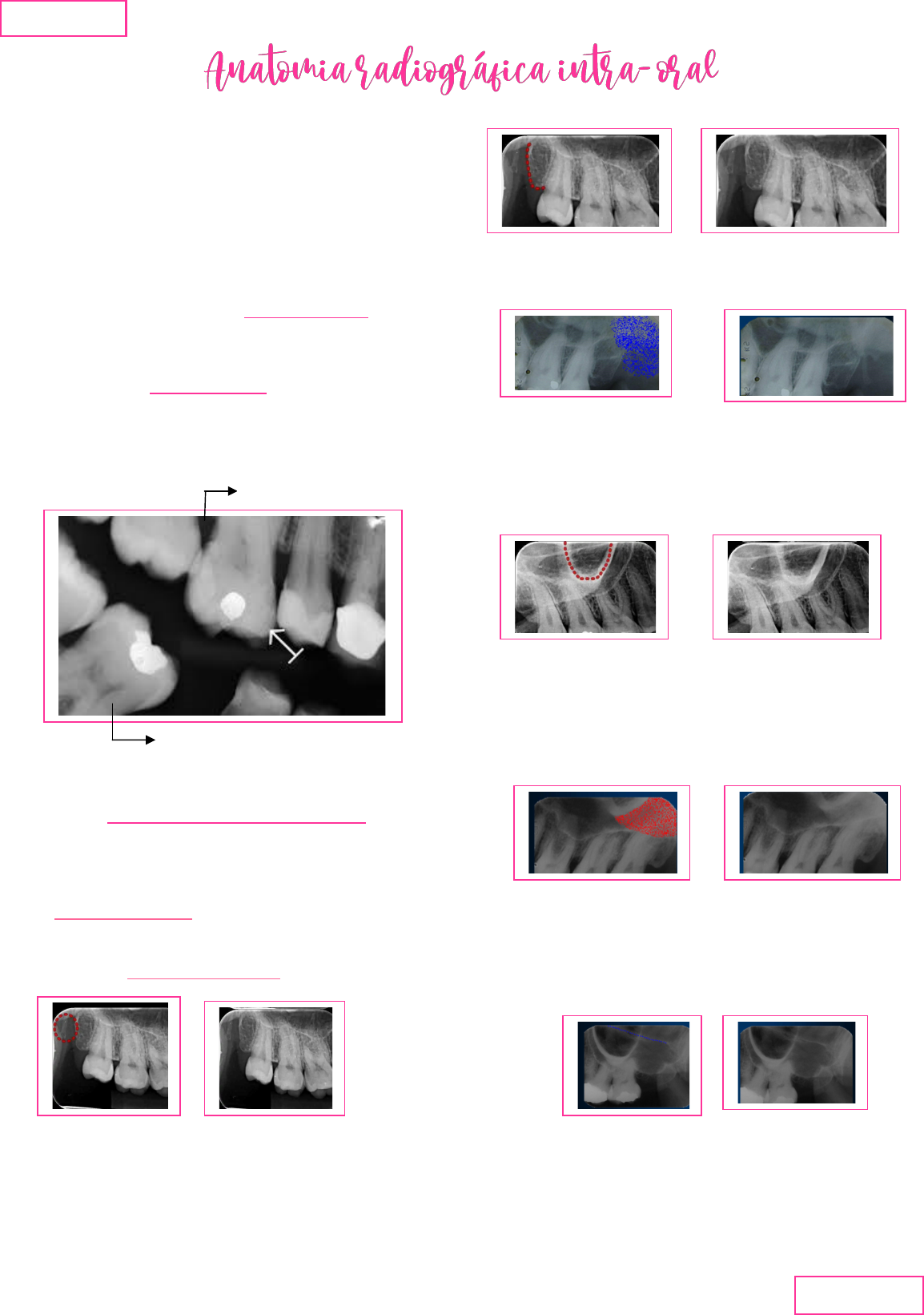 - As imagens radiográficas é um registro de raio sombras claras e escuras (radiação eletromagnética) -Radiopacos: quanto mais denso, mais cálcio e mais espessa a estrutura, ira absorver mais radiação, formando uma imagem branca., ex: esmalte - Radiolucida: imagem negra, ex: polpa. * restaurações metálicas são mais opacas, (brancas), pois absorvem totalmente a radiação. Estruturas da maxila: 1. Hâmulo piterigoide: - pouco radiopaco, pois a estrutura é fina, localizado na parte posterior quando se radiografa molares superiores. 2. Tuberosidade da maxila: - fica distalmente ao ultimo dente erupcionado, aspecto de osso reticulado. 3. Processo piterigoide: 4. Processo zigomático da maxila: - Aspecto de “u” ou “v”, sobressai o 1° e 2° molar 5. Osso zigomatico: - Em radiografia intra-oral não consegue visualizar o arco zigomático. 6. Soalho na fossa nasal. - Linha reta no alto da radiografia 7. Seio maxilar - inicia a partir de canino; Radiopacos Radiolucidos @ju_ferreiira @ju_ferreiira -radiolucido,delimitado por uma cortical (linha) -extensão em direção a tuberosidade da maxila; 8. Canais nutrientes: - são visualizados no interior do seio 9. Y invertido de Ennis: 10. Fossa nasal: (radiolucido) 11. 11. Septo nasal: ( radiopaco) 12. Espinha nasal anterior: 13. Concha nasal: 14. Sutura inter-maxilar: 15. Forame incisivo: 16. 16. Projeção do nariz (radiopaco): @ju_ferreiiraa @ju_ferreiira 17. Projeção do lábio: 18. Processo coronoide: - triangulo radiopaco, “ponta” virada maxila : * restaurações metálicas são mais opacas (brancas), pois absorvem totalmente a radiação. @ju_ferreiiraa @ju_ferreiiraaa