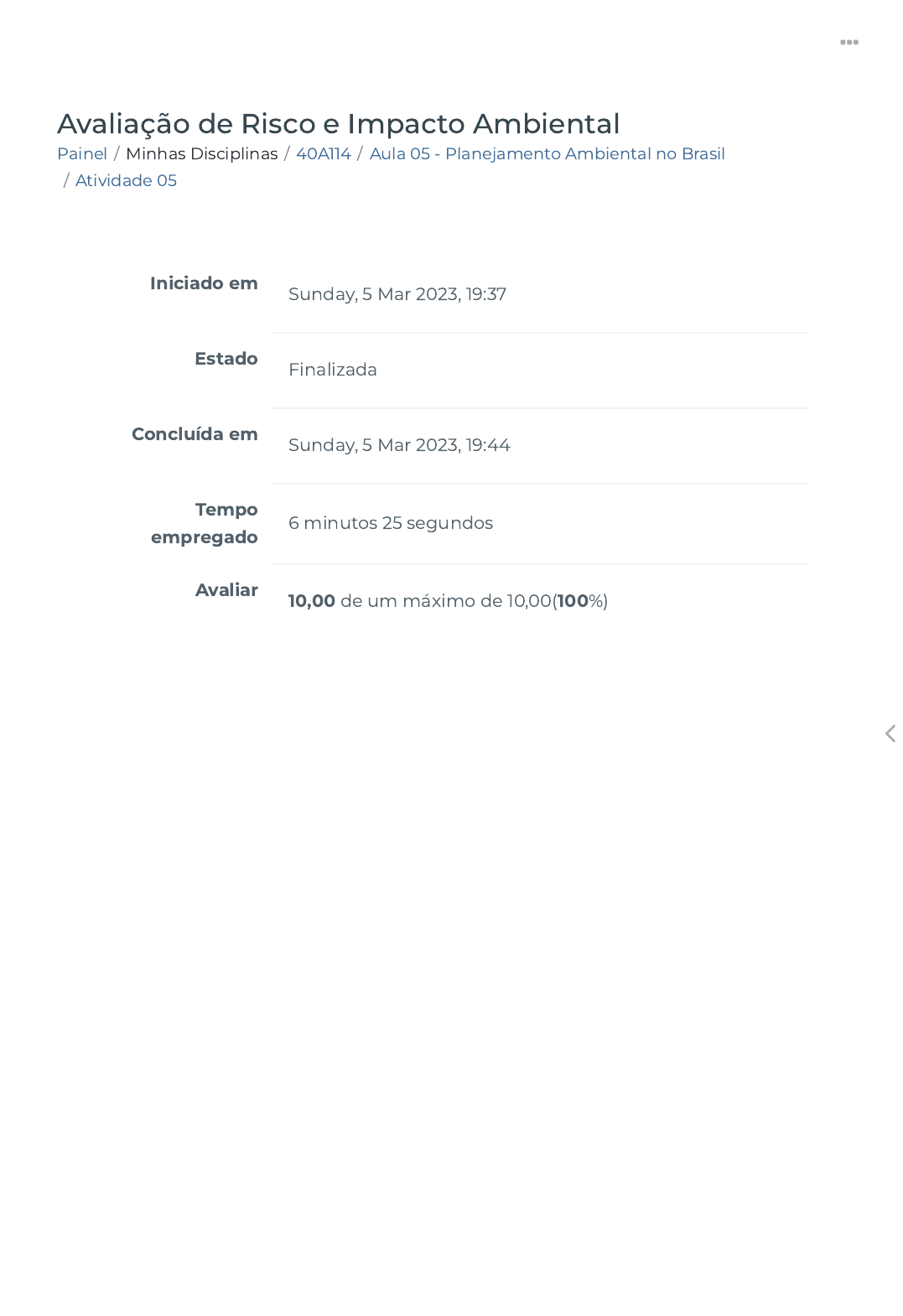 Painel / Minhas Disciplinas / 40A114 / Aula 05 - Planejamento Ambiental no Brasil / Atividade 05 Avaliação de Risco e Impacto Ambiental Iniciado em Sunday, 5 Mar 2023, 19:37 Estado Finalizada Concluída em Sunday, 5 Mar 2023, 19:44 Tempo empregado 6 minutos 25 segundos Avaliar 10,00 de um máximo de 10,00(100%) https://ava.politecnicabr.com.br/my/ https://ava.politecnicabr.com.br/course/view.php?id=1056 https://ava.politecnicabr.com.br/course/view.php?id=1056#section-7 https://ava.politecnicabr.com.br/mod/quiz/view.php?id=28008 https://ava.politecnicabr.com.br/ Questão 1 Correto Atingiu 2,00 de 2,00 Marque Verdadeiro ou Falso referente ao instrumento do Zoneamento Ambiental: ( ) O Decreto n. 4.297 de julho de 2002, de�ne que o zoneamento ambiental é regulamentado como zoneamento ecológico-econômico e tem como objetivo viabilizar o desenvolvimento sustentável a partir da compatibilização do desenvolvimento socioeconômico com a conservação ambiental. ( ) Um dos resultados do zoneamento ambiental é a divisão da área explorada, nas quais as atividades são controladas, ou seja, algumas atividades são permitidas enquanto outras não. ( ) Além do zoneamento ecológico-econômico, segundo Soares (2015), existem outros que também são importantes para o planejamento ambiental rumo ao desenvolvimento sustentável e que devem ser utilizados tanto pelo poder público na elaboração e aplicação de políticas públicas como pelo setor privado em suas atividades produtivas. ( ) Os pro�ssionais que atuam com o zoneamento, utilizam-no como um instrumento de manejo e controle das características físicas, biológicas e socioeconômicas de zonas urbanas, rurais e também de áreas naturais como unidades de conservação, por meio da imposição de restrições a variáveis. Escolha uma opção: a. F, V, V, V. b. V, F, F, V. c. V, F, V, V. d. V, V, V, F. e. V, V, V, V. https://ava.politecnicabr.com.br/ Questão 2 Correto Atingiu 2,00 de 2,00 Assinale Verdadeiro ou Falso conforme o texto a seguir: Um dos principais instrumentos para o planejamento ambiental é o zoneamento, que está inclusive instituído como um ordenamento jurídico na legislação brasileira pela Lei Federal 6.938, que dispõe sobre a Política Nacional do Meio Ambiente e cria o zoneamento ambiental como instrumento desta lei. Através do Decreto n. 4.295 de julho de 2012, o zoneamento ambiental é regulamentado como zoneamento ecológico- econômico, com os seguintes objetivos e princípios: Art. 2. O ZEE, instrumento de organização do território a ser obrigatoriamente seguido na implantação de planos, obras e atividades públicas e privadas, estabelece medidas e padrões de proteção ambiental destinados a assegurar a qualidade ambiental, dos recursos hídricos e do solo e a conservação da biodiversidade, garantindo o desenvolvimento sustentável e a melhoria das condições de vida da população. Art. 3. O ZEE tem por objetivo geral organizar, de forma vinculada, as decisões dos agentes públicos e privados quanto a planos, programas, projetos e atividades que, direta ou indiretamente, utilizem recursos naturais, assegurando a plena manutenção do capital e dos serviços ambientais dos ecossistemas . (BRASIL, 2002). Nas esferas do poder público, o zoneamento ambiental visa subsidiar os governos municipais, estaduais e federal em processos de planejamento e de ordenação do uso do solo e da ocupação do território, bem como da utilização dos recursos ambientais. Esse instrumento normalmente está presente nos planos diretores municipais, planos de desenvolvimento regional e também nos planos de manejo das unidades de conservação. Para o setor privado, o zoneamento ambiental é um importante instrumento de gestão ambiental, tanto dentro dos pátios industriais, organizando zonas, rotas e logísticas de produção, como também no campo onde são extraídas as matérias-primas para os processos industriais como, por exemplo, em cultivos agrícolas, ações de mineração, extração de recursos naturais como produtos madeireiros e não madeireiros e também pesqueiros. Escolha uma opção: https://ava.politecnicabr.com.br/ Questão 3 Correto Atingiu 2,00 de 2,00 Dentre tantas consequências dessas formas de desenvolvimento, que inclusive são praticados até hoje como uma forma de herança cultural do Brasil colonial, tanto nas cidades como no meio rural, podemos destacar: Escolha uma opção: Verdadeiro Falso a. Poluição do ar atmosférico pelas emissões de poluentes industriais e o fogo das queimadas. b. Destinação do lixo de maneira inadequada poluindo inúmeros mananciais de água. c. Destruição das �orestas de uma maneira muito rápida e com métodos dizimadores como campanhas de corte de madeiras e o fogo (HOLANDA, 1995). d. Poluição dos rios com esgotos lançados no meio ambiente sem tratamento prévio. e. Todas as alternativas anteriores. https://ava.politecnicabr.com.br/ Questão 4 Correto Atingiu 2,00 de 2,00 As principais variáveis que são analisadas em um planejamento ambiental estão distribuídas pelos meios físico, biótico e socioeconômico e podem variar conforme o estudo quanto a sua relevância (peso) ou mesmo a sua presença na análise. Associe adequadamente as principais variáveis que são analisadas em um planejamento ambiental. Veri�ca a coleta e destino do resíduo sólido identi�cando problemas e soluções. Veri�ca a necessidade da conservação do solo e da água. Veri�ca a diversidade biológica da fauna e �ora identi�cando se há espécies ameaçadas de extinção e/ou importantes para o equilíbrio ecológico. Veri�ca a conservação e produção de água para consumo humano. Veri�ca as bacias hidrográ�cas com suas malhas hídricas e características. Veri�ca os tipos �to�sionômicos visando à recuperação de paisagens degradadas. Coleta e destin Susceptibilida Biodiversidade Mananciais pú Bacias hidrogr Vegetação re