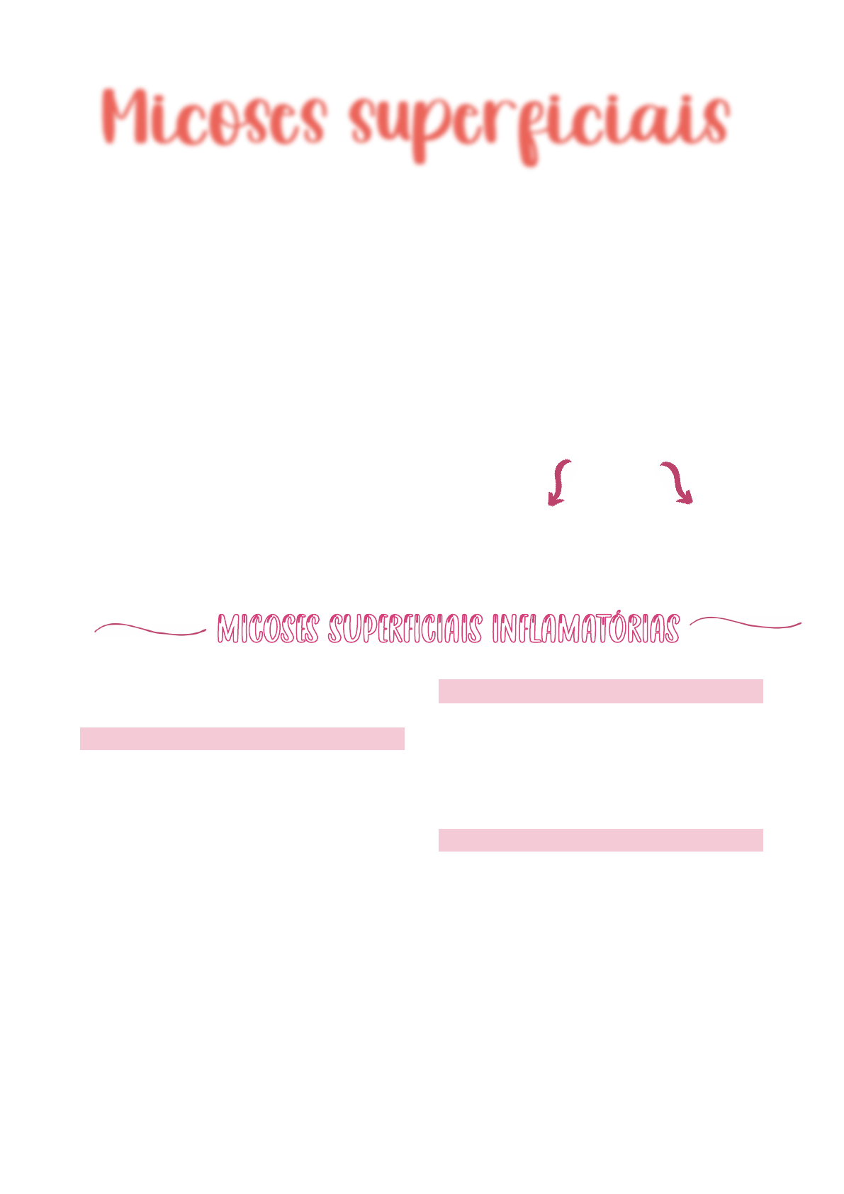 Juliana Silva | 1 Dermatologia Micoses superficiais! São infecções fúngicas da pele, cabelo e unhas — raramente invadem a pele ou órgãos internos (comprometimento extracutâneos) Importância: ⇢ Muito frequentes ⇢ Causam morbidade e favorecem a infecções bacterianas (é comum que o paciente tenha uma micose e sofra infecção bacteriana secundária) ⇢ Calor, umidade do meio ambiente e sudorese abundan te favorecem desenvo lv imen to (esportistas, habitantes de regiões quentes são mais sujeitos) ⇢ Também há condições sistêmicas que favorecem o surgimento, qualquer imunossupressão, principalmente diabetes mellitus ⇢ O quadro clínico pode ser inf lamatório, predominando eritema ou pode ser não inf lamatório Também são chamadas de dermatof itoses. Agentes: ⇢ Microsporum ⇢ Trichophyton ⇢ Epidermophyton Os agentes se dispõem em hifas! O quadro clínico resulta da ação direta do fungo na pele no fânero e da resposta imunológica do paciente que leva ao eritema. Patogenia:: ⇢ Ação direta do fungo ⇢ Resposta imunológica → eritema Epidemiologia: ⇢ Tinha de couro cabeludo: mais comum em crianças A mãe traz a criança com queixa de alopecia. Ao exame, tem-se pontos de saída de secreção purulenta. ⇢ Tinha inguinal e do pé: homem adulto (roupa e calçados). Micoses superficiais Micoses superficiais inflamatórias Micoses superficiais não inflamatórias Micoses superficiais inflamatórias Juliana Silva | 2 Dermatologia As tineas podem comprometer toda a pele, couro cabeludo, unhas, sola dos pés. No couro cabeludo é raro nos adultos, é quase exclusivo da infância. Já, na região inguinal e pé, é mais comum em homens adultos. Classificação: Fungos antropofílicos • Fungo parasita queratina do pelo e da epiderme → descamação e alopecia • São transmissíveis de um individuo para o outro • Quadro menos inf lamatório • São fungos adaptados ao ser humano Fungos zoofílicos: • Fungos encontrados em animais • Dermatof itoses intensamente inf lamatórias, podendo ser supurativas • Não são transmissíveis entre humanos Fungos geofílicos: • Originados do solo; por contato direto infectam humanos Fatores de risco: ⇢ Umidade ⇢ Pele lesada Fatores de proteção: ⇢ Ácidos graxos da pele ⇢ Descamação natural da pele Modo de transmissão: ⇢ Contato direto com animais, solo ou pessoas ⇢ Contato indireto (material contaminado) Tinea capitis ou Tinha do couro cabeludo ➡ Compromete principalmente crianças, indivíduos na faixa pediátrica antes da puberdade Transmissão: ‣ Contato com indivíduos infectados, animais ou terra Agentes: ‣ Trichophyton (antropofílico) → é mais adaptado ao ser humano, o quadro é menos exuberante ‣ Microsporum (zoofílico) • Tem maior af inidade pelo animal → muitas vezes o animal de estimação não apresenta nenhum quadro clínico, porque o fungo é bem adaptado a eles. Quando entra em contato com a pele humana, o fungo gera uma reação imunológica mais exuberante • O quadro clínico é tão exuberante que pode ser confundido com abscesso (infecção bacteriana) → quadro de alopecia com intensa inf lamação e supurarão no couro cabeludo. ➡ Invade o folículo, quebra a haste do pelo e invade a área circunjacente ➡ Paciente pode ter lesão única ou múltipla ➡ Não é comum individuos da mesma família acometidos Juliana Silva | 3 Dermatologia ➡ Transmite de uma criança para outra ➡ Manifesta-se com áreas de perda de cabeludo Quadro clínico: ‣ Tinha tonsurante ‣ Querion Como eles parasitam a haste, é por isso que o pelo quebra — tonsura é um outro nome técnico para se designar a pelo cortado. A presença do fungo dentro do pelo causa partição deste pelo, causando alopecia. Tinha tonsurante: • Forma não inf lamatória • Lesões únicas ou múltiplas, um ou mais membros de família, com tendência a cronicidade • Placas de tonsura = cabelos partidos + descamação Quérion: • Forma inf lamatória → é uma forma hiper inf lamatória de infecção fúngica • Placa única, surge de modo agudo • Elevada, dolorosa com pústulas e microabscessos • Não há infecção bacteriana, é reação exarcebada ao fungo • Aparecimento agudo, placa única, pode aparecer abscesso, individuo afebril, tem sinais de dor Dermatoscopia: ‣ Pelos em saca-rolha ou em vírgula Com isso já conseguimos conf irmar o diagnóstico! Tratamento oral mandatório: É OBRIGATÓRIO! A tinea atinge a profundidade do folículo, se o tratamento for tópico, f icaria apenas na superfície. Por isso que o tratamento precisa ser via oral, por no mínimo 8 - 12 semanas até, em média, 4 meses. 1ª escolha: Griseofulvina ou terbinaf ina via orał por período mínimo de 8-12 semanas, até a cura clínica e laboratorial. Alternativas: itraconazol e f luconazol (alto índice de falhas) → tem no posto de saúde mas não trata adequadamente Complementar: tópicos e xampu antifúngicos (elimina fômites) — principalmente na forma tonsurante para evitar disseminação aos contactantes → não são adequados para esse tipo de tratamento ‣ Verif icar necessidade de tratar demais membros da família nos casos de múltiplas placas (ver se Juliana Silva | 4 Dermatologia precisa tratar outros membros da família) → nas tineas pouco inf lamatórias ‣ Tratar animal, que pode ter comprometimento discreto Atenção! o tratamento via oral é necessário pois os tópicos não penetram na profundidade do folículo Tinea corporis “Tinha da pele glabra" ➡ Também chamada de tinea do corpo! ➡ Distribuição mundial, mas é mais frequente em climas quentes e úmidos e em pessoas imunossuprimidas ➡ Compromete todos os individuos, com mais i n tens i dade/exuberan te nos pac i en tes imunossuprimidos ➡ Em imunossuprimidos e diabéticos → quase sem inf lamação, formas extensas, mas com borda nítida, por vezes referida como “tinea incógnito” Agentes: ‣