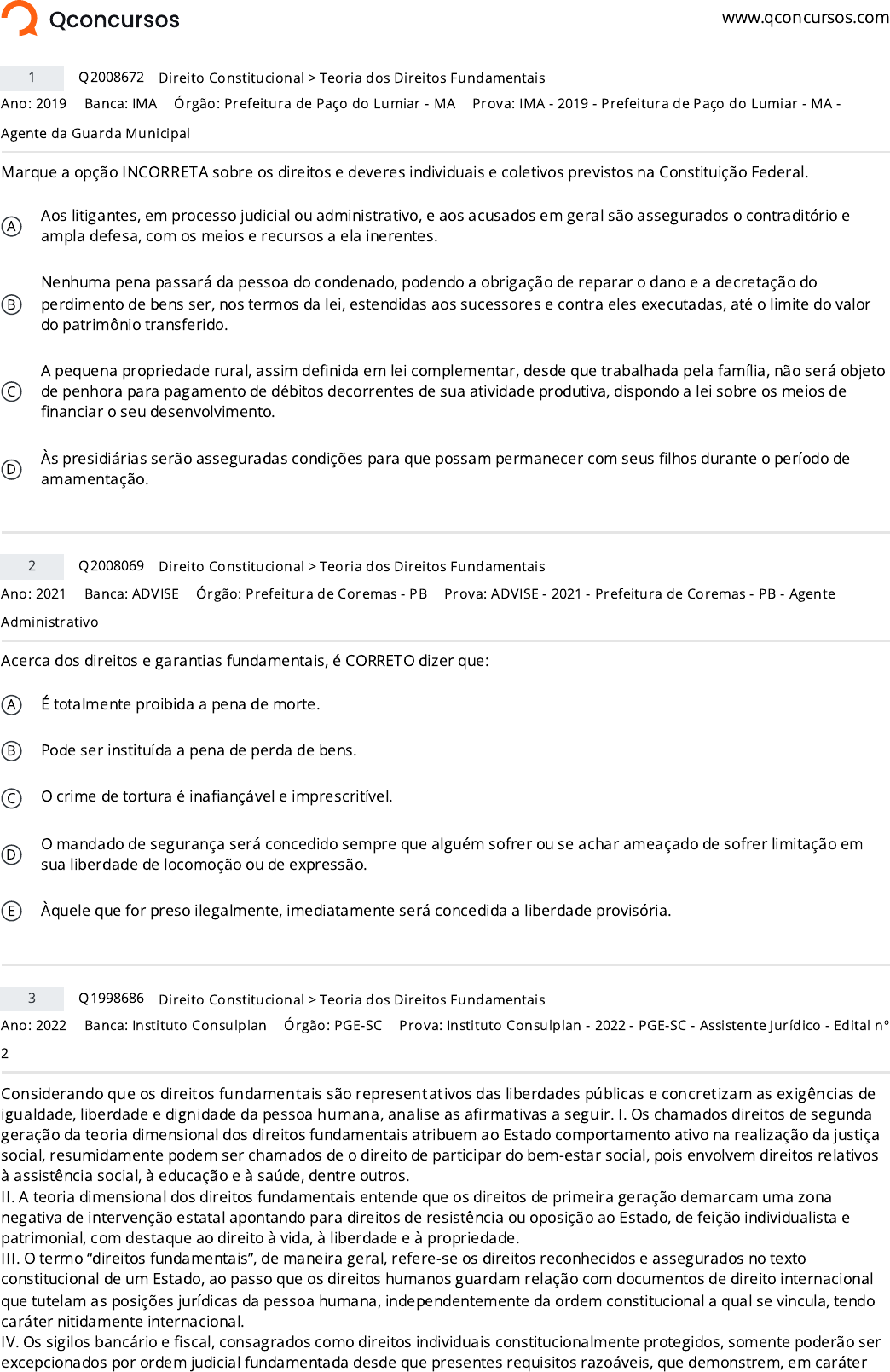 www.qconcursos.com Ano: 2019 Banca: IMA Órgão: Prefeitura de Paço do Lumiar - MA Marque a opção INCORRETA sobre os direitos e deveres individuais e coletivos previstos na Constituição Federal. A Aos litigantes, em processo judicial ou administrativo, e aos acusados em geral são assegurados o contraditório e ampla defesa, com os meios e recursos a ela inerentes. B Nenhuma pena passará da pessoa do condenado, podendo a obrigação de reparar o dano e a decretação do perdimento de bens ser, nos termos da lei, estendidas aos sucessores e contra eles executadas, até o limite do valor do patrimônio transferido. C A pequena propriedade rural, assim de�nida em lei complementar, desde que trabalhada pela família, não será objeto de penhora para pagamento de débitos decorrentes de sua atividade produtiva, dispondo a lei sobre os meios de �nanciar o seu desenvolvimento. D Às presidiárias serão asseguradas condições para que possam permanecer com seus �lhos durante o período de amamentação. Ano: 2021 Banca: ADVISE Órgão: Prefeitura de Coremas - PB Acerca dos direitos e garantias fundamentais, é CORRETO dizer que: A É totalmente proibida a pena de morte. B Pode ser instituída a pena de perda de bens. C O crime de tortura é ina�ançável e imprescritível. D O mandado de segurança será concedido sempre que alguém sofrer ou se achar ameaçado de sofrer limitação em sua liberdade de locomoção ou de expressão. E Àquele que for preso ilegalmente, imediatamente será concedida a liberdade provisória. Ano: 2022 Banca: Instituto Consulplan Órgão: PGE-SC Considerando que os direitos fundamentais são representativos das liberdades públicas e concretizam as exigências de igualdade, liberdade e dignidade da pessoa humana, analise as a�rmativas a seguir. I. Os chamados direitos de segunda geração da teoria dimensional dos direitos fundamentais atribuem ao Estado comportamento ativo na realização da justiça social, resumidamente podem ser chamados de o direito de participar do bem-estar social, pois envolvem direitos relativos à assistência social, à educação e à saúde, dentre outros. II. A teoria dimensional dos direitos fundamentais entende que os direitos de primeira geração demarcam uma zona negativa de intervenção estatal apontando para direitos de resistência ou oposição ao Estado, de feição individualista e patrimonial, com destaque ao direito à vida, à liberdade e à propriedade. III. O termo “direitos fundamentais”, de maneira geral, refere-se os direitos reconhecidos e assegurados no texto constitucional de um Estado, ao passo que os direitos humanos guardam relação com documentos de direito internacional que tutelam as posições jurídicas da pessoa humana, independentemente da ordem constitucional a qual se vincula, tendo caráter nitidamente internacional. IV. Os sigilos bancário e �scal, consagrados como direitos individuais constitucionalmente protegidos, somente poderão ser excepcionados por ordem judicial fundamentada desde que presentes requisitos razoáveis, que demonstrem, em caráter 1 Q2008672 >Direito Constitucional Teoria dos Direitos Fundamentais Prova: IMA - 2019 - Prefeitura de Paço do Lumiar - MA - Agente da Guarda Municipal 2 Q2008069 >Direito Constitucional Teoria dos Direitos Fundamentais Prova: ADVISE - 2021 - Prefeitura de Coremas - PB - Agente Administrativo 3 Q1998686 >Direito Constitucional Teoria dos Direitos Fundamentais Prova: Instituto Consulplan - 2022 - PGE-SC - Assistente Jurídico - Edital nº 2 https://www.qconcursos.com/ https://www.qconcursos.com/questoes-de-concursos/bancas/ima https://www.qconcursos.com/questoes-de-concursos/institutos/prefeitura-de-paco-do-lumiar-ma https://www.qconcursos.com/questoes-de-concursos/bancas/advise https://www.qconcursos.com/questoes-de-concursos/institutos/prefeitura-de-coremas-pb https://www.qconcursos.com/questoes-de-concursos/bancas/instituto-consulplan https://www.qconcursos.com/questoes-de-concursos/institutos/pge-sc https://www.qconcursos.com/questoes-de-concursos/questoes/913dce14-8a https://www.qconcursos.com/questoes-de-concursos/disciplinas/direito-direito-constitucional https://www.qconcursos.com/questoes-de-concursos/disciplinas/direito-direito-constitucional/teoria-dos-direitos-fundamentais https://www.qconcursos.com/questoes-de-concursos/provas/ima-2019-prefeitura-de-paco-do-lumiar-ma-agente-da-guarda-municipal https://www.qconcursos.com/questoes-de-concursos/questoes/733e3c2d-89 https://www.qconcursos.com/questoes-de-concursos/disciplinas/direito-direito-constitucional https://www.qconcursos.com/questoes-de-concursos/disciplinas/direito-direito-constitucional/teoria-dos-direitos-fundamentais https://www.qconcursos.com/questoes-de-concursos/provas/advise-2021-prefeitura-de-coremas-pb-agente-administrativo https://www.qconcursos.com/questoes-de-concursos/questoes/795ff7ac-81 https://www.qconcursos.com/questoes-de-concursos/disciplinas/direito-direito-constitucional https://www.qconcursos.com/questoes-de-concursos/disciplinas/direito-direito-constitucional/teoria-dos-direitos-fundamentais https://www.qconcursos.com/questoes-de-concursos/provas/instituto-consulplan-2022-pge-sc-assistente-juridico-edital-n-2 restrito e nos estritos limites legais, a necessidade de conhecimento dos dados sigilosos. Está correto o que se a�rma apenas em A I e II. B I e IV. C III e IV. D I, II e III. E II, III e IV. Ano: 2022 Banca: Instituto Consulplan Órgão: PGE-SC Embora elaborada em 1988, a Constituição Federal possui dispositivos que, a despeito de não mencionarem expressamente, também se aplicam à seara da tecnologia, informática e meios digitais modernos de comunicação. Com isso em mente, marque V para as a�rmativas verdadeiras e F para as falsas. ( ) A proteção dos dados pessoais, embora não prevista como direito fundamental, é assegurada, nos termos da lei, inclusive nos meios digitais. ( ) No caso de uma publicação em meios