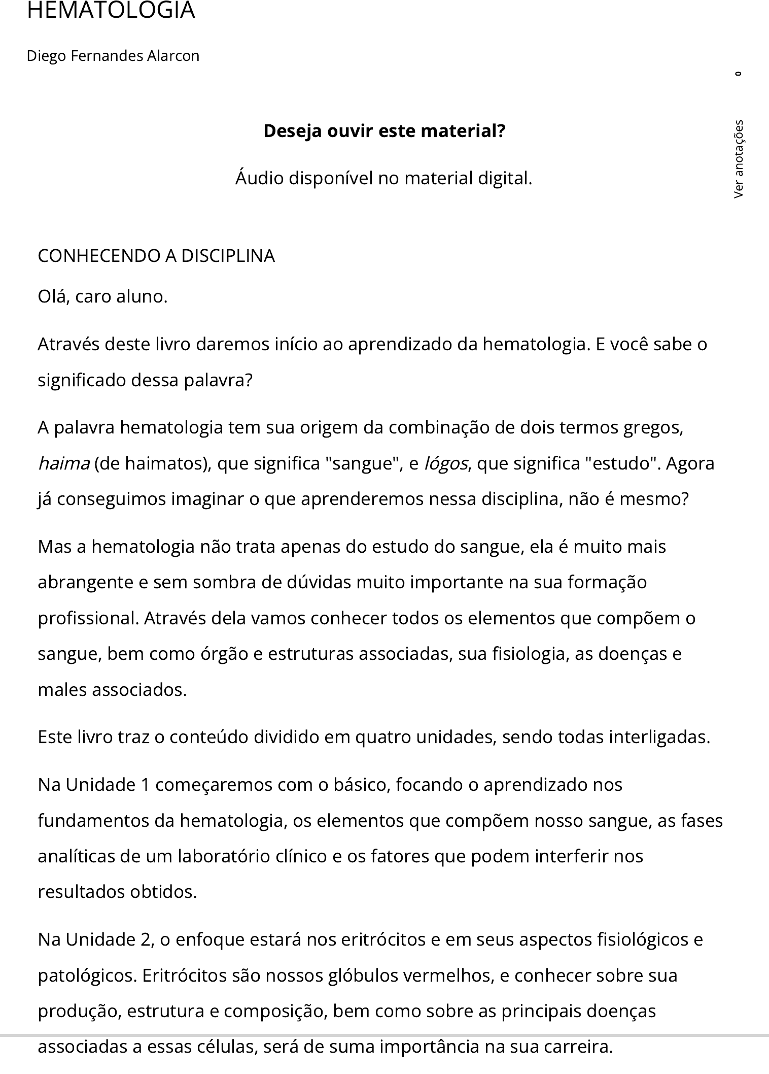 07/02/2023 18:33 lddkls212_hem https://www.colaboraread.com.br/integracaoAlgetec/index?usuarioEmail=marineri0017%40gmail.com&usuarioNome=MARILENE+NERY+GONÇALVES&disciplinaDescricao=HEMATOLOGIA&atividadeId=3495926&… 1/2 HEMATOLOGIA Diego Fernandes Alarcon Imprimir CONHECENDO A DISCIPLINA Olá, caro aluno. Através deste livro daremos início ao aprendizado da hematologia. E você sabe o signi�cado dessa palavra? A palavra hematologia tem sua origem da combinação de dois termos gregos, haima (de haimatos), que signi�ca "sangue", e lógos, que signi�ca "estudo". Agora já conseguimos imaginar o que aprenderemos nessa disciplina, não é mesmo? Mas a hematologia não trata apenas do estudo do sangue, ela é muito mais abrangente e sem sombra de dúvidas muito importante na sua formação pro�ssional. Através dela vamos conhecer todos os elementos que compõem o sangue, bem como órgão e estruturas associadas, sua �siologia, as doenças e males associados. Este livro traz o conteúdo dividido em quatro unidades, sendo todas interligadas. Na Unidade 1 começaremos com o básico, focando o aprendizado nos fundamentos da hematologia, os elementos que compõem nosso sangue, as fases analíticas de um laboratório clínico e os fatores que podem interferir nos resultados obtidos. Na Unidade 2, o enfoque estará nos eritrócitos e em seus aspectos �siológicos e patológicos. Eritrócitos são nossos glóbulos vermelhos, e conhecer sobre sua produção, estrutura e composição, bem como sobre as principais doenças associadas a essas células, será de suma importância na sua carreira. Deseja ouvir este material? Áudio disponível no material digital. 0 V e r a n o ta çõ e s 07/02/2023 18:33 lddkls212_hem https://www.colaboraread.com.br/integracaoAlgetec/index?usuarioEmail=marineri0017%40gmail.com&usuarioNome=MARILENE+NERY+GONÇALVES&disciplinaDescricao=HEMATOLOGIA&atividadeId=3495926&… 2/2 Seguindo, chegaremos à Unidade 3, em que vamos aprender mais sobre outro tipo de célula que compõe o sangue, os leucócitos. São também conhecidos como glóbulos brancos, com um papel muito importante, pois são os responsáveis pela defesa do nosso organismo. Por �m, na Unidade 4 vamos conhecer as plaquetas e o processo de coagulação, como ele funciona no nosso organismo e os tipos de patologias associados a esse processo. Em cada seção você irá se deparar com situações-problema e, com base no que foi discutido e adquirido no processo de aprendizagem, colocará em prática os seus conhecimentos a �m de encontrar respostas. Assim, desejo que você possa aproveitar o conteúdo deste material, enriquecendo seu conhecimento acerca desta temática tão instigante. Você é capaz? Tenho certeza que sim! Bons estudos e sucesso! 0 V e r a n o ta çõ e s 07/02/2023 18:36 lddkls212_hem https://www.colaboraread.com.br/integracaoAlgetec/index?usuarioEmail=marineri0017%40gmail.com&usuarioNome=MARILENE+NERY+GONÇALVES&disciplinaDescricao=HEMATOLOGIA&atividadeId=3495926… 1/16 NÃO PODE FALTAR CONTROLE DE QUALIDADE LABORATORIAL EM HEMATOLOGIA Diego Fernandes Alarcon Imprimir CONVITE AO ESTUDO Nesta unidade, discutiremos as fases de um processo de análises clínicas, entendendo os cuidados para impedir possíveis erros na obtenção e análise dos resultados. Vamos aprender também sobre os elementos que compõem o sangue e sobre os parâmetros avaliados no hemograma, identi�cando possíveis interferentes nos resultados. Fonte: Shutterstock. Deseja ouvir este material? Áudio disponível no material digital. 0 V e r a n o ta çõ e s 07/02/2023 18:36 lddkls212_hem https://www.colaboraread.com.br/integracaoAlgetec/index?usuarioEmail=marineri0017%40gmail.com&usuarioNome=MARILENE+NERY+GONÇALVES&disciplinaDescricao=HEMATOLOGIA&atividadeId=3495926… 2/16 Nosso sangue possui uma parte líquida e uma parte sólida. A parte sólida é chamada de elementos �gurados e é composta basicamente de células e fragmentos de células. Nesta unidade vamos conhecer todos esses elementos vitais para o bom funcionamento de nosso organismo. As células do nosso sangue são compostas por elementos bioquímicos que também podem ser avaliados em um exame laboratorial. A hemoglobina é uma proteína muito importante, sendo ela o elemento mais abundante de um glóbulo vermelho. Alterações na quantidade, forma e composição das hemoglobinas podem afetar completamente sua função e consequentemente o funcionamento de um organismo. Assim, aprenderemos também sobre as estruturas que compõem nossas células sanguíneas e os possíveis problemas associados a elas. Todos esses fatores são avaliados a partir de um exame clínico chamado de hemograma. Você sabe o que é um hemograma? É o exame mais solicitado pelos médicos, sendo responsável por envolver uma série de informações relevantes sobre o metabolismo de um indivíduo, podendo apresentar alterações pontuais ou recorrentes, as quais são identi�cadas através da análise dos índices hematimétricos. Aqui vamos ajudá-lo a entender esse exame, conhecendo os parâmetros que nele são analisados e de que forma eles auxiliam a identi�car os diversos males que podem acometer nosso organismo. PRATICAR PARA APRENDER Caro aluno, nesta primeira seção vamos conhecer um pouco mais sobre a rotina em um laboratório de análises clínicas, desde o procedimento da coleta do sangue até a elaboração dos resultados obtidos. Você com certeza já precisou passar por uma consulta médica em que lhe foi solicitado algum exame clínico, correto? Agora, você já parou para pensar em como esses exames são realizados? 0 V e r a n o ta çõ e s 07/02/2023 18:36 lddkls212_hem https://www.colaboraread.com.br/integracaoAlgetec/index?usuarioEmail=marineri0017%40gmail.com&usuarioNome=MARILENE+NERY+GONÇALVES&disciplinaDescricao=HEMATOLOGIA&atividadeId=3495926… 3/16 Na rotina de um laboratório, no processo de elaboração de exames clínicos, temos a d