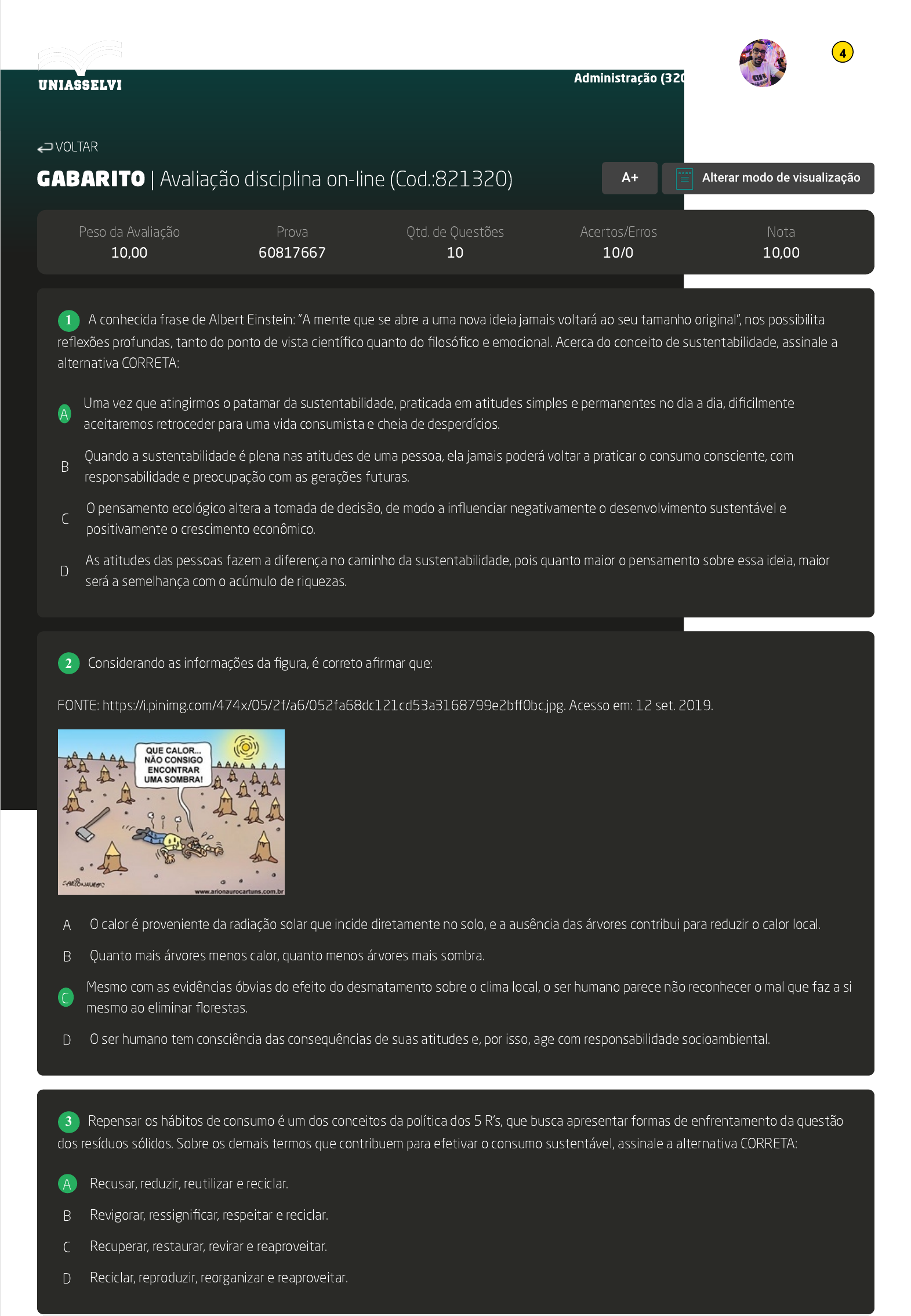 07/03/2023, 21:04 AVA https://ava2.uniasselvi.com.br/subject/grades-and-tests/answer-book/eyJ0ZXN0Ijp7InRlc3RDb2RlIjoiODIxMzIwIiwiZGVzY3JpcHRpb24iOiJBdmFsaWHDp8OjbyBkaXNjaXBsaW5hIG9uLWxpbmUiLCJwYXJhbWV0ZXIi… 1/4 GABARITO | Avaliação disciplina on-line (Cod.:821320) Peso da Avaliação 10,00 Prova 60817667 Qtd. de Questões 10 Acertos/Erros 10/0 Nota 10,00 A conhecida frase de Albert Einstein: "A mente que se abre a uma nova ideia jamais voltará ao seu tamanho original", nos possibilita reflexões profundas, tanto do ponto de vista científico quanto do filosófico e emocional. Acerca do conceito de sustentabilidade, assinale a alternativa CORRETA: A Uma vez que atingirmos o patamar da sustentabilidade, praticada em atitudes simples e permanentes no dia a dia, dificilmente aceitaremos retroceder para uma vida consumista e cheia de desperdícios. B Quando a sustentabilidade é plena nas atitudes de uma pessoa, ela jamais poderá voltar a praticar o consumo consciente, com responsabilidade e preocupação com as gerações futuras. C O pensamento ecológico altera a tomada de decisão, de modo a influenciar negativamente o desenvolvimento sustentável e positivamente o crescimento econômico. D As atitudes das pessoas fazem a diferença no caminho da sustentabilidade, pois quanto maior o pensamento sobre essa ideia, maior será a semelhança com o acúmulo de riquezas. Considerando as informações da figura, é correto afirmar que: FONTE: https://i.pinimg.com/474x/05/2f/a6/052fa68dc121cd53a3168799e2bff0bc.jpg. Acesso em: 12 set. 2019. A O calor é proveniente da radiação solar que incide diretamente no solo, e a ausência das árvores contribui para reduzir o calor local. B Quanto mais árvores menos calor, quanto menos árvores mais sombra. C Mesmo com as evidências óbvias do efeito do desmatamento sobre o clima local, o ser humano parece não reconhecer o mal que faz a si mesmo ao eliminar florestas. D O ser humano tem consciência das consequências de suas atitudes e, por isso, age com responsabilidade socioambiental. Repensar os hábitos de consumo é um dos conceitos da política dos 5 R's, que busca apresentar formas de enfrentamento da questão dos resíduos sólidos. Sobre os demais termos que contribuem para efetivar o consumo sustentável, assinale a alternativa CORRETA: A Recusar, reduzir, reutilizar e reciclar. B Revigorar, ressignificar, respeitar e reciclar. C Recuperar, restaurar, revirar e reaproveitar. D Reciclar, reproduzir, reorganizar e reaproveitar. VOLTAR A+ Alterar modo de visualização 1 2 3 Carlos Diehl Neto Administração (3208779) 4 07/03/2023, 21:04 AVA https://ava2.uniasselvi.com.br/subject/grades-and-tests/answer-book/eyJ0ZXN0Ijp7InRlc3RDb2RlIjoiODIxMzIwIiwiZGVzY3JpcHRpb24iOiJBdmFsaWHDp8OjbyBkaXNjaXBsaW5hIG9uLWxpbmUiLCJwYXJhbWV0ZXIi… 2/4 Dentre os dezessete Objetivos de Desenvolvimento Sustentável (ODS), um deles, o 17º, trata da parceria pelas metas. Este objetivo é integrador de todos os demais e por isso muito importante. Assinale a alternativa CORRETA que apresenta exemplos de ações que favorecem o cumprimento dos ODS: A O plantio de mudas de árvores nativas em compensação à supressão de vegetação no quintal das casas, em parceria com a iniciativa pública e privada para obtenção de recursos financeiros aos proprietários dos imóveis. B As iniciativas individuais em prol do meio ambiente e da economia, que visem contribuir para a oferta de emprego e renda aos empresários da região. C As parcerias entre ONGs e empresas em prol do aumento da produtividade e do consumo favorece a economia e reduz a oferta de empregos. D Os projetos e ações desenvolvidos de modo coletivo nas escolas, universidades e comunidades no âmbito formal e não formal, relacionados à resolução de problemas socioambientais locais. Ao visualizar essa questão você está utilizando recursos naturais! Já pensou nisso? Observe que os smartphones, tablets, computadores, notebooks e quaisquer outros meios de comunicação são fabricados a partir de alguma matéria-prima de origem natural, como minérios de ferro e derivados do petróleo. Sobre as relações de consumo e sustentabilidade, analise as sentenças a seguir: I- Na fabricação de produtos tecnológicos é isenta a utilização de recursos naturais. II- O avanço da tecnologia dispensa o consumidor de se preocupar com o meio ambiente. III- Existe igualdade nas formas de consumo sustentável ao redor do mundo e isso favorece a sustentabilidade. IV- O equilíbrio planetário é afetado pelo comportamento da humanidade com relação ao consumo. Assinale a alternativa CORRETA: A As sentenças I e II estão corretas. B Somente a sentença IV está correta. C As sentenças II e III estão corretas. D Somente a sentença I está correta. Quantos planetas Terra precisaríamos ter, para viver e consumir conforme os padrões médios atuais de cada continente? Dados apontam que pela média de consumo dos países da América do Norte seriam necessários 5,22 planetas; Europa 2,66; América Latina 1,11; Ásia Oriental e Oceania 0,72; e, África 0,61. Com base no exposto, assinale a alternativa CORRETA: FONTE: http://www.inpe.br/noticias/arquivos/pdf/RIO+20-web.pdf. Acesso em: 12 set. 2019 (adaptado). A Na América Latin, os padrões de consumo estão no limite de capacidade de o planeta suportar a exploração, enquanto na África esse limiar já foi ultrapassado. B A sustentabilidade do planeta Terra depende dos padrões médios de consumo da humanidade, e se todas as pessoas consumissem como os africanos o planeta estaria condenado à exaustão. C Os países ricos do hemisfério norte são exemplos de sustentabilidade para os países pobres do hemisfério sul. D As nações que mais consomem recursos naturais estão concentradas no hemisfério norte e se os seus hábitos de consumo fossem universalizados, a vida no planeta seria insustentável. No Brasil, com a publicação da Lei n° 8.078 de 1990, que t