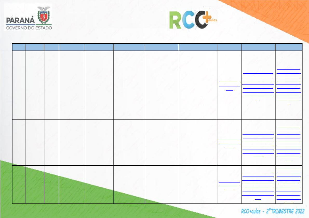 PLANO DE AULA – RCO – 2022 – ENSINO MÉDIO EDUCAÇÃO FÍSICA – 1ªSÉRIE – 2º TRIMESTRE N° DA AULA CONTEÚDO AREA COMPONENTE OBJETO DE CONHECIMENTO OBJETIVO DE APRENDIZAGEM HABILIDADE DA ÁREA COMPETENCIA DA ÁREA VÍDEOAULA SLIDES ENCAMINHAMENTOS EXERCÍCIOS 1005 Conceito de lazer e sua relação com as práticas corporais LGG Ed. Física Práticas corporais de aventura, lazer e sociedade. (Re)conhecer o conceito de lazer e esporte nos contextos locais e intervir pela garantia do direito ao lazer ativo e à prática de cultura corporal. (EM13LGG305) Mapear e criar, por meio de práticas de linguagem, possibilidades de atuação social, política, artística e cultural para enfrentar desafios contemporâneos, discutindo princípios e objetivos dessa atuação de maneira crítica, criativa, solidária e ética. 3. Utilizar diferentes linguagens (artísticas, corporais e verbais) para exercer, com autonomia e colaboração, protagonismo e autoria na vida pessoal e coletiva, de forma crítica, criativa, ética e solidária, defendendo pontos de vista que respeitem o outro e promovam os Direitos Humanos, a consciência socioambiental e o consumo responsável, em âmbito local, regional e global. https://rebrand .ly/2022rco2tri 0515 https://docs.google.c om/presentation/d/1u _anpfpu1fsa0jOiIMtx 4Ag_Xl606hSx/edit?u sp=sharing&ouid=10 42878742756477090 62&rtpof=true&sd=tru e https://docs.goo gle.com/docume nt/d/10V1vrL_aS avBs5iV7SQztu mJbSTxJxLM/ed it?usp=sharing& ouid=104287874 275647709062& rtpof=true&sd=tr ue 1006 Atividade física e exercício físico LGG Ed. Física Ginásticas, vida de qualidade e saúde. Diferenciar atividade física de exercício físico. Experimentar diferentes ginásticas de condicionamento físico. (EM13LGG503) Vivenciar práticas corporais e significá- las em seu projeto de vida, como forma de autoconhecimento, autocuidado com o corpo e com a saúde, socialização e entretenimento. 5. Compreender os processos de produção e negociação de sentidos nas práticas corporais, reconhecendo-as e vivenciando-as como formas de expressão de valores e identidades, em uma perspectiva democrática e de respeito à diversidade. https://rebrand .ly/2022rco2tri 0516 https://docs.google.c om/presentation/d/1n giqManr1C_8AI7fVY C0WSfITEpgEQPV/e dit?usp=sharing&oui d=104287874275647 709062&rtpof=true&s d=true https://docs.goo gle.com/docume nt/d/1Zd8KFfQT 3JmPuo0SSQG urlCcOcz7HCl7/ edit?usp=sharin g&ouid=1042878 7427564770906 2&rtpof=true&sd =true 1007 Ginástica de condiciona mento físico: alongamen tos LGG Ed. Física Ginásticas, vida de qualidade e saúde. Experimentar diferentes ginásticas de condicionamento físico. (EM13LGG503) Vivenciar práticas corporais e significá- las em seu projeto de vida, como forma de autoconhecimento, autocuidado com o corpo e com a saúde, socialização e entretenimento. 5. Compreender os processos de produção e negociação de sentidos nas práticas corporais, reconhecendo-as e vivenciando-as como formas de expressão de valores e identidades, em uma perspectiva https://rebrand .ly/2022rco2tri 0517 https://docs.google.c om/presentation/d/1p uLunvJhNVWmbX5Q gDlzmr1wZJ3ltl09/edi t?usp=sharing&ouid= 10428787427564770 9062&rtpof=true&sd= true https://docs.goo gle.com/docume nt/d/1e4ohLzR4f xgVkua_7MNkb RykU9qNX1- z/edit?usp=shari ng&ouid=104287 8742756477090 62&rtpof=true&s d=true https://rebrand.ly/2022rco2tri0515 https://rebrand.ly/2022rco2tri0515 https://rebrand.ly/2022rco2tri0515 https://docs.google.com/presentation/d/1u_anpfpu1fsa0jOiIMtx4Ag_Xl606hSx/edit?usp=sharing&ouid=104287874275647709062&rtpof=true&sd=true https://docs.google.com/presentation/d/1u_anpfpu1fsa0jOiIMtx4Ag_Xl606hSx/edit?usp=sharing&ouid=104287874275647709062&rtpof=true&sd=true https://docs.google.com/presentation/d/1u_anpfpu1fsa0jOiIMtx4Ag_Xl606hSx/edit?usp=sharing&ouid=104287874275647709062&rtpof=true&sd=true https://docs.google.com/presentation/d/1u_anpfpu1fsa0jOiIMtx4Ag_Xl606hSx/edit?usp=sharing&ouid=104287874275647709062&rtpof=true&sd=true https://docs.google.com/presentation/d/1u_anpfpu1fsa0jOiIMtx4Ag_Xl606hSx/edit?usp=sharing&ouid=104287874275647709062&rtpof=true&sd=true https://docs.google.com/presentation/d/1u_anpfpu1fsa0jOiIMtx4Ag_Xl606hSx/edit?usp=sharing&ouid=104287874275647709062&rtpof=true&sd=true https://docs.google.com/presentation/d/1u_anpfpu1fsa0jOiIMtx4Ag_Xl606hSx/edit?usp=sharing&ouid=104287874275647709062&rtpof=true&sd=true https://docs.google.com/presentation/d/1u_anpfpu1fsa0jOiIMtx4Ag_Xl606hSx/edit?usp=sharing&ouid=104287874275647709062&rtpof=true&sd=true https://docs.google.com/document/d/10V1vrL_aSavBs5iV7SQztumJbSTxJxLM/edit?usp=sharing&ouid=104287874275647709062&rtpof=true&sd=true https://docs.google.com/document/d/10V1vrL_aSavBs5iV7SQztumJbSTxJxLM/edit?usp=sharing&ouid=104287874275647709062&rtpof=true&sd=true https://docs.google.com/document/d/10V1vrL_aSavBs5iV7SQztumJbSTxJxLM/edit?usp=sharing&ouid=104287874275647709062&rtpof=true&sd=true https://docs.google.com/document/d/10V1vrL_aSavBs5iV7SQztumJbSTxJxLM/edit?usp=sharing&ouid=104287874275647709062&rtpof=true&sd=true https://docs.google.com/document/d/10V1vrL_aSavBs5iV7SQztumJbSTxJxLM/edit?usp=sharing&ouid=104287874275647709062&rtpof=true&sd=true https://docs.google.com/document/d/10V1vrL_aSavBs5iV7SQztumJbSTxJxLM/edit?usp=sharing&ouid=104287874275647709062&rtpof=true&sd=true https://docs.google.com/document/d/10V1vrL_aSavBs5iV7SQztumJbSTxJxLM/edit?usp=sharing&ouid=104287874275647709062&rtpof=true&sd=true https://docs.google.com/document/d/10V1vrL_aSavBs5iV7SQztumJbSTxJxLM/edit?usp=sharing&ouid=104287874275647709062&rtpof=true&sd=true https://docs.google.com/document/d/10V1vrL_aSavBs5iV7SQztumJbSTxJxLM/edit?usp=sharing&ouid=104287874275647709062&rtpof=true&sd=true https://docs.google.com/document/d/10V1vrL_aSavBs5iV7SQztumJbSTxJxLM/edit?usp=sharing&ouid=104287874275647709062&rtpof=true&sd=true https://rebrand.ly/2022rco2tri0516 https://rebrand.ly/2022rco2tri0516 https://rebra