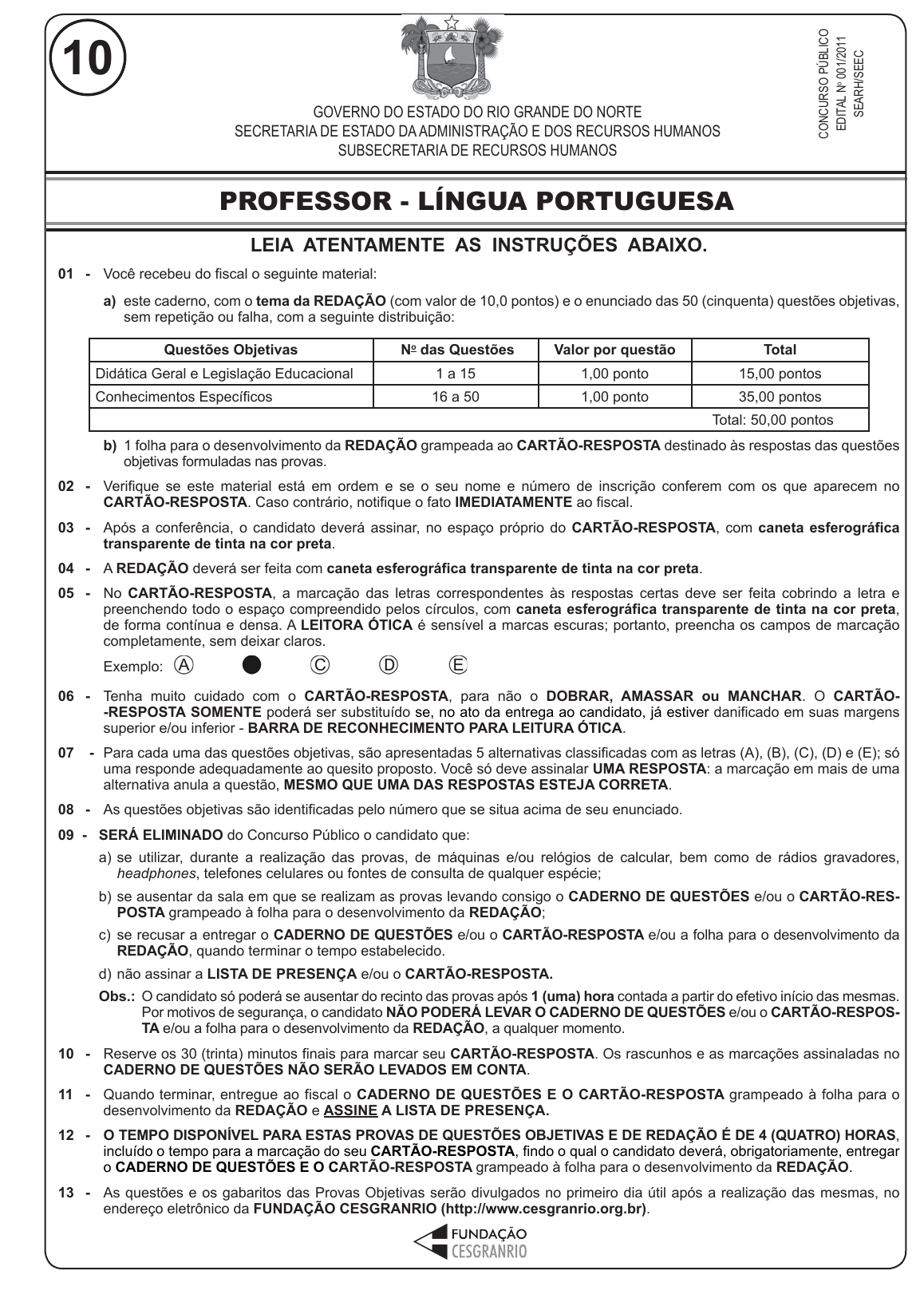 pcimarkpci MDAwMDowMDAwOjAwMDA6MDAwMDowMDAwOmZmZmY6MmQ0Njo2Y2Ux:VGh1LCAwMiBNYXIgMjAyMyAxNDoyODozNSAtMDMwMA== www.pciconcursos.com.br PROFESSOR - LÍNGUA PORTUGUESA 1 GOVERNO DO ESTADO DO RIO GRANDE DO NORTE SECRETARIA DE ESTADO DA ADMINISTRAÇÃO E DOS RECURSOS HUMANOS SUBSECRETARIA DE RECURSOS HUMANOS 10 CO NC UR SO P ÚB LIC O ED ITA L N o 0 01 /20 11 SE AR H/ SE EC PROFESSOR - LÍNGUA PORTUGUESA LEIA ATENTAMENTE AS INSTRUÇÕES ABAIXO. 01 - Você recebeu do fiscal o seguinte material: a) este caderno, com o tema da REDAÇÃO (com valor de 10,0 pontos) e o enunciado das 50 (cinquenta) questões objetivas, sem repetição ou falha, com a seguinte distribuição: Questões Objetivas No das Questões Valor por questão Total Didática Geral e Legislação Educacional 1 a 15 1,00 ponto 15,00 pontos Conhecimentos Específicos 16 a 50 1,00 ponto 35,00 pontos Total: 50,00 pontos b) 1 folha para o desenvolvimento da REDAÇÃO grampeada ao CARTÃO-RESPOSTA destinado às respostas das questões objetivas formuladas nas provas. 02 - Verifique se este material está em ordem e se o seu nome e número de inscrição conferem com os que aparecem no CARTÃO-RESPOSTA. Caso contrário, notifique o fato IMEDIATAMENTE ao fiscal. 03 - Após a conferência, o candidato deverá assinar, no espaço próprio do CARTÃO-RESPOSTA, com caneta esferográfica transparente de tinta na cor preta. 04 - A REDAÇÃO deverá ser feita com caneta esferográfica transparente de tinta na cor preta. 05 - No CARTÃO-RESPOSTA, a marcação das letras correspondentes às respostas certas deve ser feita cobrindo a letra e preenchendo todo o espaço compreendido pelos círculos, com caneta esferográfica transparente de tinta na cor preta, de forma contínua e densa. A LEITORA ÓTICA é sensível a marcas escuras; portanto, preencha os campos de marcação completamente, sem deixar claros. Exemplo: 06 - Tenha muito cuidado com o CARTÃO-RESPOSTA, para não o DOBRAR, AMASSAR ou MANCHAR. O CARTÃO- -RESPOSTA SOMENTE poderá ser substituído se, no ato da entrega ao candidato, já estiver danificado em suas margens superior e/ou inferior - BARRA DE RECONHECIMENTO PARA LEITURA ÓTICA. 07 - Para cada uma das questões objetivas, são apresentadas 5 alternativas classificadas com as letras (A), (B), (C), (D) e (E); só uma responde adequadamente ao quesito proposto. Você só deve assinalar UMA RESPOSTA: a marcação em mais de uma alternativa anula a questão, MESMO QUE UMA DAS RESPOSTAS ESTEJA CORRETA. 08 - As questões objetivas são identificadas pelo número que se situa acima de seu enunciado. 09 - SERÁ ELIMINADO do Concurso Público o candidato que: a) se utilizar, durante a realização das provas, de máquinas e/ou relógios de calcular, bem como de rádios gravadores, headphones, telefones celulares ou fontes de consulta de qualquer espécie; b) se ausentar da sala em que se realizam as provas levando consigo o CADERNO DE QUESTÕES e/ou o CARTÃO-RES- POSTA grampeado à folha para o desenvolvimento da REDAÇÃO; c) se recusar a entregar o CADERNO DE QUESTÕES e/ou o CARTÃO-RESPOSTA e/ou a folha para o desenvolvimento da REDAÇÃO, quando terminar o tempo estabelecido. d) não assinar a LISTA DE PRESENÇA e/ou o CARTÃO-RESPOSTA. Obs.: O candidato só poderá se ausentar do recinto das provas após 1 (uma) hora contada a partir do efetivo início das mesmas. Por motivos de segurança, o candidato NÃO PODERÁ LEVAR O CADERNO DE QUESTÕES e/ou o CARTÃO-RESPOS- TA e/ou a folha para o desenvolvimento da REDAÇÃO, a qualquer momento. 10 - Reserve os 30 (trinta) minutos finais para marcar seu CARTÃO-RESPOSTA. Os rascunhos e as marcações assinaladas no CADERNO DE QUESTÕES NÃO SERÃO LEVADOS EM CONTA. 11 - Quando terminar, entregue ao fiscal o CADERNO DE QUESTÕES E O CARTÃO-RESPOSTA grampeado à folha para o desenvolvimento da REDAÇÃO e ASSINE A LISTA DE PRESENÇA. 12 - O TEMPO DISPONÍVEL PARA ESTAS PROVAS DE QUESTÕES OBJETIVAS E DE REDAÇÃO É DE 4 (QUATRO) HORAS, incluído o tempo para a marcação do seu CARTÃO-RESPOSTA, findo o qual o candidato deverá, obrigatoriamente, entregar o CADERNO DE QUESTÕES E O CARTÃO-RESPOSTA grampeado à folha para o desenvolvimento da REDAÇÃO. 13 - As questões e os gabaritos das Provas Objetivas serão divulgados no primeiro dia útil após a realização das mesmas, no endereço eletrônico da FUNDAÇÃO CESGRANRIO (http://www.cesgranrio.org.br). pcimarkpci MDAwMDowMDAwOjAwMDA6MDAwMDowMDAwOmZmZmY6MmQ0Njo2Y2Ux:VGh1LCAwMiBNYXIgMjAyMyAxNDoyODozNSAtMDMwMA== www.pciconcursos.com.br PROFESSOR - LÍNGUA PORTUGUESA 2 RA SC UN HO ______________________________________________________________________________________________ ______________________________________________________________________________________________ ______________________________________________________________________________________________ ______________________________________________________________________________________________ ______________________________________________________________________________________________ ______________________________________________________________________________________________ ______________________________________________________________________________________________ ______________________________________________________________________________________________ ______________________________________________________________________________________________ ______________________________________________________________________________________________ ______________________________________________________________________________________________ ______________________________________________________________________________________________ ______________________________________________________________________________________________ ______________________________________________________________________________________________ ___________________________________________________